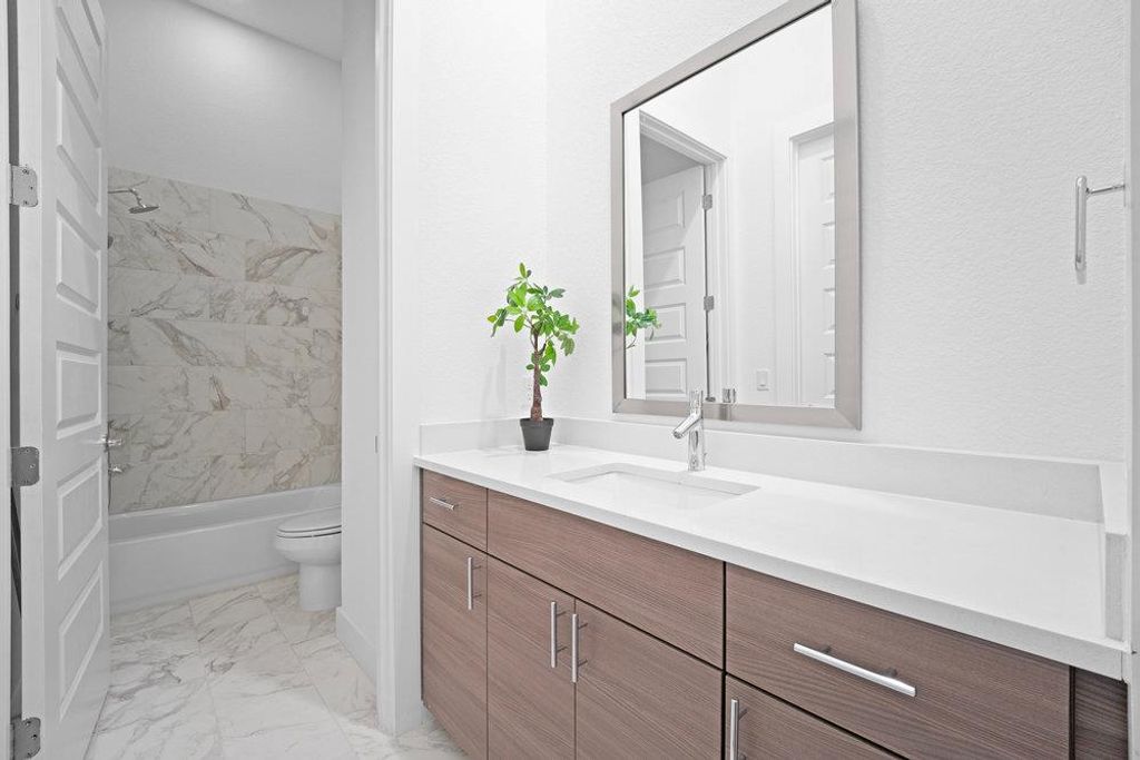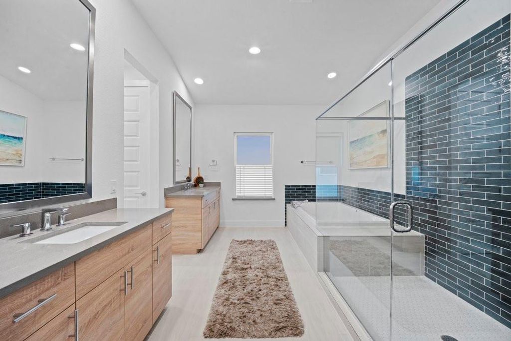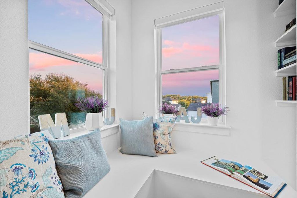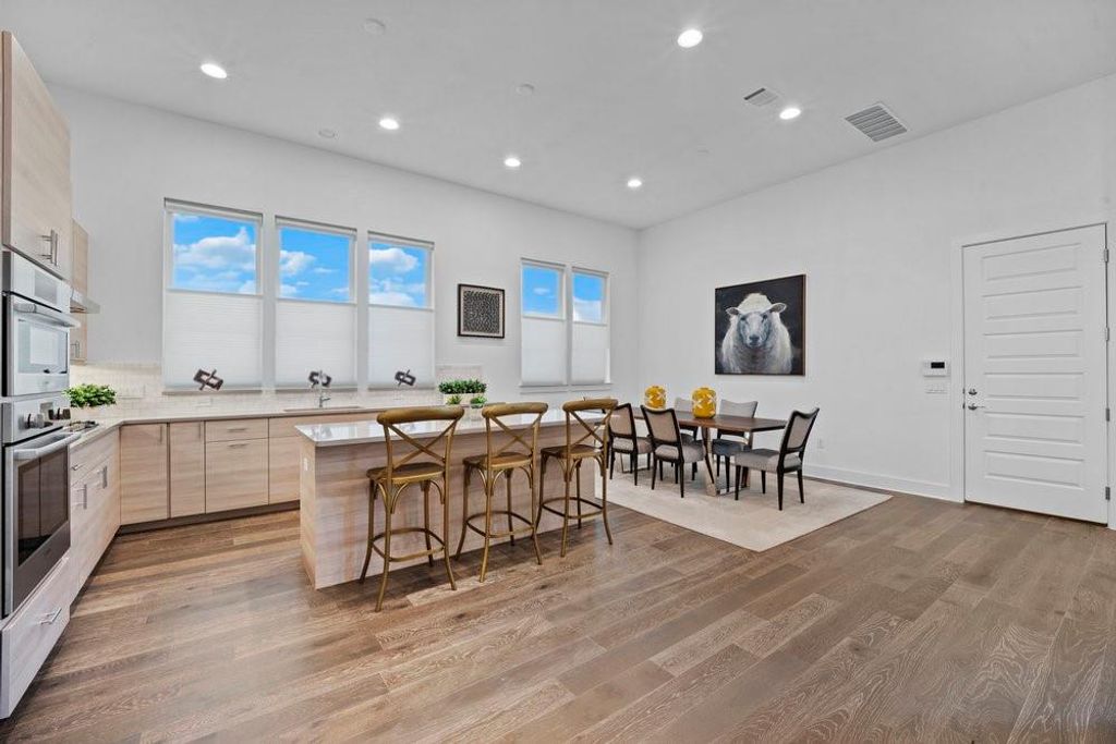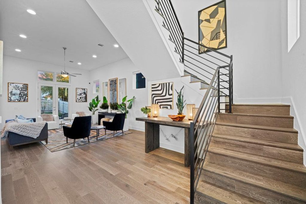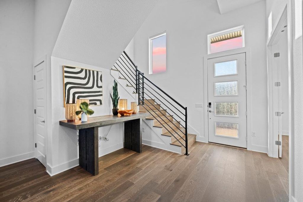 Year End Promo - 3% of sales price can be used as flex cash (rate buy down, closing costs and/or refrig. & washer/dryer. PICTURESQUE MODERN ARCHITECTURE, LARGE DECK WITH DOWNTOWN VIEWS! New construction w/warranty. Home is built by Intown Homes & located in the fantastic Agave community mins from DT and Mueller. First floor has a light filled entry w/vaulted ceilings, a grand staircase, 1 bedroom w/full bath, a great room w/12 ft ceilings, large windows, a chef's kitchen featuring Bosch appliances, quartz counters, large island, contemporary soft close cabinetry & breakfast bar for seating, dining room & living room w/French doors leading out to a small yard. Warm inviting colors throughout the home. The bedroom on the first floor can also be used as an office. On the second level you'll find a large primary suite, including a sitting area with a built-in bench and bookshelves. The primary bath leads into a huge closet, connected to the laundry room for convenience. The luxurious primary bathroom has separate vanities, large walk-in shower & an elegant free-standing tub. Each shower includes showerheads & hand-held sprayers. Two other bedrooms upstairs w/ a shared bathroom. The jewel of this home is a gameroom with a deck overlooking the community, greenbelt, & view of DT. Enjoy fantastic sunsets from your deck with a glass of wine in the evening, or a cup of coffee or tea first thing in the morning. Many people put string lights on their decks & this street feels very neighborly. There's a small yard w/trees. This home sits up high for the views but there's a flat entry from the garage in the rear of the home. High-end plumbing fixtures, wood floors throughout, soft close cabinetry, 8 ft doors, energy efficient, tankless water heater, full security system, 2 car garage & new window coverings included. Low taxes and HOA fee. Intown Homes is a trusted Texas home builder since 1980, building exceptional communities throughout Austin, Houston, and Dallas/Fort Worth.
