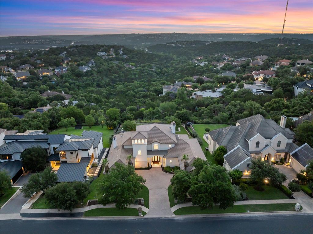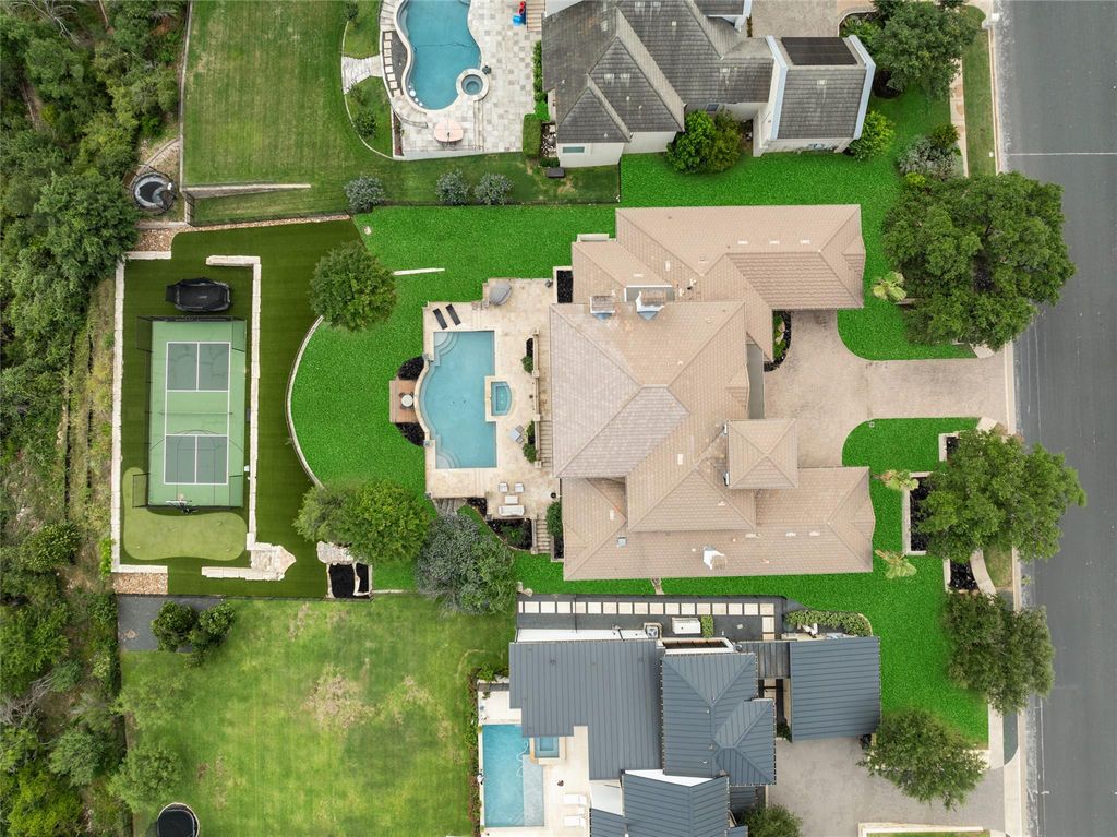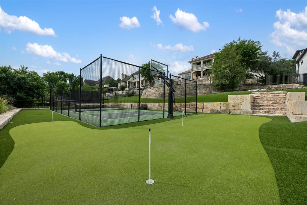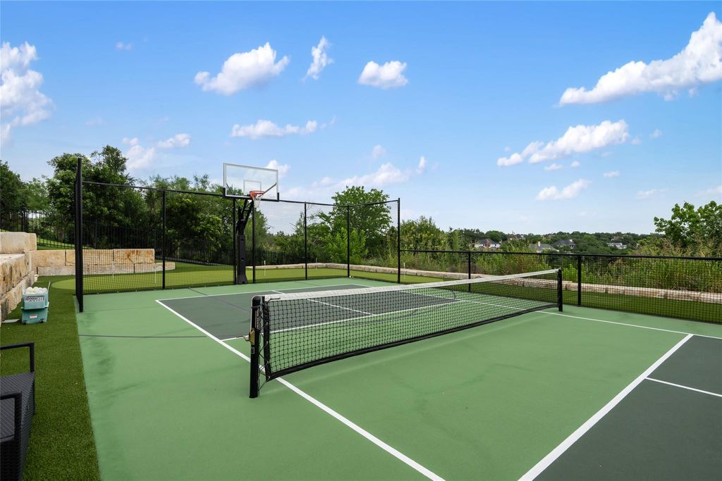 Mediterranean style home on 1.1 acres in Davenport Ranch. Home is packed with leisure amenities such as a pool and hot tub, pickleball sports court with basketball hoop, putting green, and large trampoline. Inside, the expansive open concept home has 3 living areas: family by the kitchen, formal in the heart of the home, and game room upstairs with wet bar. The primary and secondary bedroom are conveniently located on the main level of the home with two additional bedrooms upstairs. Every room has their own private full bathroom. 2 half baths are located in the main areas for ease of use. Elegant outdoor entertaining area with kitchen and full stone fire place looks towards rolling hills and stunning sunsets. Highly sough after Eanes ISD for best rated schools in the area. The home epitomizes location, luxury, and leisure in this unforgettable offering.