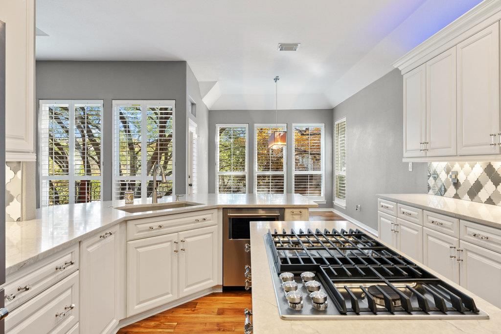 Tucked away at the end of a quiet cul-de-sac, this custom home sits on one of the larger, more private cul-de-sac lots in Steiner Ranch, offering a rare combination of space, privacy, views, and everyday convenience. The home is intentionally designed to place the main living areas where you spend the most time"”elevated among the trees"”creating peaceful treetop and greenbelt views from the kitchen, living, and entertaining spaces. Updated windows enhance natural light and frame the surrounding canopy, giving the home a calm, private feel with visual separation from the street. Built and owned by the original owner, the home has been thoughtfully and substantially upgraded over time. The kitchen and primary bath have been fully remodeled, reflecting quality craftsmanship and timeless design. Additional improvements include updated windows, a large deck ideal for entertaining or quiet mornings, and meaningful system (Roof - 2025, AC Units - 2019 & 2023, Water Heaters - 2022) and cosmetic updates throughout. The oversized lot delivers true breathing room, anchored by mature trees and a tranquil pond feature, enhancing privacy and creating a peaceful outdoor setting with flexibility for future use. Equally compelling is the location. Positioned toward the front of Steiner Ranch, the home allows for quick in-and-out access for commuting and the rare ability to walk to top-rated schools, the community center, pools, parks, and nearby dining and retail. Steiner Ranch is known for its award-winning schools, miles of hike-and-bike trails, multiple resort-style pools, tennis, pickleball and basketball courts, and access to Lake Austin with Lake Travis just accross the street. This home delivers what today's buyers value most: privacy, views, upgrades, and location"”done right.