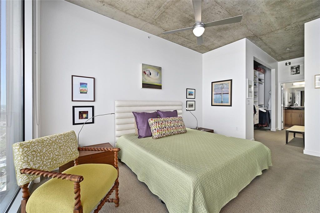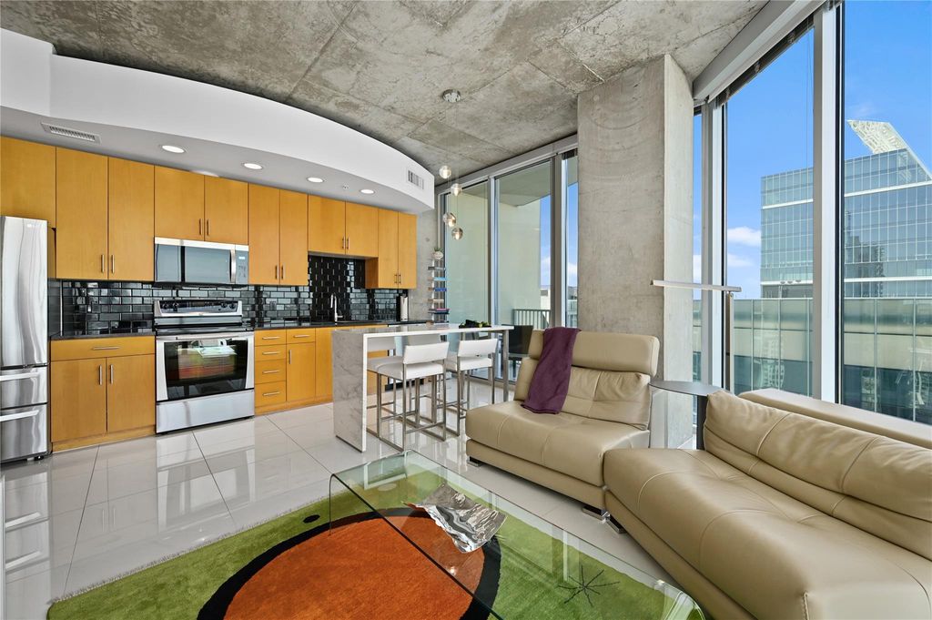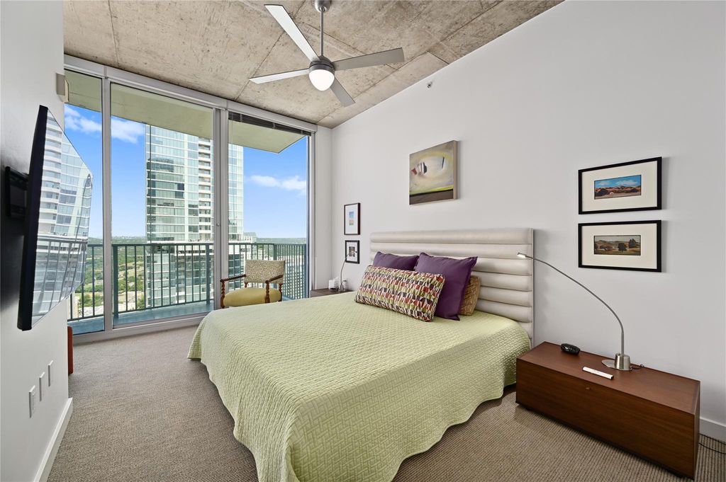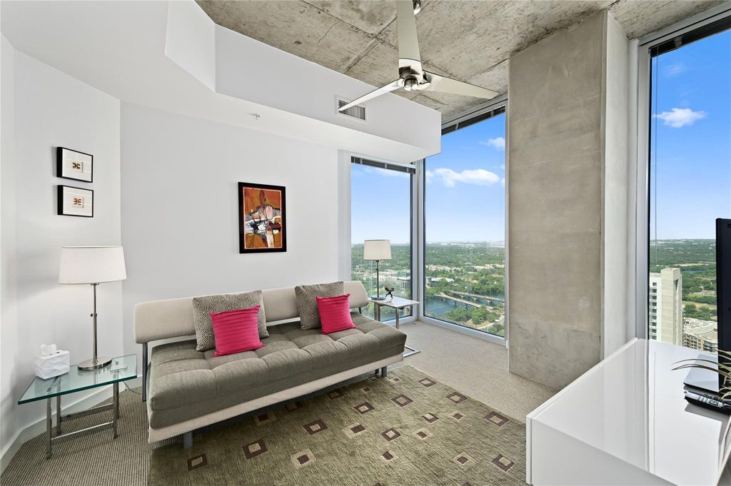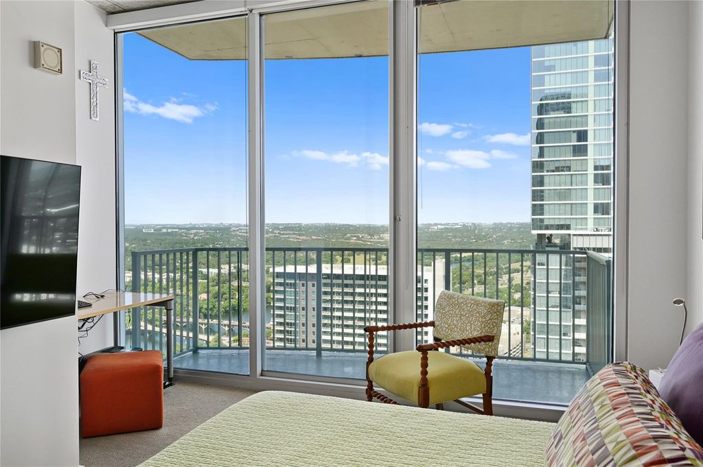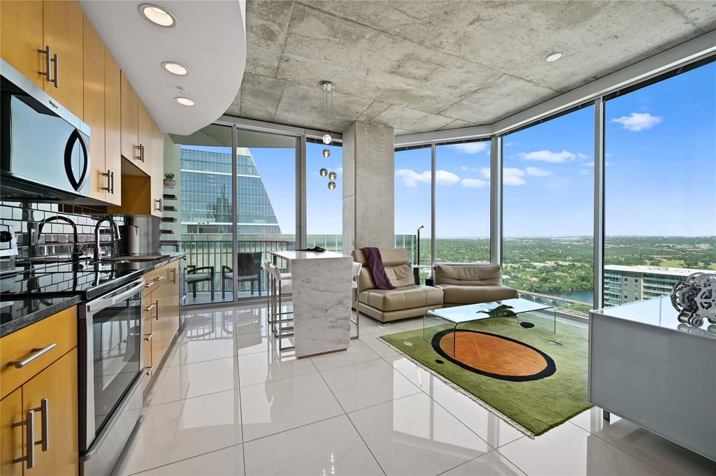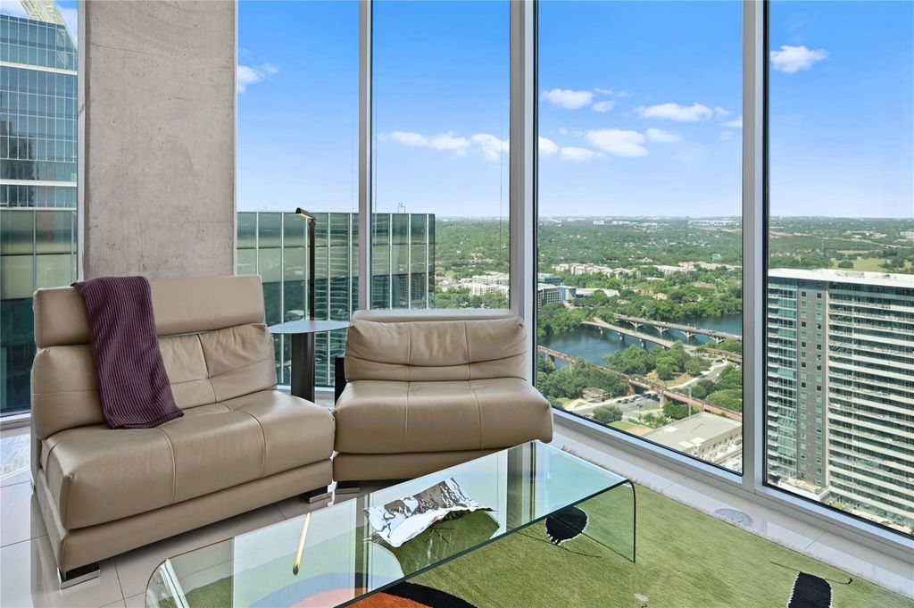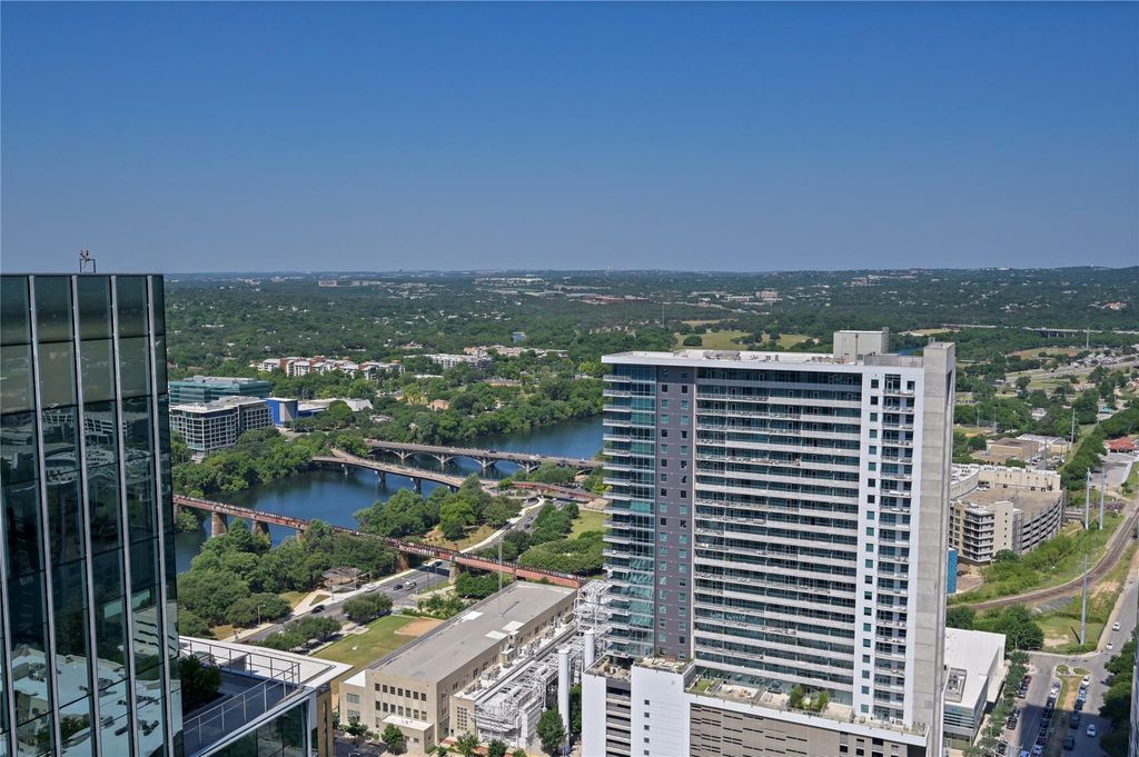 Enjoy this fabulous corner unit on the 36th floor with floor to ceiling windows providing amazing views of Lady Bird Lake, Barton Springs Pool, hike and bike trail and of downtown Austin. The two bedroom, two bath condo has been impeccably maintained and upgraded with 20" x 20" ceramic floor tile and commercial grade Tandus Centiva wool carpet. Added padding under both to help ensure comfort while adding noise reduction for occupants below. All interior doors replaced with solid doors and finished with white plastic laminate and new hardware. Sliding glass door added to primary bedroom to allow light in but partially frosted to maintain privacy. Primary bathroom updated with upgraded lamps, frameless glass shower door and pull bar accessibility. Large primary closet with thoughtful storage to maximize space. New stackable washer/dryer to convey. Light and bright open kitchen/living space. You will find upgraded stainless steel dishwasher, microwave and refrigerator in kitchen with plenty of storage and a gorgeous marble kitchen island with ample seating for four. A custom floor to ceiling wine rack added with purposeful lighting. Remote controlled, motorized shades in the living room to reduce afternoon sun from heating up living space. Amazing high ceilings in all rooms for maximum openness. New light fixtures in all rooms and Elfa shelving added in closets. Enjoy the views from two balconies - one located off the kitchen and the other off the primary bedroom. Two designated parking spaces, #490 and 491 on the coveted third floor of parking garage. Condo amenities include 24/7 concierge services, fitness center, pool, grills and outdoor cooking areas, media room, owners lounge with full kitchen and a pet area located on the 4th floor garage level. This downtown location is super walkable to Hike and Bike trail, Trader Joe's, Whole Foods, Central Library, restaurants and shopping. Don't miss out on this condo with all it has to offer.