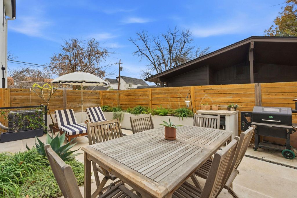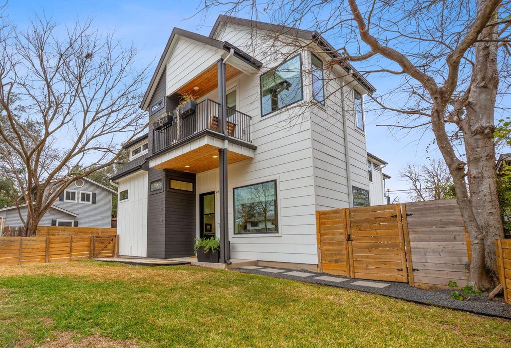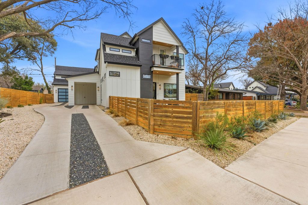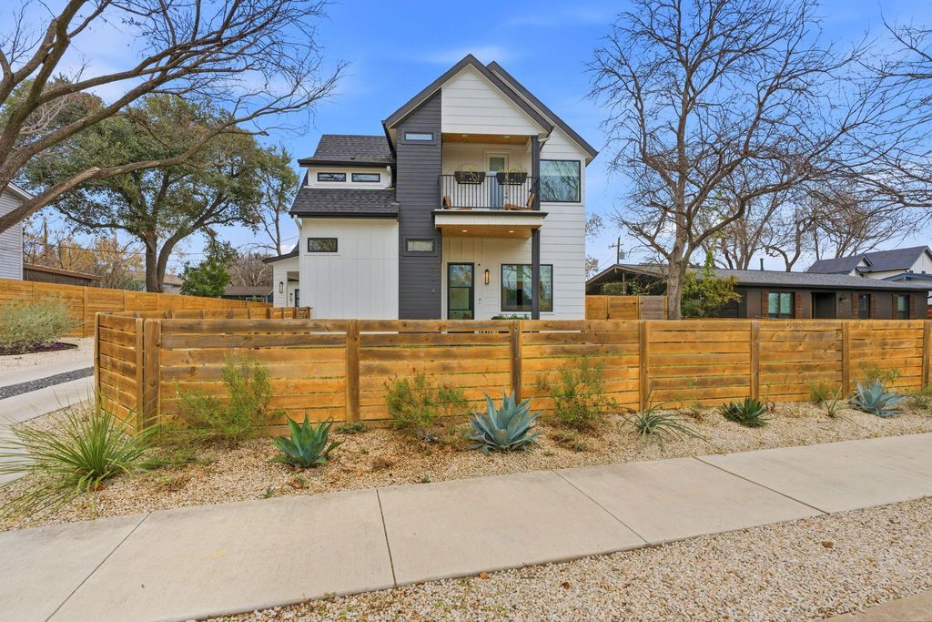 Beautifully designed modern home in a prime Central Austin location. This thoughtfully planned home offers a flexible layout with one bedroom on the main level and two upstairs, ideal for a home office or guest suite. The spacious primary suite features vaulted ceilings and a spa-like bathroom with a glass-enclosed shower, floor-to-ceiling tile, matte black trough sink, and backlit mirrors. Enjoy the private balcony and custom primary closet organization. Additional upstairs bedroom includes an en-suite bathroom, while the remaining bedroom is conveniently located near a full bath. Unique, high-end finishes are found throughout, including wood flooring, quartz countertops, custom Roman shades, custom flat-panel cabinetry, premium stainless steel appliances, elevated bathroom finishes, and fresh exterior paint. The side patio has been enhanced by Collectivo Creative with professionally designed planter boxes and irrigation, creating an inviting and private outdoor living space. The fully-fenced front yard is perfect for pets and the carport offers EV charging, is pre-wired for a garage door, and includes additional storage.