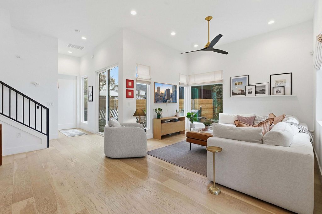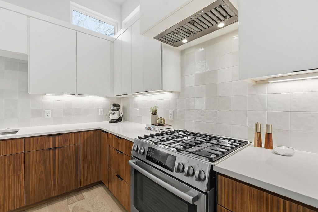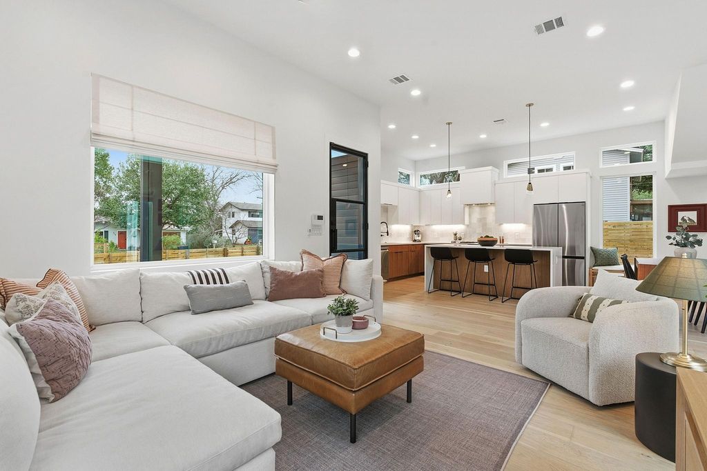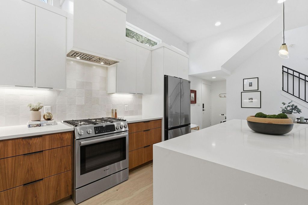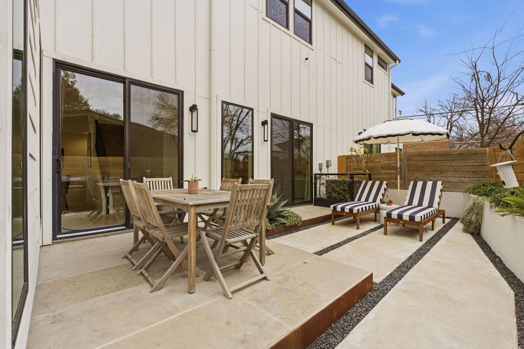 Beautifully designed modern home in a prime Central Austin location. This thoughtfully planned home offers a flexible layout with one bedroom on the main level and two upstairs, ideal for a home office or guest suite. The spacious primary suite features vaulted ceilings and a spa-like bathroom with a glass-enclosed shower, floor-to-ceiling tile, matte black trough sink, and backlit mirrors. Enjoy the private balcony and custom primary closet organization. Additional upstairs bedroom includes an en-suite bathroom, while the remaining bedroom is conveniently located near a full bath. Unique, high-end finishes are found throughout, including wood flooring, quartz countertops, custom Roman shades, custom flat-panel cabinetry, premium stainless steel appliances, elevated bathroom finishes, and fresh exterior paint. The side patio has been enhanced by Collectivo Creative with professionally designed planter boxes and irrigation, creating an inviting and private outdoor living space. The fully-fenced front yard is perfect for pets and the carport offers EV charging, is pre-wired for a garage door, and includes additional storage.