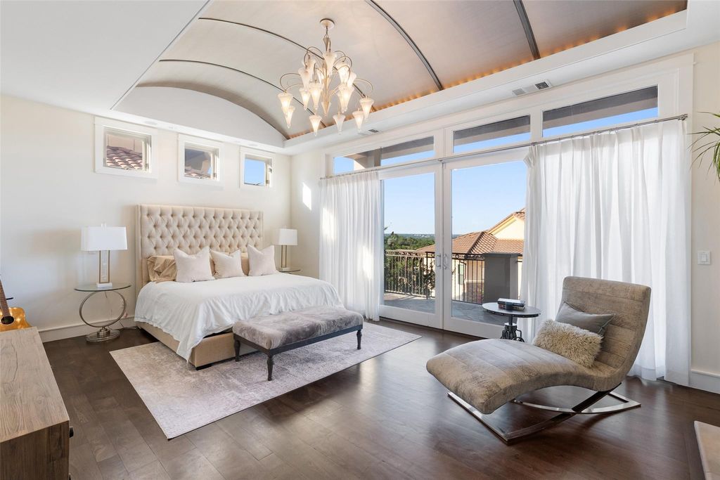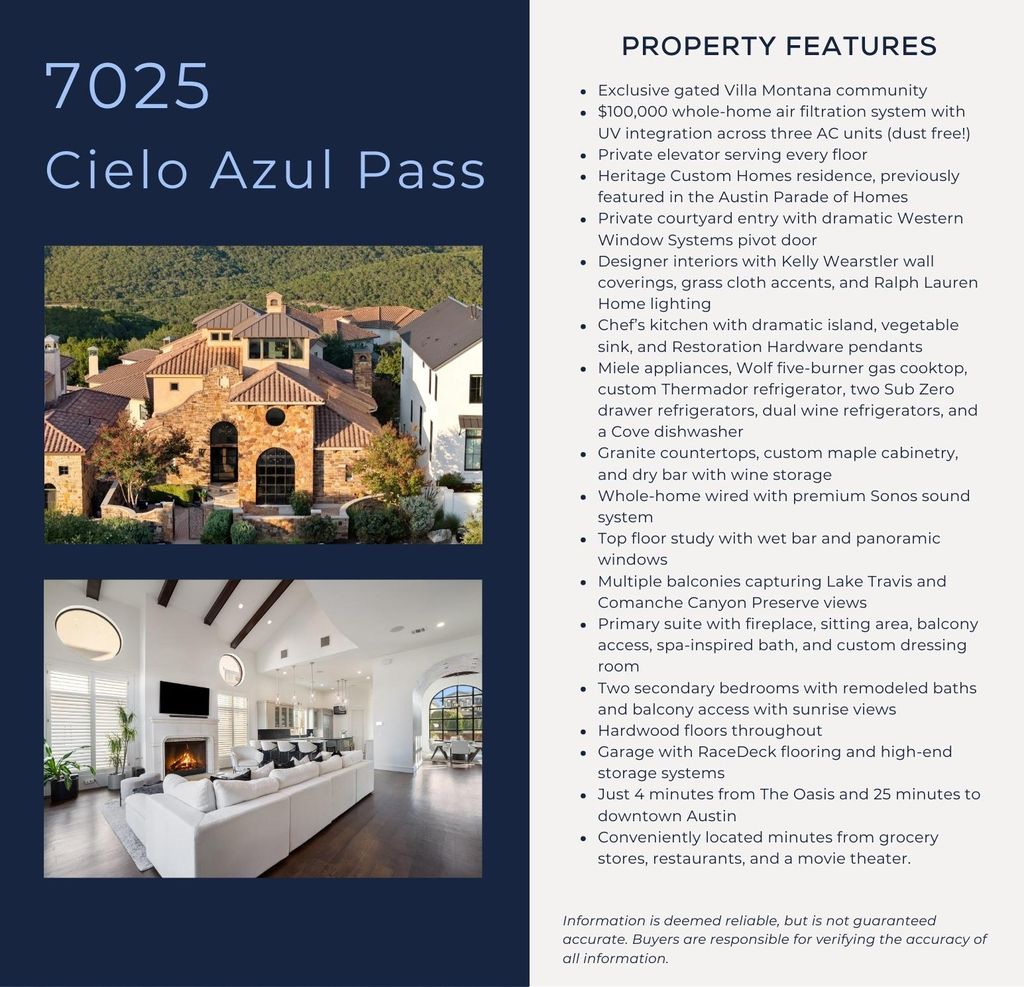 Nestled within the exclusive gated Villa Montana community, this Heritage Custom Homes residence, previously featured in the Parade of Homes, stands as a testament to architectural pedigree and refined luxury. A private courtyard entry and dramatic Western Window Systems pivot door set the tone for a sophisticated interior where Kelly Wearstler wall coverings, grass cloth accents, and lighting by Ralph Lauren Home elevate the atmosphere. The chef's kitchen is both a showpiece of artistry and a sanctuary for culinary creativity, anchored by a dramatic island with vegetable sink and Restoration Hardware pendants, and framed by Miele appliances, a Wolf five burner gas cooktop, a custom Thermador refrigerator, two Sub Zero drawer refrigerators, dual wine refrigerators, and a Cove dishwasher. Granite countertops, custom maple cabinetry, and a dry bar with wine storage create a seamless blend of elegance and function. The home is fully wired for sound with a premium Sonos system and features a $100,000 whole-home air filtration system with UV integration across three AC units, ensuring an environment of high-end comfort and unparalleled purity. At the pinnacle, you'll find a top floor study with wet bar framed by panoramic windows, while balconies capture stunning views of Lake Travis and the Comanche Canyon Preserve. The primary suite is a retreat of its own, complete with a fireplace, sitting area, balcony access, spa inspired bath, and custom dressing room. Two secondary bedrooms each enjoy remodeled baths and balcony access with beautiful sunrise views, offering comfort and privacy for family or guests. Your garage showcases RaceDeck flooring and high-end storage systems. Other features include hardwood floors and a private elevator serving every floor! Just four minutes from The Oasis and twenty five minutes to downtown Austin, this luxury residence pairs Hill Country serenity with Lake Travis views, united under one roof by enduring architectural distinction.