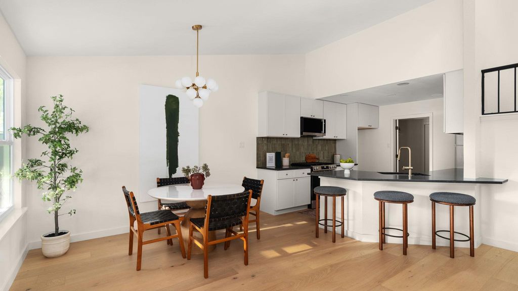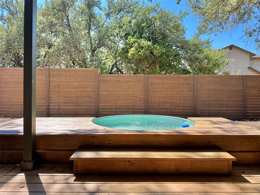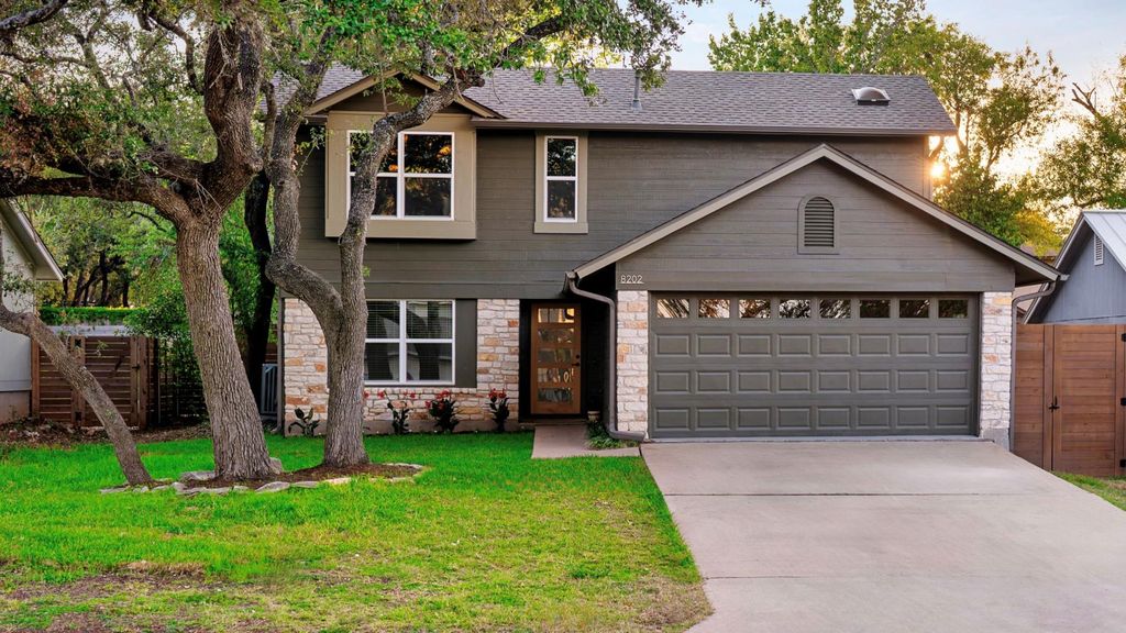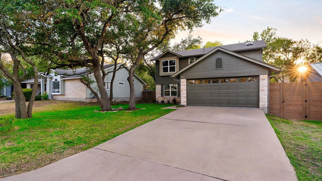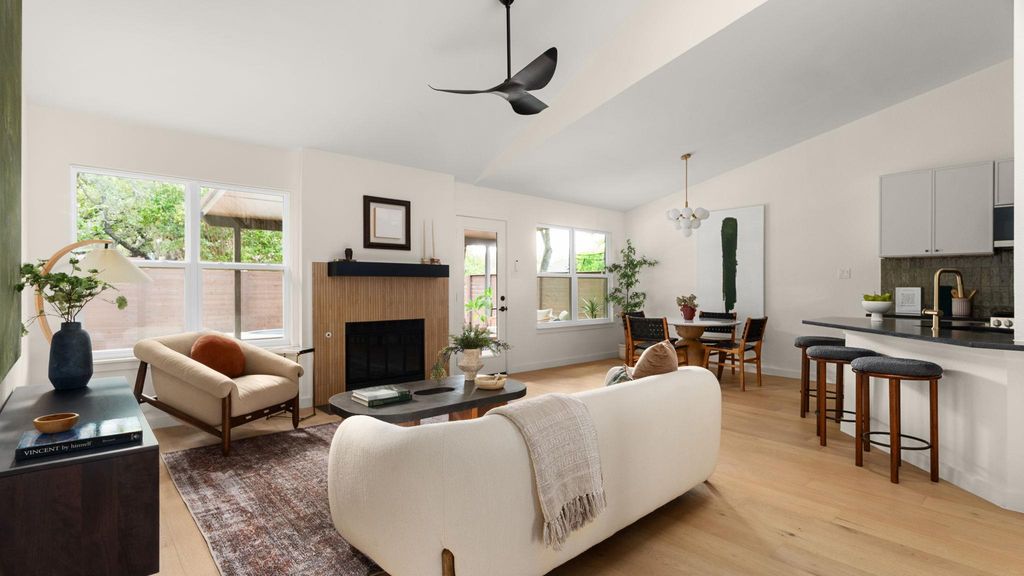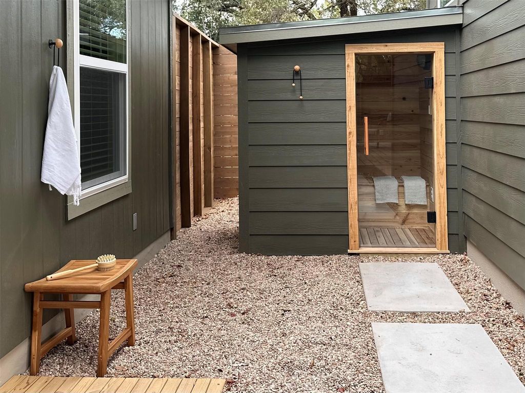 Welcome to this rare custom remodel by Pesoli Properties, featuring a brand new Casita, an outdoor oasis with a Finnish sauna, and a versatile cowboy pool. Upon entry, you are greeted by soaring ceilings with a skylight, a cozy fireplace, and a light filled living area that seamlessly connects to the dining and kitchen space. The kitchen has been tastefully updated with slim shaker cabinets, leathered stone countertops, and sage porcelain tiles, creating an elegant atmosphere. European hardwood flooring throughout the home adds a timeless touch of sophistication. The primary bedroom, with its vaulted ceilings and handcrafted light fixtures, offers a moody color-drenched retreat. The luxe ensuite bathroom boasts dramatic tilework, a deep soaking tub, white oak cabinetry with quartz countertops, hardware sourced from Marocco, and a custom walk-in closet. The large hall bathroom is adorned with handcrafted Spanish floor tiles and complemented by aqua zellige tiles, adding an elegant touch to the space. The property's highlight is the large fenced backyard, featuring a covered porch and a newly constructed 160 SF Casita, perfect as a home office, pool house, or gym. Additionally, the detached Finnish sauna with a private outdoor shower caters to those seeking a healthy lifestyle, and the stock tank pool can be used as a Cold Plunge or Hot Tub with Heater & Chiller System (purchased separately). Significant upgrades include a new architectural 30-year roof, plumbing and electrical systems, energy-efficient windows, blown-in insulation, and more. (See updates & repair list.) Conveniently located in the desirable Maple Run neighborhood, residents enjoy easy access to MoPac, Violet Crown Trails, Whole Foods, Arbor Trail Shopping, dining, and downtown Austin. This property offers the perfect blend of location, comfort, and a healthy lifestyle for its residents.