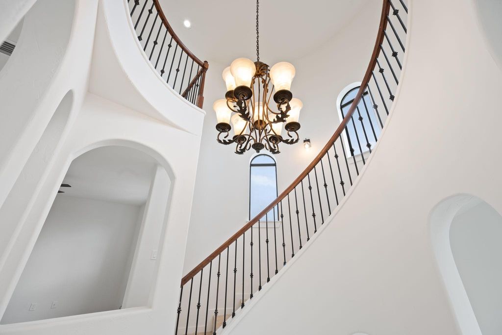 Beautifully designed, this custom three-story Maravilla home blends luxury, comfort, and Hill Country charm just minutes from Lake Travis. A private gated front courtyard with a gorgeous fountain welcomes you inside, setting a peaceful tone before you enter the elegant interior. The dramatic spiral staircase anchors the home and leads to multiple living and dining spaces ideal for entertaining. The primary suite is located downstairs for added privacy and opens to its own secluded courtyard, while all secondary bedrooms are situated upstairs. A stunning third-floor loft offers breathtaking views, creating a perfect retreat for sunset watching, work, or relaxation. High-end details include 8' arched wood doors, an iron entry, custom wall textures, granite countertops, and gas Jenn-Air appliances that elevate the chef's kitchen. The stone fireplace warms the main living area, and the primary bath features a Jacuzzi tub with copper and travertine sinks for a spa-like escape. Set on a quiet cul-de-sac in a clean, friendly neighborhood, the home also provides peace of mind with two recently installed air-conditioning units. A rare opportunity to enjoy refined living in a truly special setting.