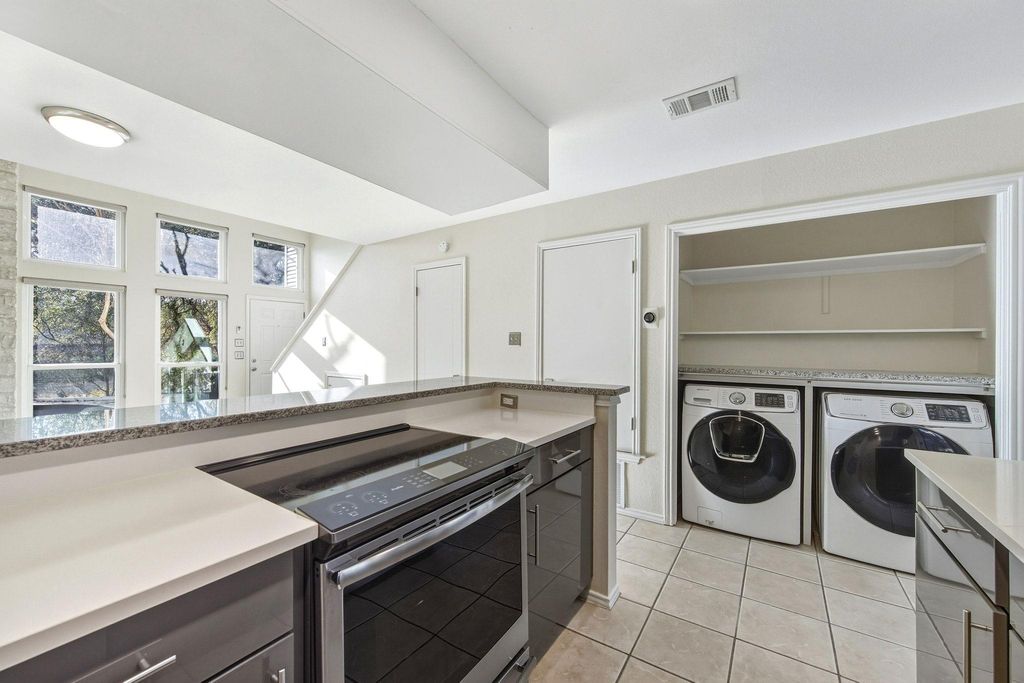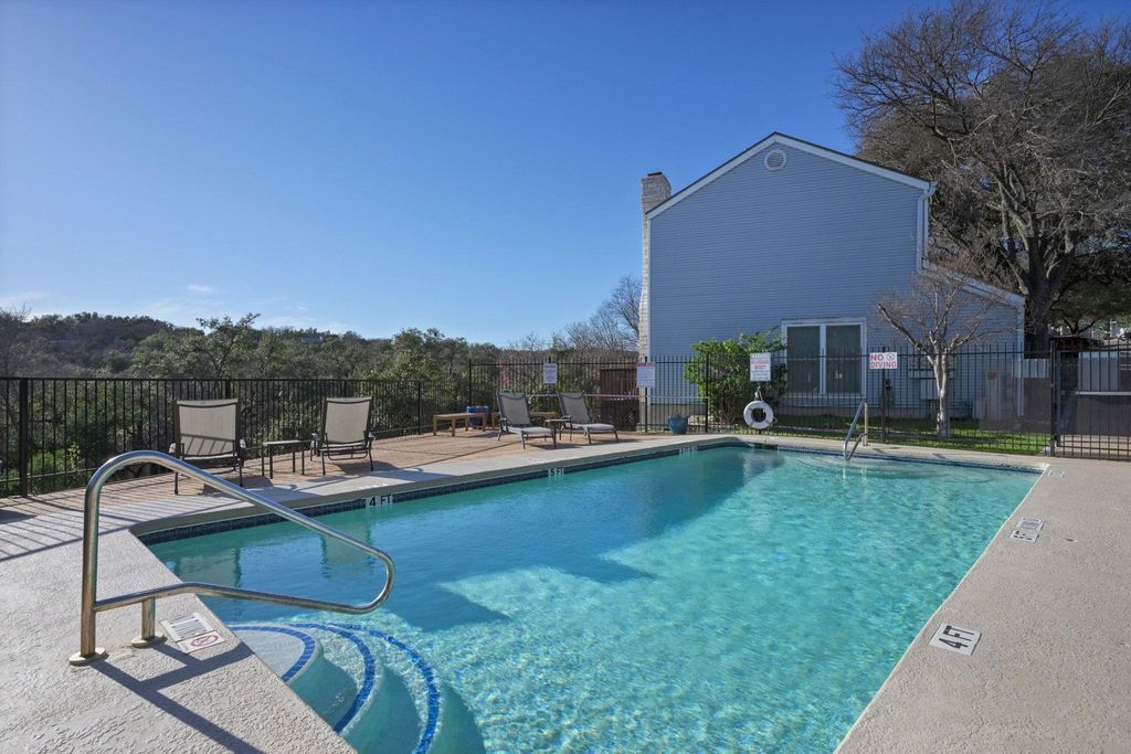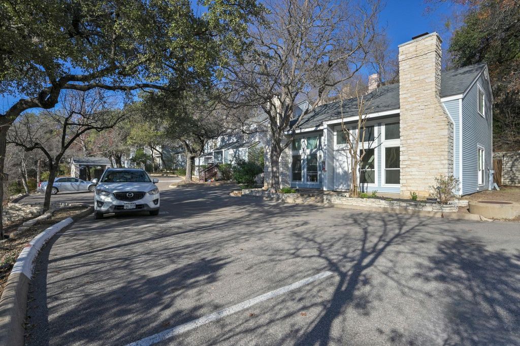 NW Hills/Far West - Move-in-ready living in the Townhomes of Northwest Hills, set on a quiet community street just south of Far West. The location is both peaceful and convenient, with sidewalks for easy neighborhood walks and Far West Village Center less than half a mile away for everyday dining and shopping. Inside, the two-story layout feels open and bright thanks to vaulted ceilings, a dramatic exposed beam, and a loft-style primary suite overlooking the main level. Neutral paint and a blend of vinyl, wood and tile floors create a clean, adaptable backdrop, while the floor-to-ceiling stone fireplace anchors the living space with character. The updated kitchen stands out with custom modern cabinetry, quartz countertops, stainless appliances, recessed lighting, and bar seating that flows naturally into the living area. A powder room and laundry closet complete the main floor. Upstairs, the primary bedroom serves as a quiet retreat with a walk-in closet, in-room vanity, and a full bath. The private patio extends the living space outdoors, enclosed by a stone wall and wood fencing with gated access to the grounds and shaded by mature trees. Residents enjoy a scenic community pool with hill country views. Zoned to close by AISD schools including Doss Elementary, Murchison Middle, and Anderson High. HOA fees cover assigned parking, structural insurance, and exterior and common area maintenance. Capital Metro is nearby, with downtown about 15 minutes away and The Domain and North Austin tech corridor just 10 minutes away. Schedule your showing today!