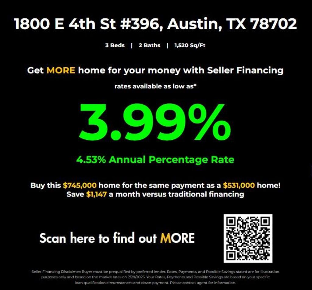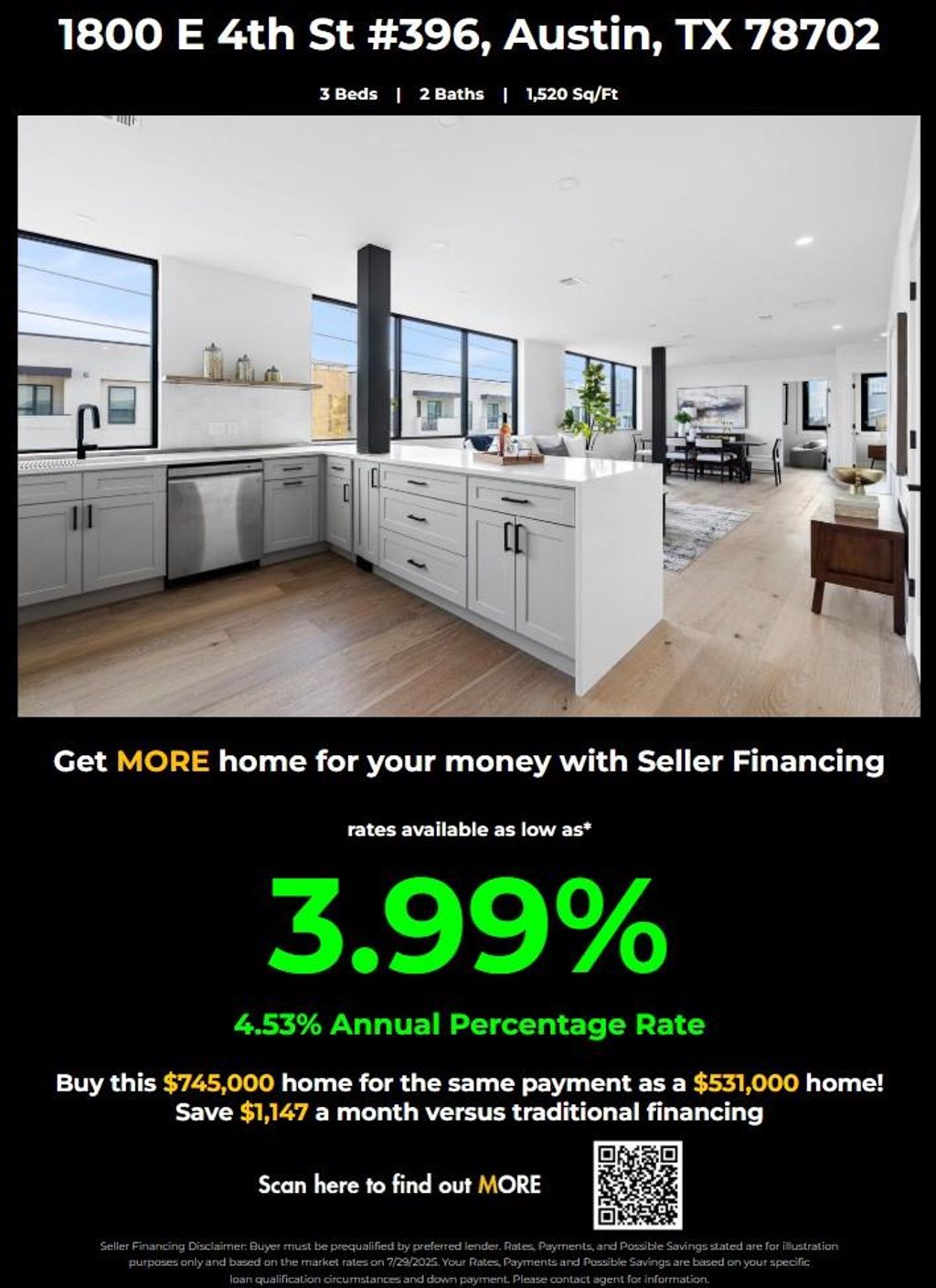 BUILDER CLOSE OUT-Seller Financing available at 3.99%!!! Welcome to the only 3-bedroom residence in this modern East Austin building"”offering a rare combination of space, style, and location. This 3 bed, 2 bath condo lives like a single-family home and features sweeping downtown views. The primary suite includes two closets, and the home comes with two reserved parking spaces, plus the option to purchase an additional spot and storage unit. Community amenities include a pool, fitness center, dog wash, and rentable guest suites. Ideally located just minutes from downtown and steps from some of East Austin's best restaurants, coffee shops, and bars.
