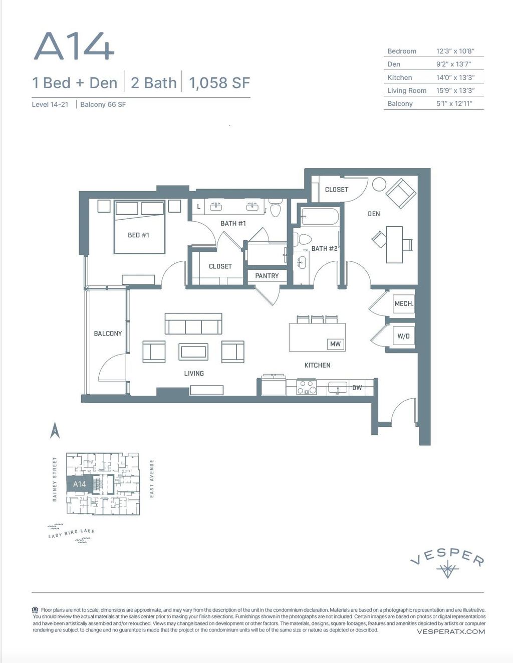 Vesper is a luxury condominium community in downtown Austin, offering design-forward residences with high-end finishes and exceptional amenities. Located steps from Rainey Street and Lady Bird Lake, the condos at Vesper provide direct access to Austin's top dining, nightlife, and outdoor spaces. Unit 1710 features western-facing views toward Lady Bird Lake and the wide open Austin skyline and offers a one-bedroom + den layout with 2,058 interior square feet, complemented by a private balcony overlooking the Rainey Street District. Designed in the Mid-century Modern finish palette, the residence includes floor-to-ceiling windows, high ceilings, and an open-concept layout that maximizes natural light. The kitchen features Italian cabinetry, terrazzo quartz countertops, and Bosch appliances, while spa-inspired bathrooms offer frameless glass showers and designer fixtures. Residents enjoy 24-hour concierge service, a rooftop lounge, resort-style pool, state-of-the-art fitness center, and private co-working spaces. Vesper's prime downtown location ensures convenience, whether you're exploring Rainey Street, enjoying Lady Bird Lake trails, or experiencing the best of Austin living. Contact us today for pricing and availability or to schedule a private tour. Please refer to the floor plan for the actual layout. The photos shown reflect the interior finishes only and may not represent the exact floor plan.