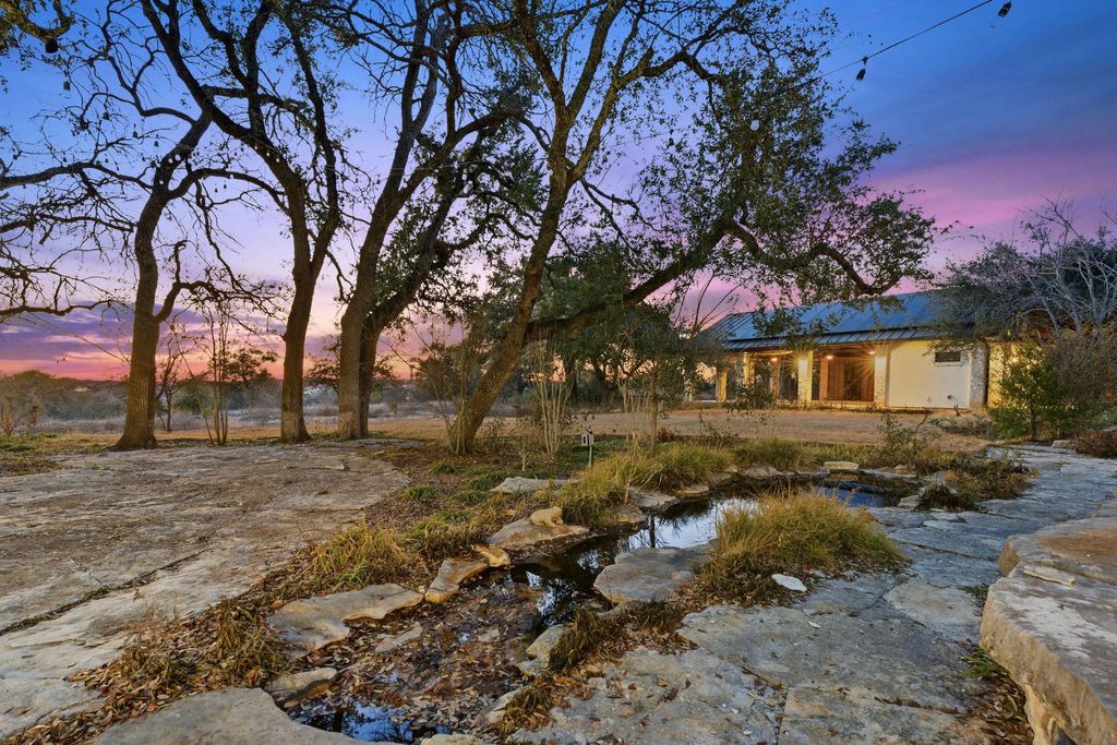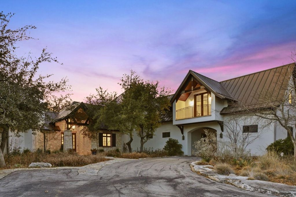 Privately positioned on 26 unrestricted acres in the heart of Bee Cave, this rare Hill Country estate delivers space, privacy, and refined design without sacrificing proximity to modern conveniences. A gated entry and drive lead to an expansive residence and grounds that feel worlds away from the city, yet remain centrally located. The main home spans approximately 6,745 square feet and blends classic architectural influence with elevated, contemporary finishes. Natural materials, including wide-plank white oak floors, stone accents, and exposed beams, create a cohesive warmth throughout, while the scale of the rooms allows for both grand entertaining and everyday comfort. The chef's kitchen serves as a true centerpiece, outfitted with professional-grade appliances, generous prep space, a statement island, and thoughtfully integrated beverage and wine storage. Designed with flexibility in mind, the layout includes multiple living areas, private suites, and a separate wing with its own sitting space and kitchen, ideal for guests, multigenerational living, or extended stays. Outdoors, the estate unfolds into a serene landscape featuring a fishing pond, curated gardens, and calming water elements. An impressive open-air pavilion with a full outdoor kitchen, bathroom, and automated shades creates a natural gathering space for hosting year-round. A six-car garage with interior access, porte-cochere, and ample additional parking complete the property. With unrestricted land, refined updates, and a central Bee Cave location, this estate presents a rare opportunity to enjoy Hill Country living at scale without compromise.