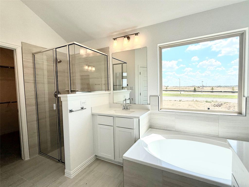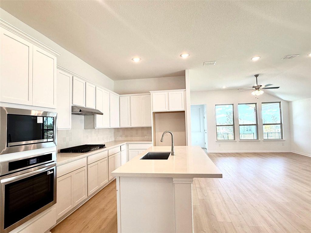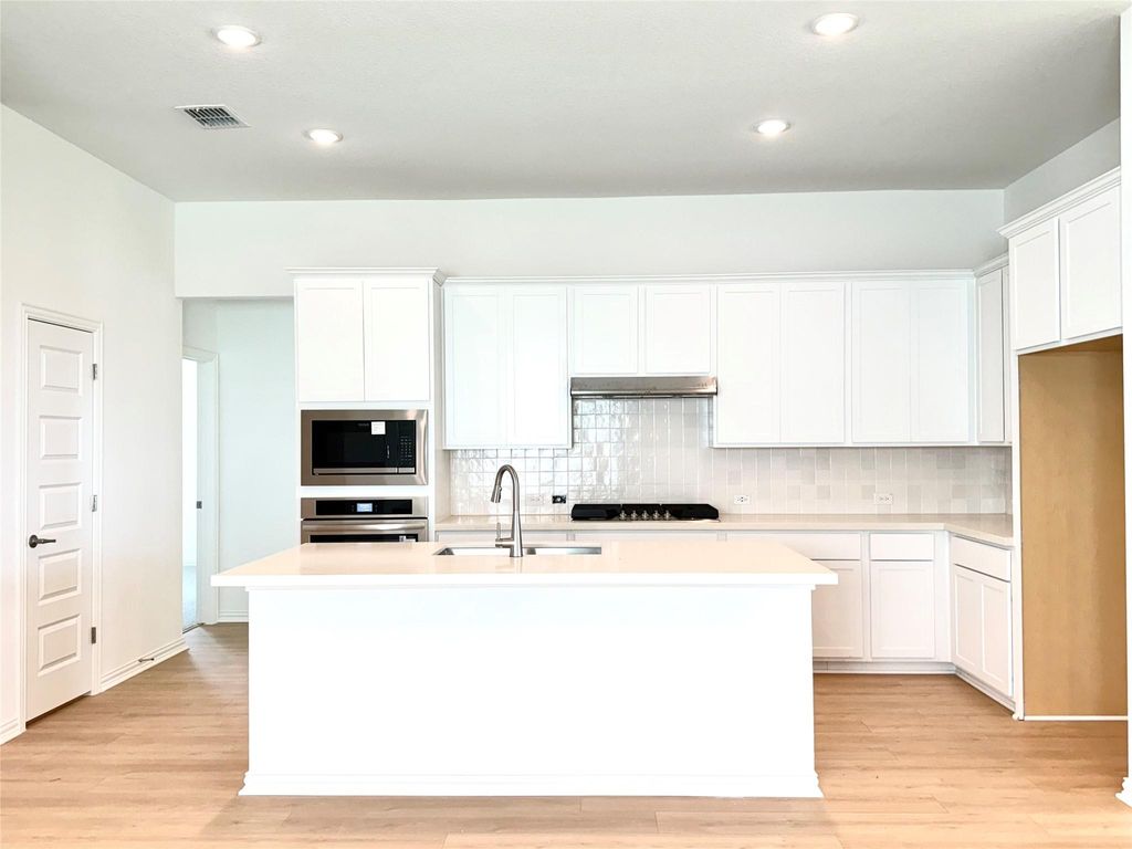 Northeast-facing home with a bay window in the primary suite. Bright and Spacious 4-Bedroom Home with Bay Window Primary Suite. This beautifully designed 4-bedroom, 3-bath residence features thoughtful touches and modern finishes throughout. The primary suite boasts a bright bay window and a raised vanity, creating a spacious and inviting retreat. The gourmet kitchen is equipped with a 36-inch cooktop and vent hood, stainless steel single bowl sink, quartz countertops, and white shaker-style cabinets with elegant hardware. Level 2 Revwood plank flooring flows through the main living areas, adding durability and style. The open-concept layout allows for seamless living and entertaining. Step outside to the patio with a convenient gas drop, perfect for outdoor cooking and gatherings. Additional features include front gutters for easy maintenance and a pre-plumbed loop ready for a future water softener system. Facing northeast, this home enjoys natural light throughout the day. Don't miss the chance to make this stunning home yours!