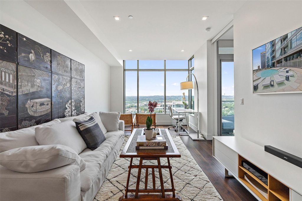 Welcome to Unit 2202 at the Fifth and West Residences in the heart of downtown Austin. Located on the 22nd floor, this luxurious condo offers unparalleled sophistication and breathtaking views overlooking West Austin and Lady Bird Lake. Immerse yourself in the elegance of modern, urban living with floor-to-ceiling windows that flood the space with natural light, creating a warm and inviting ambiance. Stepping into the kitchen, you'll find top-of-the-line stainless steel Miele appliances with double ovens, a built-in wine refrigerator, a five-burner gas cooktop and a countertop-depth refrigerator. The sleek and modern quartz topped waterfall edged island seamlessly blends functionality with style. The primary suite is a true sanctuary, featuring a serene bedroom with picturesque windows and a spa-like bathroom, complete with marble flooring and premium fixtures & finishes. The oversized walk-in closet boasts custom built-ins for ample storage as well as an LG washer and dryer. This unit also includes a stylish half bathroom, adorned with custom wallpaper, adding a unique touch of character and charm. Step outside on your spacious terrace, where you can take in the stunning views of West Austin while sipping your morning coffee or relaxing in the evening with a glass of wine. This unit embraces effortless ownership with an included parking space and storage unit in addition to keyless entry, remote controlled window treatments and other smart home features. Residents have the privilege of utilizing the yoga studio, an event kitchen, a fitness studio, a grill and bar area, a pool with wet deck, cabana, and game room. For pet owners, there's a dedicated dog park and pet spa. The location extends beyond its doors with easy access to Austin's best restaurants, shops, Whole Foods Market, Trader Joes, and multiple entertainment venues. Experience the epitome of luxury living in downtown Austin at Unit 2202 in the Fifth and West Residences!
