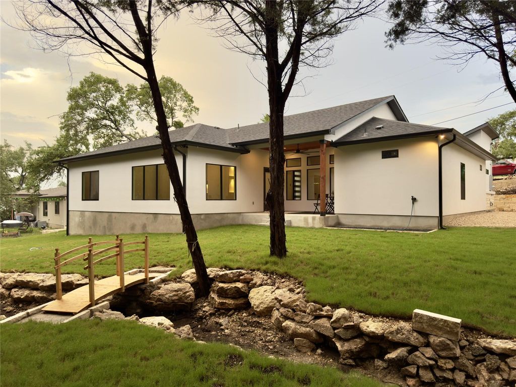 Discover modern living just minutes from the lake, with access to all the parks Lago Vista POA has to offer. This beautifully designed, custom-built home stands out with its striking architecture, seamless finishes, and incredible curb appeal. This spacious 4-bedroom, 3-bathroom home offers a versatile layout"”ideal for guests, a home office, or multi-generational living. Sleek, modern tile flooring runs throughout, and the garage is EV-ready with space for two cars. The open-concept living room features a dramatic tray ceiling, contemporary electric fireplace with heat function, and TV mount ready with connections. The kitchen impresses with ceiling-height custom cabinetry, quartz countertops, a large island with bar seating, and expansive storage"”all with views from the front porch to the back patio. Entertain in style in the formal dining room, complete with high tray ceiling, a designer light fixture, and oversized windows showcasing peaceful views of the backyard and surrounding trees. The luxurious primary suite offers tray ceiling, large backyard-facing windows, a large modern ceiling fan, and a sliding barn door leading to a spa-like bathroom. The ensuite includes a double vanity with vessel sinks, a glowing LED mirror, a freestanding soaker tub with waterfall faucet, and a frameless walk-in shower with stones flooring and three shower features. The large custom walk-in closet completes the suite. Outdoors, enjoy a beautifully landscaped front yard with a tiered stone wall and a modern walkway leading to a beautiful covered porch. The backyard is equally impressive, with a spacious covered patio, large fan and modern lighting. The backyard backs to dry creek but its was uniquely featured with a garden bridge that crosses to another piece of yard that could be use for gardening or a sitting area. This is a truly exceptional home that must be seen in person to be fully appreciated. Schedule your tour today!