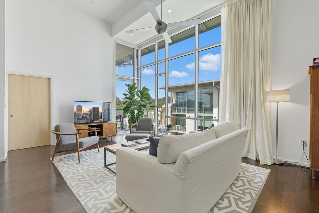 Introducing Residence 6603 at BartonPlace - a stunning penthouse that combines architectural drama with modern living. Soaring 18-foot barrel-arched ceilings and walls of floor-to-ceiling glass create a light-filled central living space, blending style and comfort in a bright, inviting space. The primary suite is a cozy retreat, featuring a rare personal terrace and a luxurious bath with walk-in shower and soaking tub. A versatile guest bedroom doubles beautifully as a home office, offering flexibility for today's lifestyle. Ideal location features few neighboring residences and easy access to the rooftop terrace, offering over 1,000 SF of outdoor living. Premium parking and garage storage further elevate the convenience and quality of this remarkable residence. BartonPlace blends modern luxury with everyday convenience and a vibrant, outdoor-focused lifestyle, earning its reputation as one of Austin's most desirable condo communities. Residents enjoy access to exceptional amenities, including a heated saltwater pool with lounging and grilling areas, four rooftop terraces with BBQ stations, beautifully landscaped outdoor spaces, a community garden, and an Owner's lounge with a kitchenette. Additional features include a private guest suite for overnight visitors, a well-equipped fitness room, a dedicated dog run, and 24-hour concierge service within a secure, gated setting.