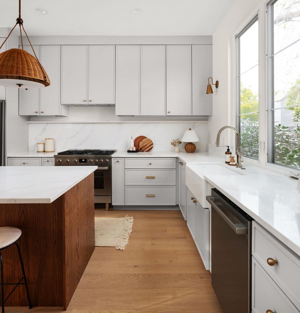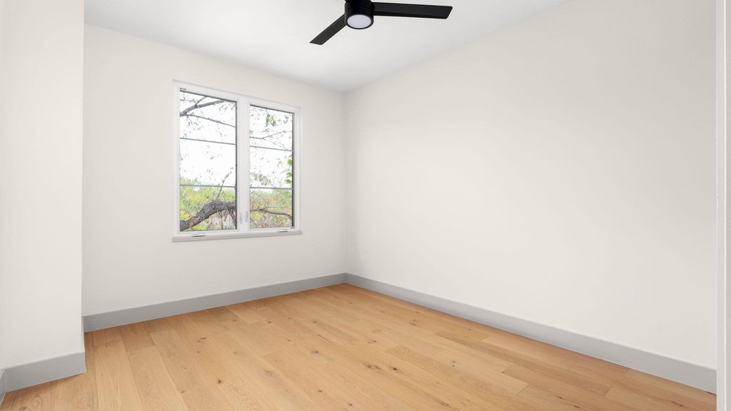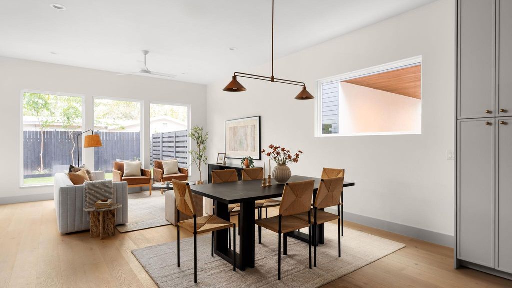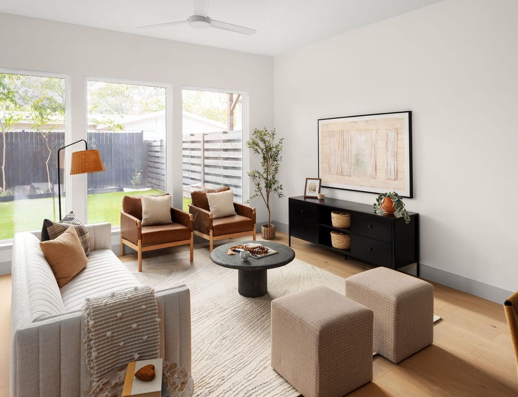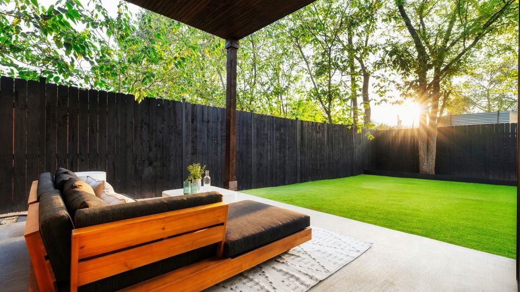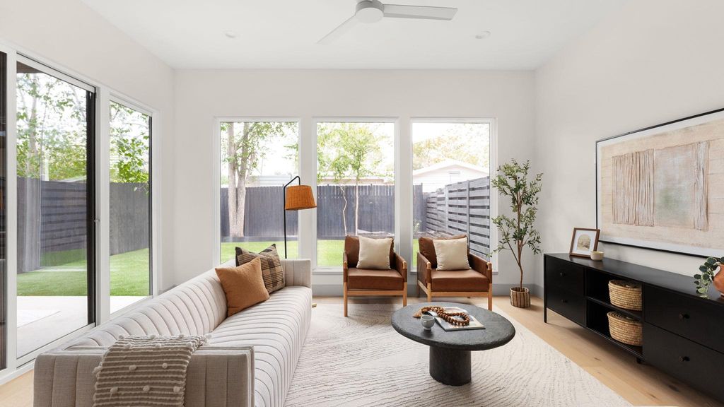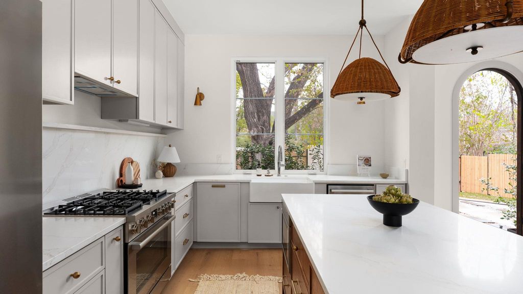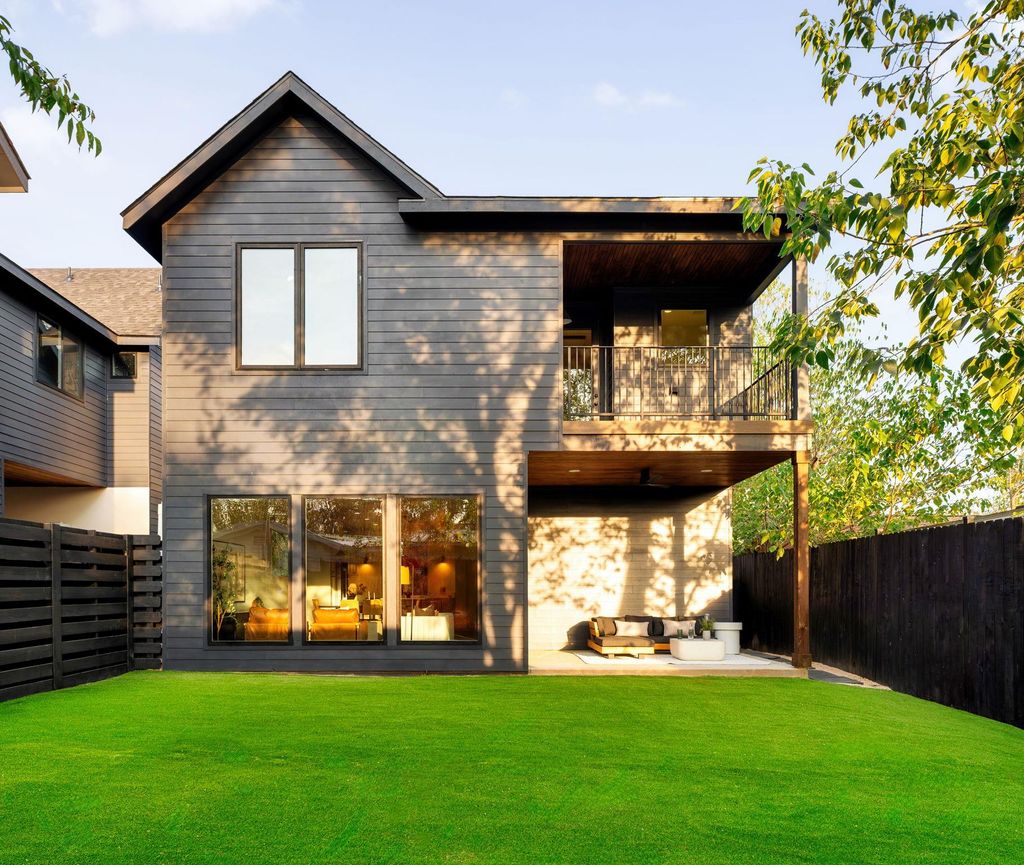 Experience inspired living in this Modern Transitional single-family residence, where Organic Modern interiors, natural materials, and architectural details come together in perfect harmony. Positioned on a nearly 8,000 sq ft corner lot surrounded by mature trees, this newly built home balances warmth, openness, and timeless sophistication. A stunning arched wooden front doorway sets the tone the moment you arrive. The entry leads effortlessly into the kitchen, dining, and living areas, forming a continuous open-concept path that extends all the way to the covered patio and turfed backyard. This intentional design creates a true sense of indoor/outdoor living, blurring boundaries and making the home feel expansive, airy, and deeply connected to its surroundings. The kitchen is a showpiece, featuring: "¢ Quartz countertops wrapped fully up the wall as a seamless backsplash "¢ Quarterline shaker cabinetry with mixed metal hardware "¢ Bosch stainless steel appliance suite with a 36" gas range "¢ Drawer microwave and modern fixtures Upstairs, the vaulted-ceiling primary suite offers a peaceful retreat. The spa-inspired bath includes a curbless walk-in shower, frameless glass, built-in bench and niche. Two secondary bedrooms, a beautifully finished bathroom, and a dedicated laundry room complete the level. Outdoor living is exceptional with: "¢ Large covered patio and a second private covered balcony upstairs "¢ Large turfed backyard surrounded by mature trees "¢ Architectural fencing combining black metal posts, vertical 2x2 wood, and stucco elements Premium features include: "¢ Smart thermostats "¢ Ring doorbell "¢ Navien tankless water heater "¢ Energy-efficient spray foam insulation "¢ EV charging outlet (220V) Located in a quiet, walkable neighborhood with quick access to major highways and only 10 minutes to downtown Austin, this home offers refined design, modern livability, and an atmosphere that feels both elevated and inviting. Owner/Agent