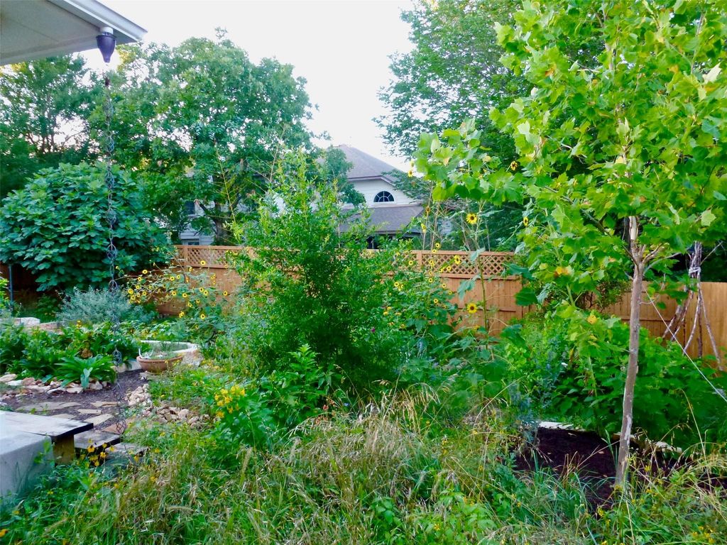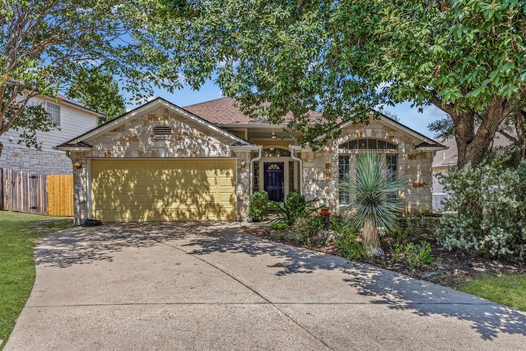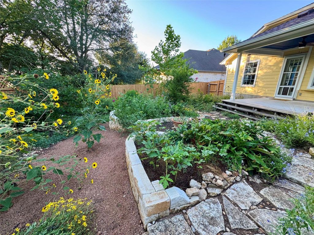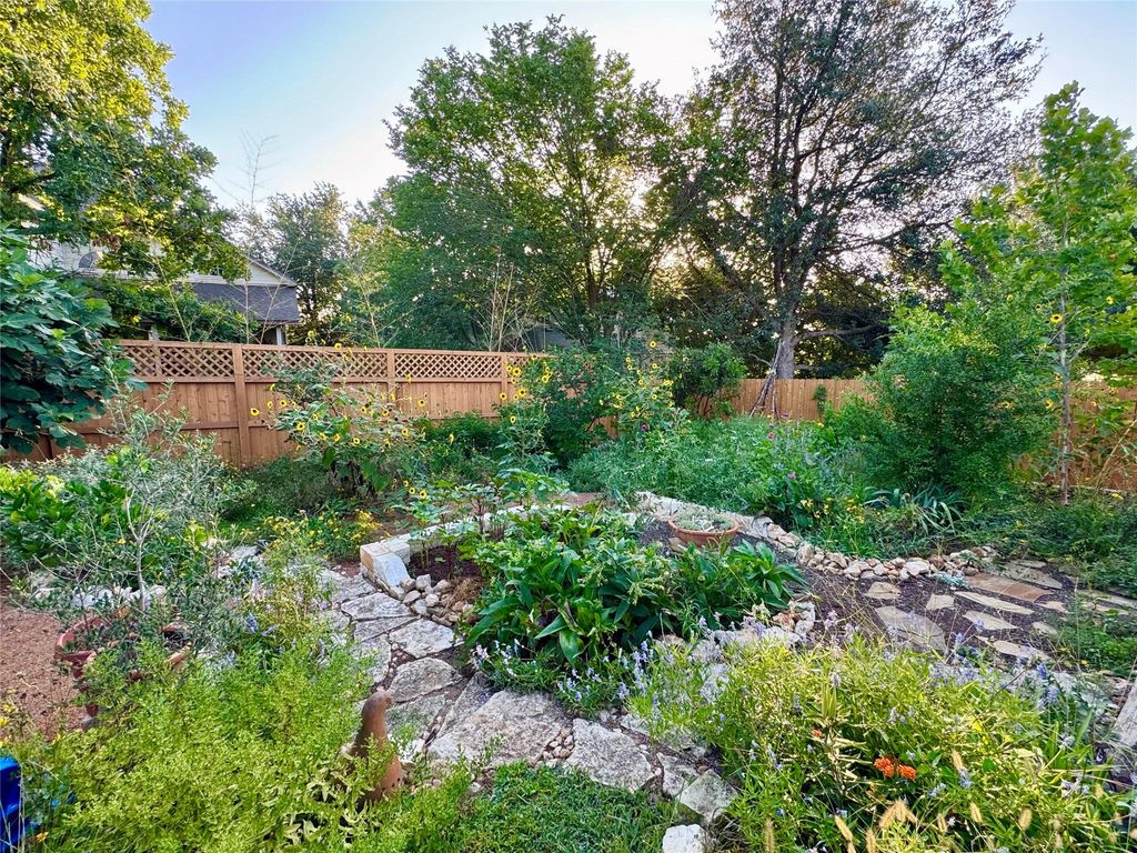 Interest rates are lower right now. Ask Seller for closing costs to lower rate some more. Rare single story stone gem in South Austin's beautiful Bauerle Ranch, within a 300 acre preserve enjoyed by all ages from tiny tots to elders. Walking trails, pool, playground, basketball court a short walk away. High ceiling living room with corner fireplace, dramatic arched window, large command kitchen opens to garden views, the living room, 3 dining spaces including a two-sided breakfast bar, convenient walk-in pantry/laundry, fun chalk board wall, gas cooking, Bosch dishwasher, pretty shelves will stay. Soaring ceiling in spacious primary bedroom retreat with high arched window, walk-in closet, bath with separate shower, relaxing soaking tub, dual sinks, glass block window. 4th bedroom or study, studio or craft room as 2nd living has French doors. Two more bedrooms and a bath are located away to provide privacy for the Owner's suite. Wood and tile floors, no carpet. Impressive front door with a covered entry with a high arched transom window and side light windows with an lighted art niche in the entryway. Many ceiling fans, level driveway with 2 car garage with door opener, recent roof, water heater, fence, paint, and stainless refrigerator. Enjoyable backyard natural beauty, a carefully chosen collection of native plants, fruit trees, curved stone planters and paths, metal arched arbor, covered porch with a fan and sun shade. The garden is a serene setting for peaceful relaxing and sharing the wonders of the natural environment and enjoying different seasons of good veggies, fruit and flowers. The active HOA hosts frequent community gatherings for music, food and fun for neighbors to gather and play together and all for a low HOA fee. Easy access to South Austin shopping, dining, and Stinson Entertainment District with popular food and drink spots. Easy access to Mopac, and I-35. A wonderful place to live peacefully with nature right in the middle of vibrant Austin.