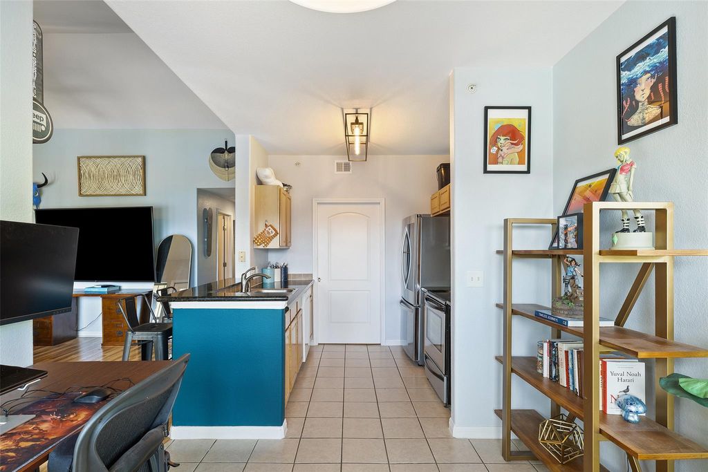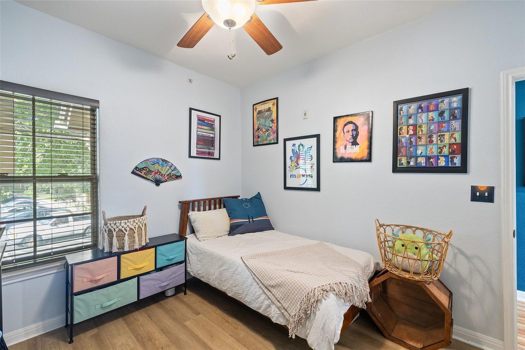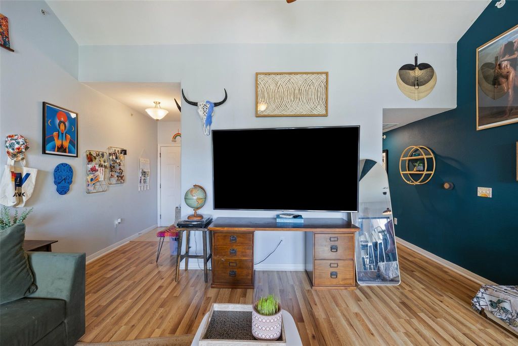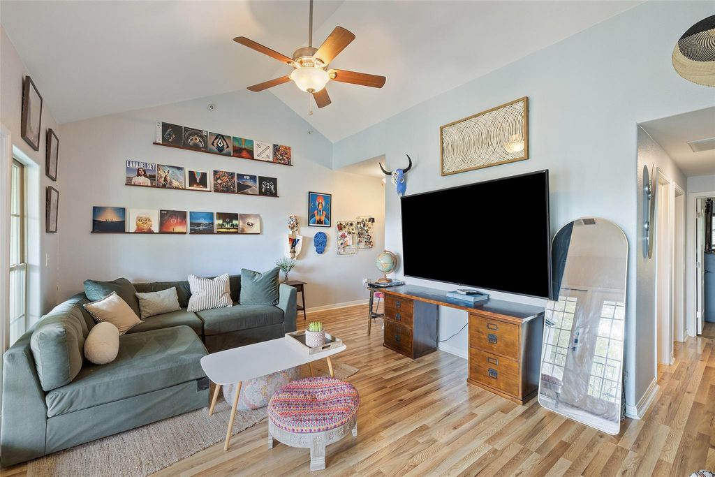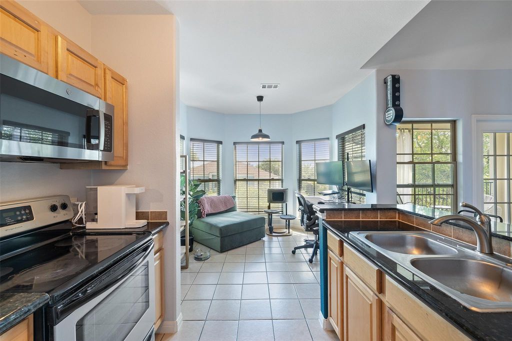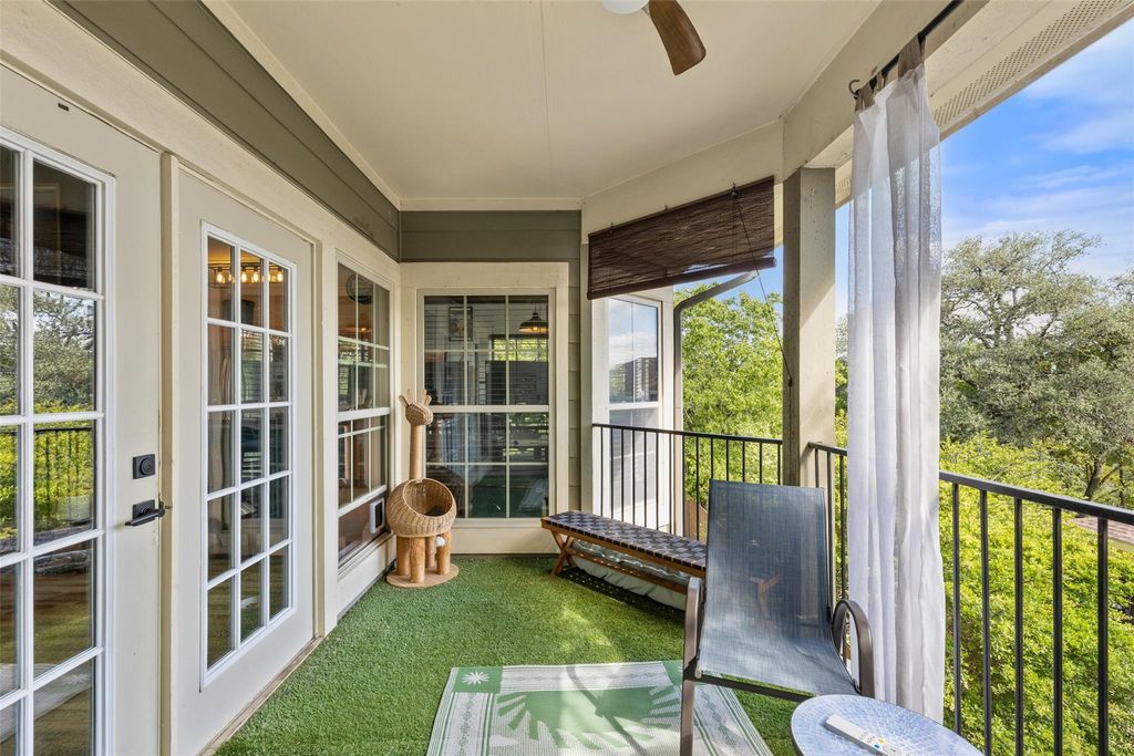 Preferred lender is offering a free buydown, giving the buyer two years of a 1% lower rate. A serene South Austin retreat nestled in the trees. This beautiful 2-bedroom, 2-bath condo is a private corner unit set on the second floor. Step inside to a bright and airy living space where expansive windows, French doors, and vaulted ceilings bring the outdoors in, especially during sunrise when the home is bathed in warm orange and red hues. The open-concept layout features a well-appointed kitchen with stainless steel appliances, a breakfast bar, and a cozy dining alcove perfect for gatherings. Enjoy your morning coffee or unwind in the evenings on the oversized balcony, complete with a storage closet and sweeping views of the treetops, it is an ideal perch to take in peaceful sunrises, birdsong, and the soothing sound of rain on the metal roof. The spacious primary suite features a double vanity, soaking tub, and walk-in shower. Additional upgrades include wood blinds throughout, updated door hardware, a patio ceiling fan, and recently replaced appliances, including the fridge and microwave. Located just minutes from South Lamar, the Barton Creek Greenbelt, and downtown Austin, this community offers easy access to vibrant local dining, shopping, and outdoor adventures. You're only moments from William Cannon for all your essentials, including medical, grocery, pet care, and more. On-site amenities include a community pool, gazebo, and basketball court.