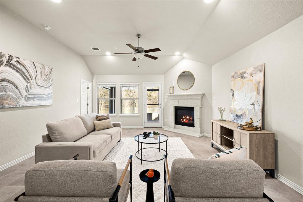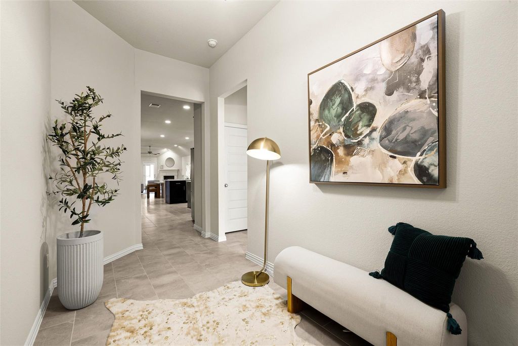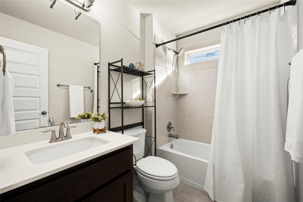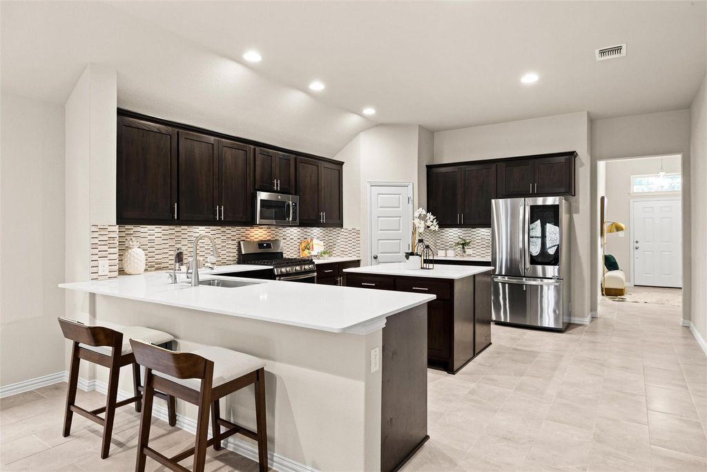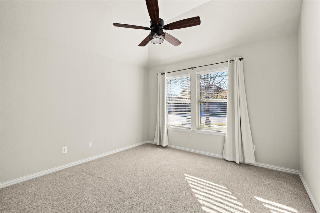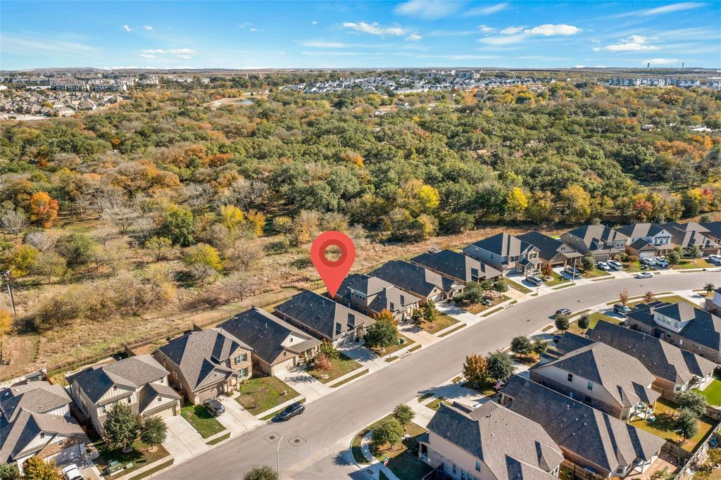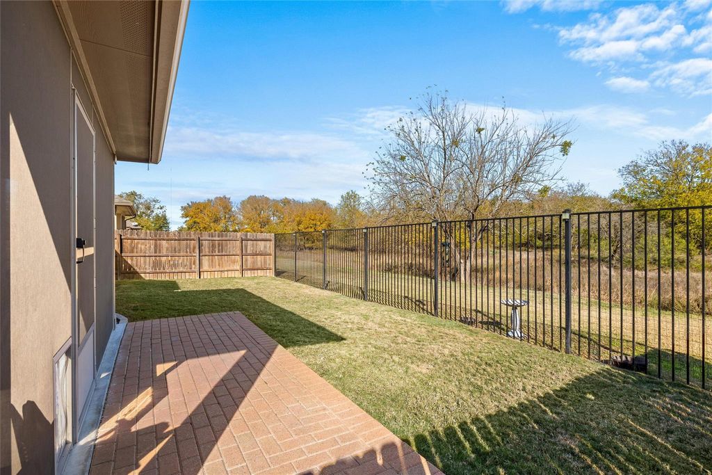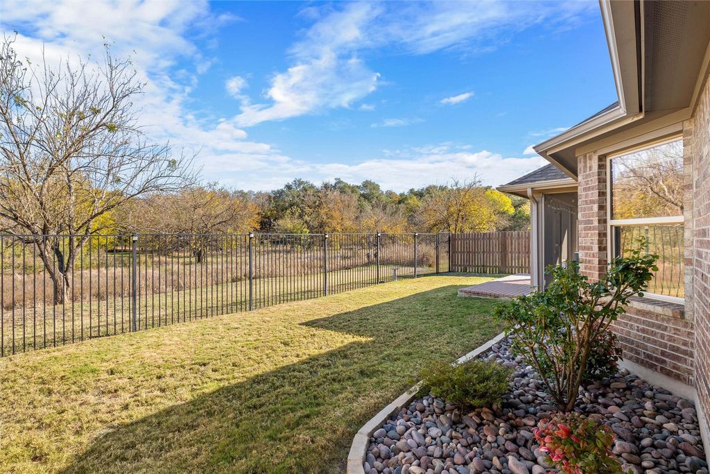 Thoughtfully designed single-story home offers 4 bedrooms, 3 baths, & a flexible 2nd living area that works equally well as a home office or flex space. A greenbelt backdrop adds privacy and a sense of calm. A foyer opens into the kitchen, dining, and living areas, which connect easily while still feeling distinct and purposeful. The kitchen is functional & inviting with generous quartz countertops, island, 42-inch shaker-style cabinetry, stainless steel appliances, and a designer backsplash. The layout is suited for multi-generational living, with bedrooms intentionally separated for privacy and no interior steps. One bedroom sits near the front of the home, two are centrally located, and the oversized primary bedroom is situated in the back. The primary suite includes a bay window, a walk-in closet professionally designed by California Closets, dual- sink quartz vanity, and a walk-in shower. Outdoors, is a screened-in porch with a ceiling fan overlooking the private backyard with a wrought iron fence and a gate opening directly to the greenbelt. Mature trees and visiting wildlife create a peaceful, restorative setting. Pet owners will appreciate the built-in door for furry friends leading from the screened porch to the backyard. Additional features include new carpet installed in January 2026, a water softener, a tankless water heater, and exterior hard-freeze spigots. Bear Creek Crossing is a friendly neighborhood that offers a community pool, playground, & walking trails. Its location provides easy access to restaurants, entertainment, outdoor areas & public parks, I-35, and the SH 45 SW Toll Road. This well-built 2019 home offers modern comfort & design in an easy-to-manage footprint, surrounded by a peaceful natural setting and close to everyday conveniences.