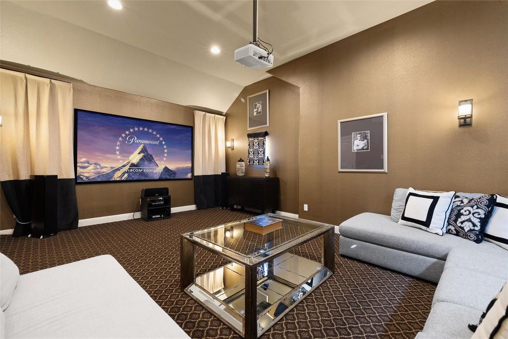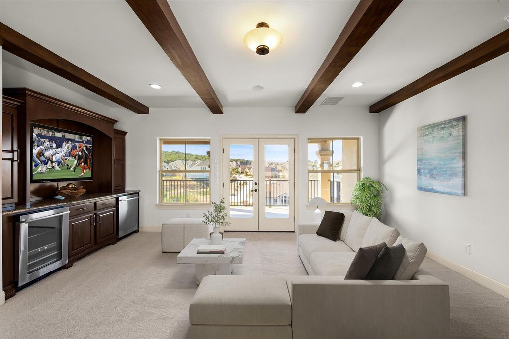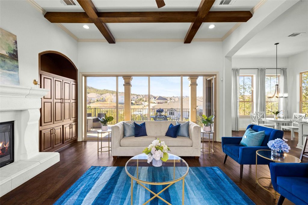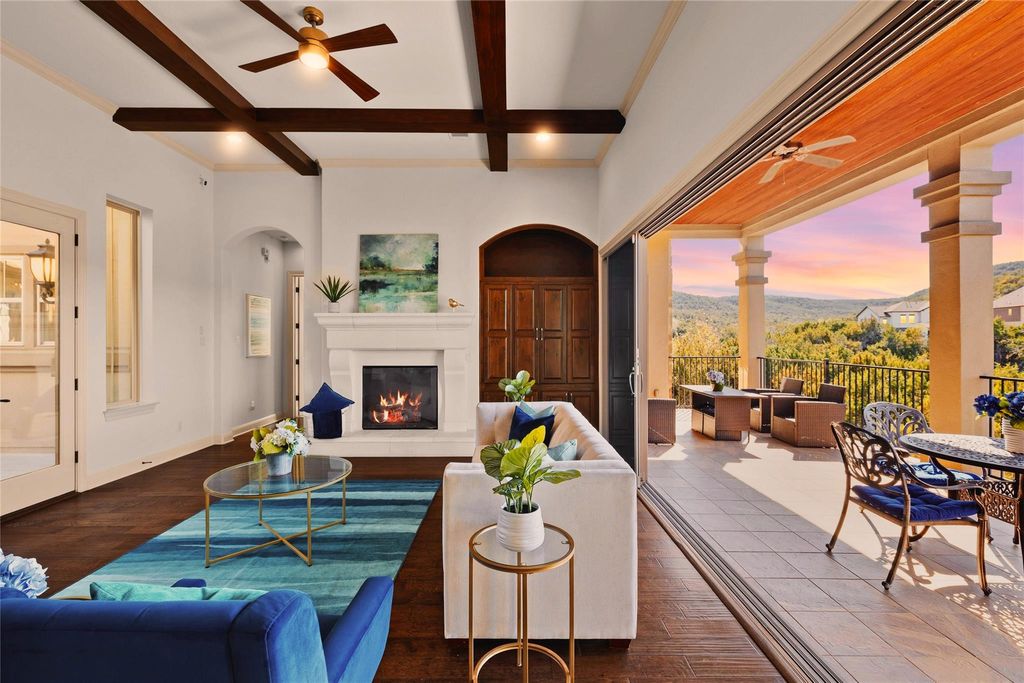 Set behind the gates of Davenport Summit in the sought-after Sweetwater community, this exceptional former model home at 6000 Osceola Trail makes a statement from the moment you arrive. Backing to a tranquil greenbelt & offering more than 6,000 square feet of living space, the home is designed for both everyday comfort & memorable entertaining w/ three levels of covered patios capturing sweeping Hill Country views. Inside, rich wood floors lead you to a striking central courtyard anchored by a wood-burning fireplace"”an inviting spot for evening gatherings under the Texas sky. A bright, private office at the front of the home provides a quiet workspace, while the generously sized dining area easily accommodates both formal dinners and relaxed conversation. At the heart of the home, the chef's kitchen delivers on every level w/ premium JennAir appliances, including a commercial-style 48" dual-oven range, a 48" built-in refrigerator & a third built-in oven. The adjoining family room is filled w/ natural light from a wall of sliding doors & centered around a classic cast-stone fireplace. The main-level primary suite is a true retreat, featuring direct access to a covered patio, a spa-like bath, & convenient connection to the laundry room. Downstairs, the walk-out basement sets the stage for entertaining with a guest suite, an elegant pub room with fireplace and wet bar, a flexible space ideal for a gym or secondary office, and a tucked-away wine room beneath the stairs. Upstairs, you'll find an additional guest en-suite, two bedrooms joined by a Jack-and-Jill bath, a dedicated media room, and a game room that opens to the upper covered patio"”complete with built-in cabinetry and dual refrigerators. Year-round soffit lighting enhances the home's exterior ambiance. Beyond the home, Sweetwater offers a resort-style lifestyle with two pools, a residents-only fitness center, basketball, pickleball and sand volleyball courts, a dog park, and miles of hiking and biking trails.