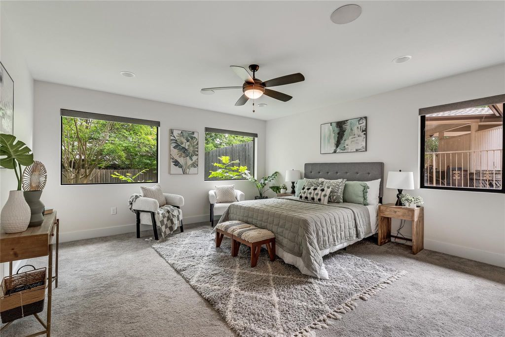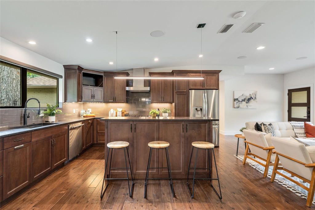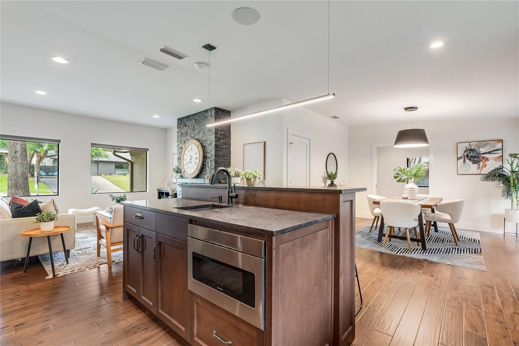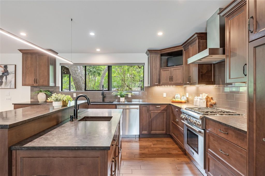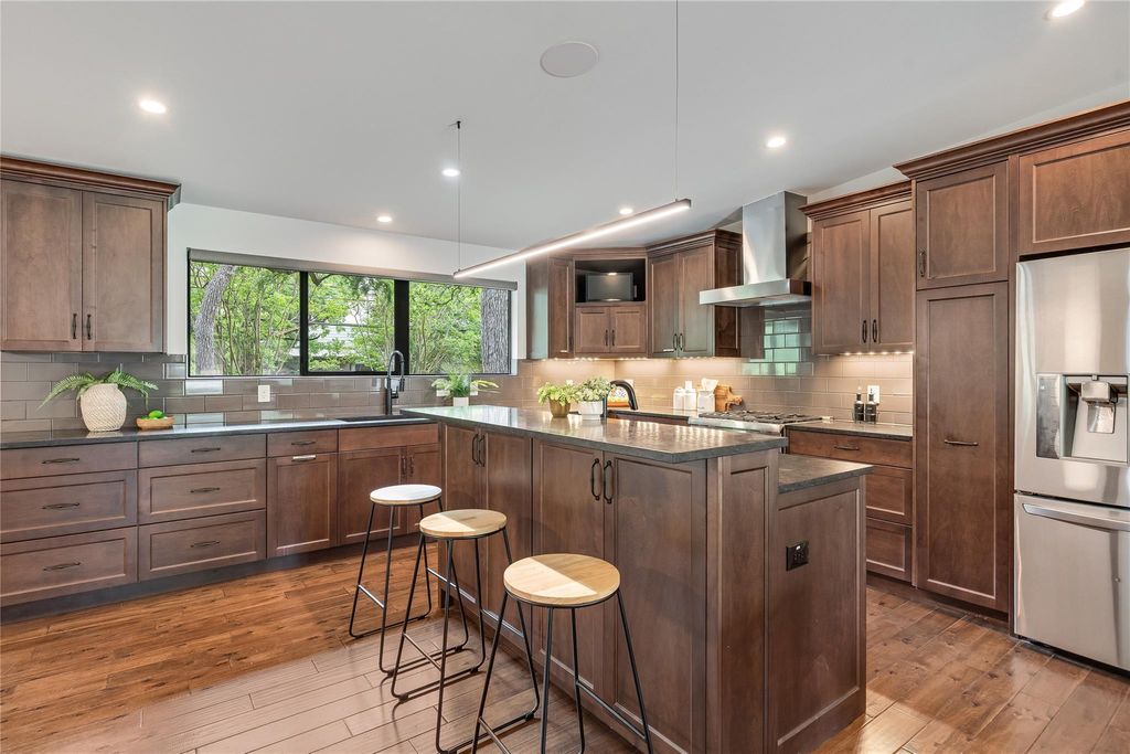 Updated Barton Hills Beauty just 3 blocks from Barton Springs Pool! This move-in-ready, single-story home features 3 bedrooms, a home office, and 2 full bathrooms. The entire home underwent a sleek and stylish renovation in 2016-2017, including essential updates like the roof, HVAC, water heater, sewer main replacement, and a covered back porch addition. Impressive curb appeal with updated landscaping including welded steel accents and Leuder stone walkway. Inside, the luminous open floor plan is perfect for entertaining, featuring oversized picture windows and elegant wood floors. The home is wired for speakers with an entertainment control center, speaker controls in every room, and a smart thermostat. A cozy designer fireplace set in a floor-to-ceiling stone hearth is the focal point of the living room, while the large kitchen island with bar seating serves as the home's gathering hub. Amazing kitchen remodel with built-in SS appliances, granite countertops, subway tile backsplash, and timeless custom cabinetry. The primary suite serves as your secluded retreat with picture windows and a modern ensuite featuring custom cabinetry, a jetted soaking tub, and a designer walk-in shower. In addition to two secondary bedrooms, and a modernized dual vanity secondary bath, there is also a home office with a Murphy bed. The nearly quarter-acre lot includes a spacious fenced backyard with updated landscaping and a covered patio with a gas firepit. Coveted AISD schools include Barton Hills Elementary, O Henry M.S., and Austin H.S. No HOA. Google Fiber available. Just 3 miles from Downtown and a short walk or bike ride to the Barton Creek Greenbelt, Zilker Park, ACL Fest, and renowned restaurants along S. Lamar and SoCo. This coveted South Austin neighborhood offers unparalleled proximity to Austin's favorite spots. Don't miss this rare opportunity to own a contemporary home in the sought-after Barton Hills community! Schedule your showing today.