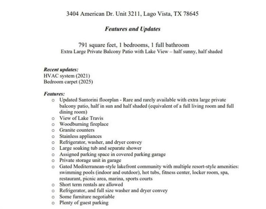 Welcome to 3404 American Drive Unit 3211 in the heart of Lago Vista. STUNNING VIEWS of Lake Travis! Enjoy lakefront living in this rarely available one-bedroom floor plan that offers a separate living and dining room, kitchen, laundry room, wood-burning fireplace, ensuite bathroom with separate shower and soaking tub, plenty of closet space, and an oversized balcony overlooking the lake. Comes fully furnished - All furniture, refrigerator, washer and dryer will convey. The balcony is accessible from both the living area and bedroom and offers part shade and part sun exposure. Located in the highly desirable Island on Lake Travis community (which literally sits on an island in the middle of Lake Travis), this home offer resort-style amenities, such as two outdoor pools with hot tubs overlooking the lake, an indoor pool and hot tub, fitness center and spa, on-site restaurant, tennis and pickle ball courts, outdoor grilling, a fishing pier, boat ramp and a private marina that offers boat slips for sale or rent. This lakefront home is in a gated complex and also includes a private covered parking spot, guest parking, elevators, a private storage unit, and has investment potential as a short or long-term rental. Recent updates include the HVAC system (2021) and bedroom carpet (2025.) Seller is motivated. Schedule your showing today!