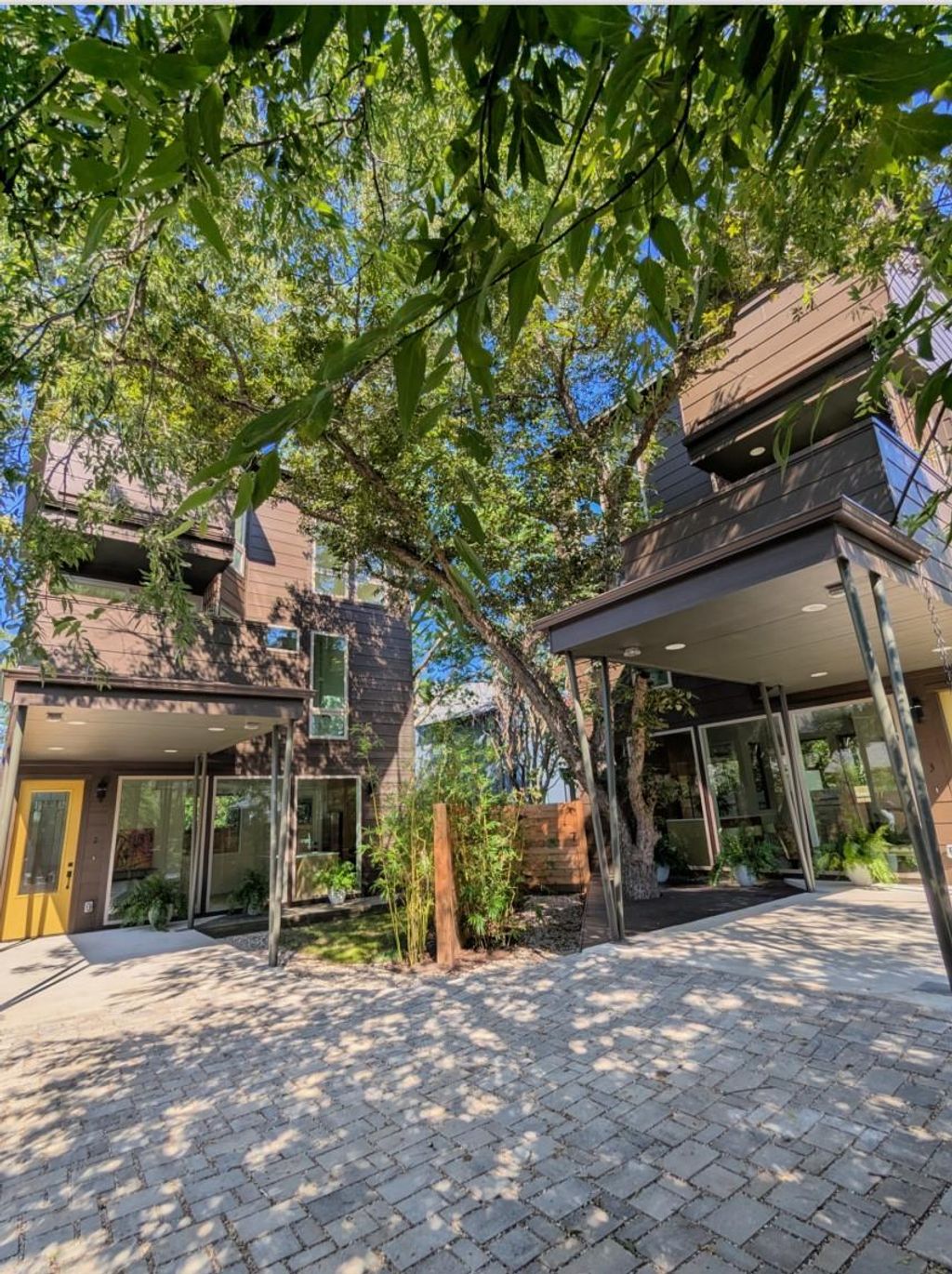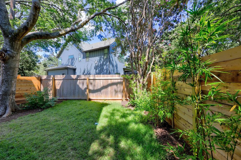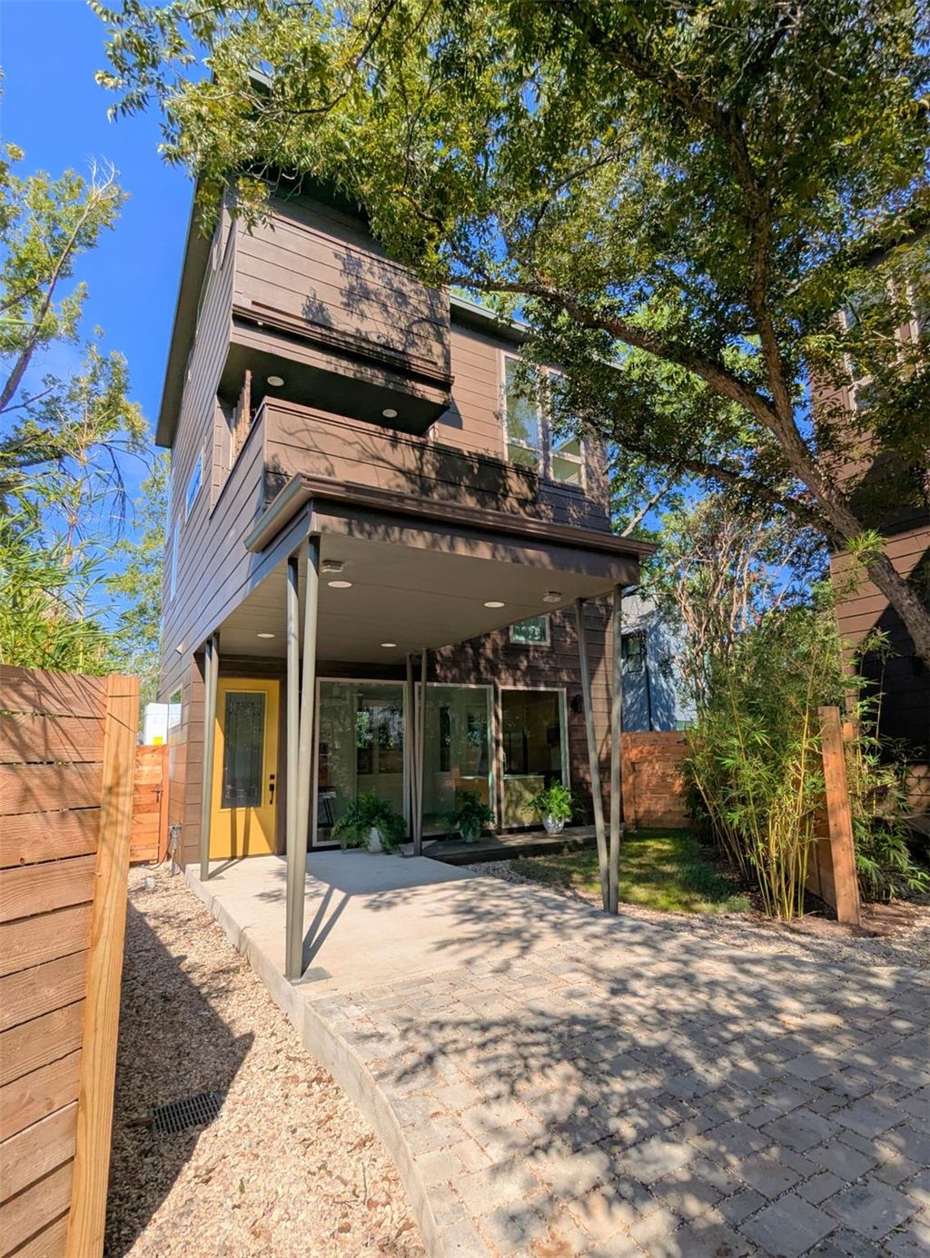 Tucked into the sought-after Park Forest neighborhood, this free-standing new construction condo home feels like a modern treehouse in the city! Expansive casement windows fill the home with natural light and frame leafy views, creating the sense of living among the treetops. The open floor plan features wide-plank hardwoods and a chef's kitchen with Samsung Bespoke appliances, quartz counters, and custom cabinetry. The owner's suite offers a private balcony perch, spa-like bath with a separate shower, and a large walk-in closet with lots of built-ins, while an additional balcony extends the indoor-outdoor flow on the third level. Modern comforts include an inverter HVAC system, EV charger readiness, and generous storage closets inside and out. Outside, enjoy mature shade trees that cover the entertainment-ready deck, and a fully fenced yard for privacy. A covered carport and low-maintenance landscaping complete this turnkey retreat. Minutes to downtown, Central Market, Garrison Park, and Austin's vibrant dining scene. The rare and advantageous 1.81% tax rate makes this home perfectly balance nature, design, and convenience.