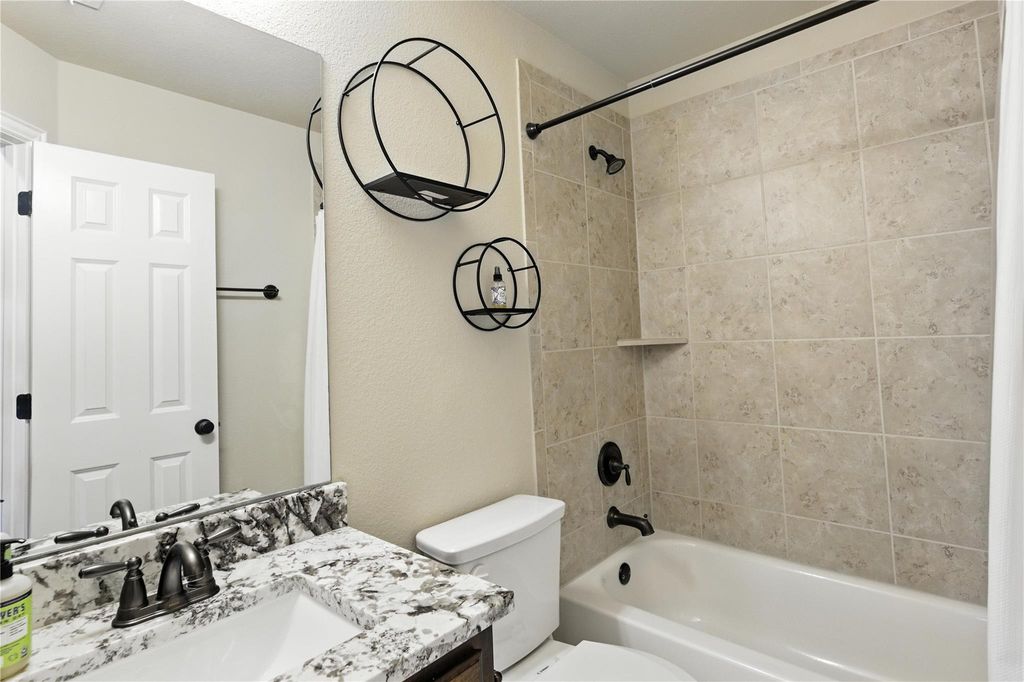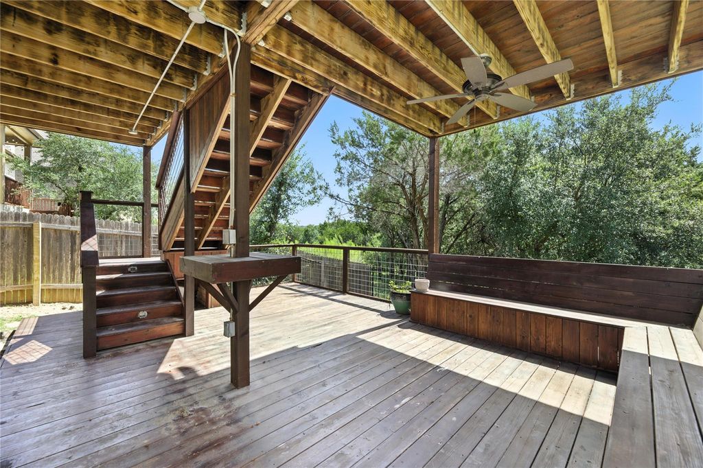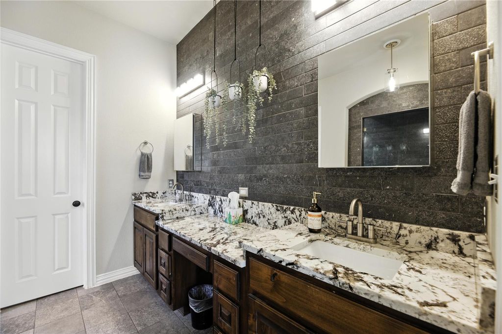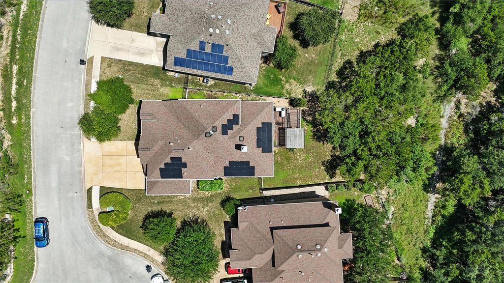 Welcome to your dream home, located in the highly sought-after community of West Cypress Hills. Nestled at the end of a peaceful cul-de-sac, this beautifully renovated home offers unparalleled views and is built by the award-winning Highland Homes. Meticulously cared for by its owners, this residence combines modern luxury with timeless charm. Spanning approximately 3,252 sq. ft., this open-concept floorplan boasts soaring 20-foot ceilings, 5 spacious bedrooms, 4 full baths, a large office, and an additional secondary living space. Every detail of the home has been thoughtfully designed, from the TX limestone and brick wood-burning fireplace to the rich hardwood and oversized tile floors. The kitchen is a chef's dream with a new backsplash, stainless steel appliances, a gas cooktop, farm sink, wine fridge, and luxurious granite countertops throughout. The home also features a dedicated desk space with ample storage, rustic wood accent walls, stylish designer light fixtures, and decorative touches that add character and warmth. The primary suite offers a custom walk-in closet, and the primary bath is enhanced with imported Italian tile for a touch of elegance. The sleek laundry space is designed with elevated bases, while all new faucets and fixtures further elevate the home's appeal. Efficiency meets luxury with a state-of-the-art Enlighten Enphase Solar Panel System, ensuring low energy costs year-round. The 3-car side-by-side garage offers plenty of space for storage and vehicles. Step outside to your expansive double-decker outdoor entertainment area, complete with three separate covered living spaces and a Big Green Egg grill/smoker. Backing to a serene greenbelt, this private oasis is perfect for relaxation and entertaining.