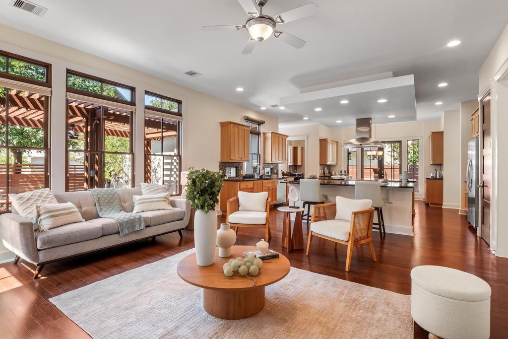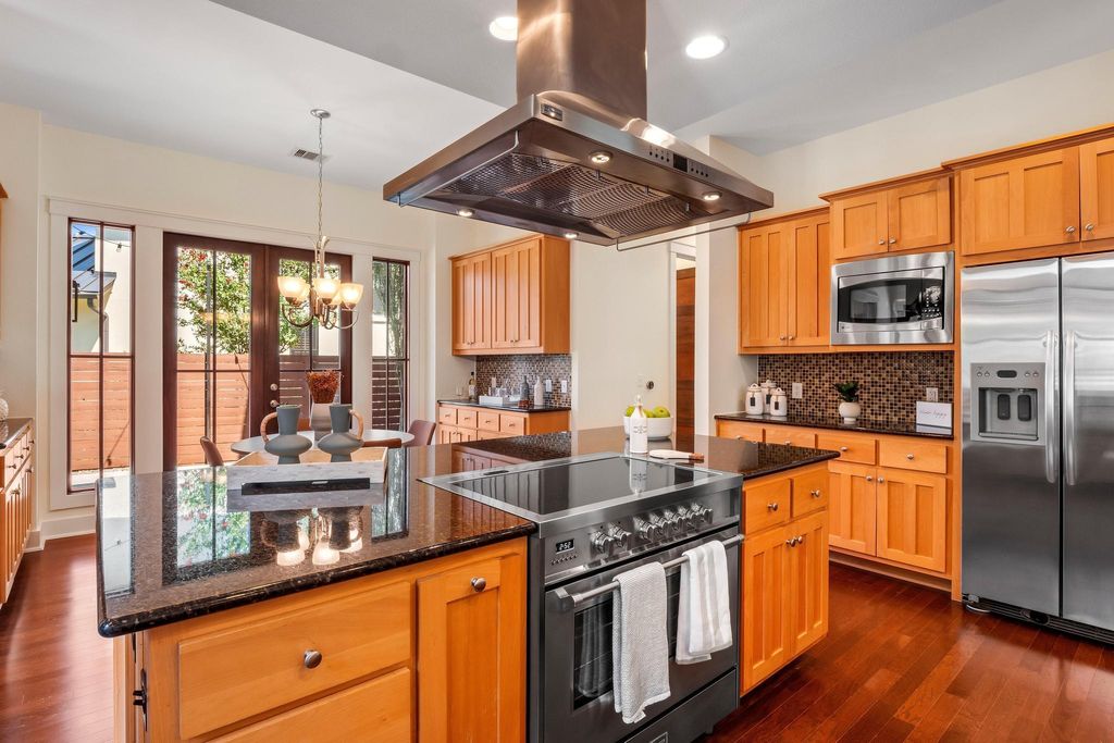Rare 2-story large home has become available in original section of Mueller. Green built home on gorgeous street-4 bedrooms; 3 bathrooms; 2 living; 2 dining; game room; generous spaces w/open floorplan-perfect for gatherings-upgrades include: hardwood floors, brand new carpet, stone floors in bathrooms, custom built-ins throughout. Double granite counter islands in large open kitchen. Laundry room has built-in pet bathing area. Private rear professionally landscaped yard with wood pergola, and additional private driveway for extra parking with solar electric gate. Distinctive interior features with double-island kitchen, wood framed windows, and ceiling fans throughout the home. All Appliances will convey. This home also provides solar panels with a property tax exemption from COA. Newly painted inside and out with brand new carpet upstairs and in all bedrooms. This home is move-in ready. Exceptional home in Austin's premier urban neighborhood let's you walk to parks, dining, and movies! IMMEDIATE MOVE-IN! ONE OF MOST ENERGY EFFICIENT 5-STAR GREEN HOMES! HARDWOOD FLOORS THROUGHOUT FIRST FLOOR, TILE FLOOR IN BATHS! WOOD DOUBLE HUNG WINDOWS! 8' DOORS! 2 TANKLESS WATER HEATERS! DOUBLE-ISLAND GRANITE TOPS! Restrictions: Yes Sprinkler System:Yes; Solar Panels: Yes. READY TO MOVE-IN; Yes.