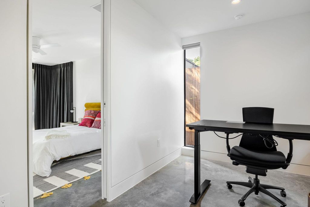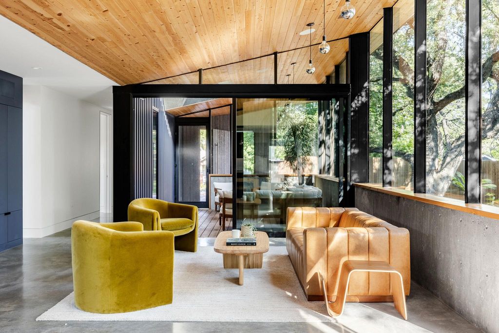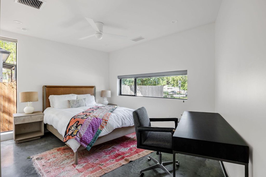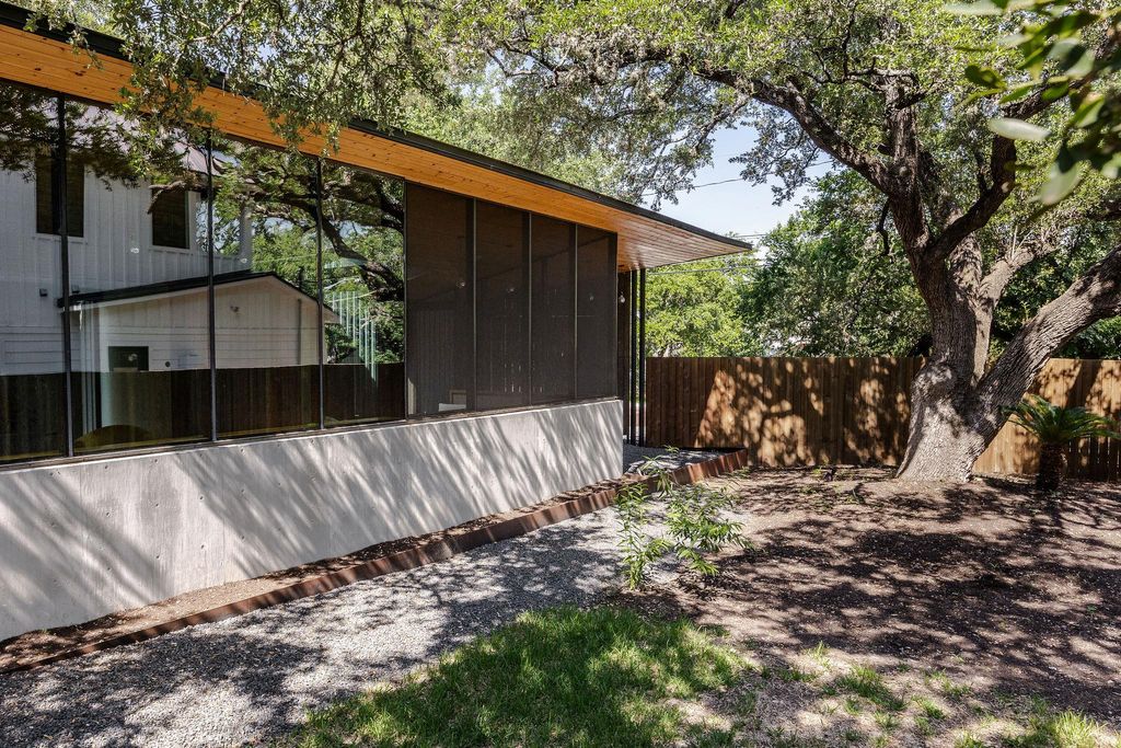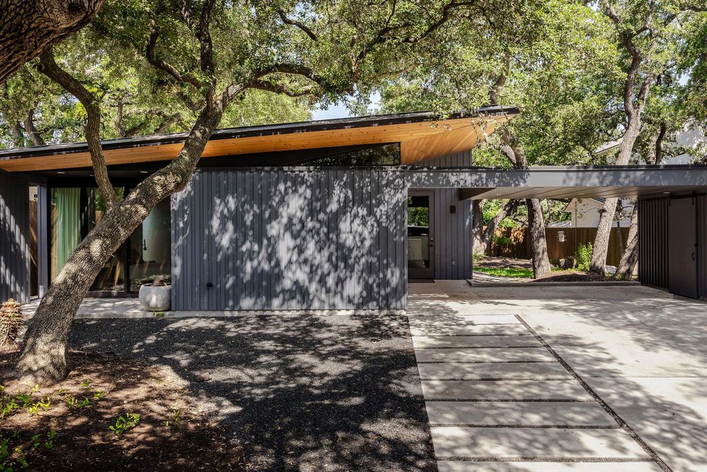 Nestled beneath a canopy of heritage Oaks and preserved Elms, this residence was transformed by the renowned Ravel Architecture, and is a bold expression of modern design, seamlessly integrating organic materials and a reverence for its natural surroundings. Tucked behind a discreet, easily-gated entrance, the home sits atop verdant grounds, offering absolute privacy just moments from the vibrant heartbeat of South Congress. An artful interplay of wood, steel, glass, and aluminum creates a striking facade that gives way to a fully enclosed patio living room"”punctuated by skylights that bathe the space in natural light. A subtle transition welcomes you into the heart of the home: a voluminous living space anchored by site-cast concrete, soaring glass walls, and a flow that fuses form and function. The chef's kitchen is a sculptural centerpiece featuring a dramatic quartzite island, custom blue cabinetry with built-in dual refrigerators, Miele appliances, wet bar and galley-style pantry. A modern utility space, elevated by floating up-lit cabinetry and frosted glass, seamlessly integrates function and design. The primary suite is a private sanctuary, set beneath an architecturally angled roofline that invites streams of light into the spa-like bath and custom walk-in wardrobe. Two additional en-suite bedrooms each extend to private outdoor patios. Throughout the home, curated touches such as floating stone vanities, warm wood paneling, and oversized built-in closets speak to an uncompromising attention to detail. Additional amenities include a two-car carport, whole-home automation, integrated surround sound, and permitted, shovel-ready plans for a bespoke pool. Perched on an oversized lot with dual access from Drake and Brackenridge Drive, this residence offers rare proximity to the Lady Bird Lake boardwalk, local parks, and the cultural pulse of South Congress"”all while delivering the quiet prestige of one of Austin's most treasured neighborhoods.