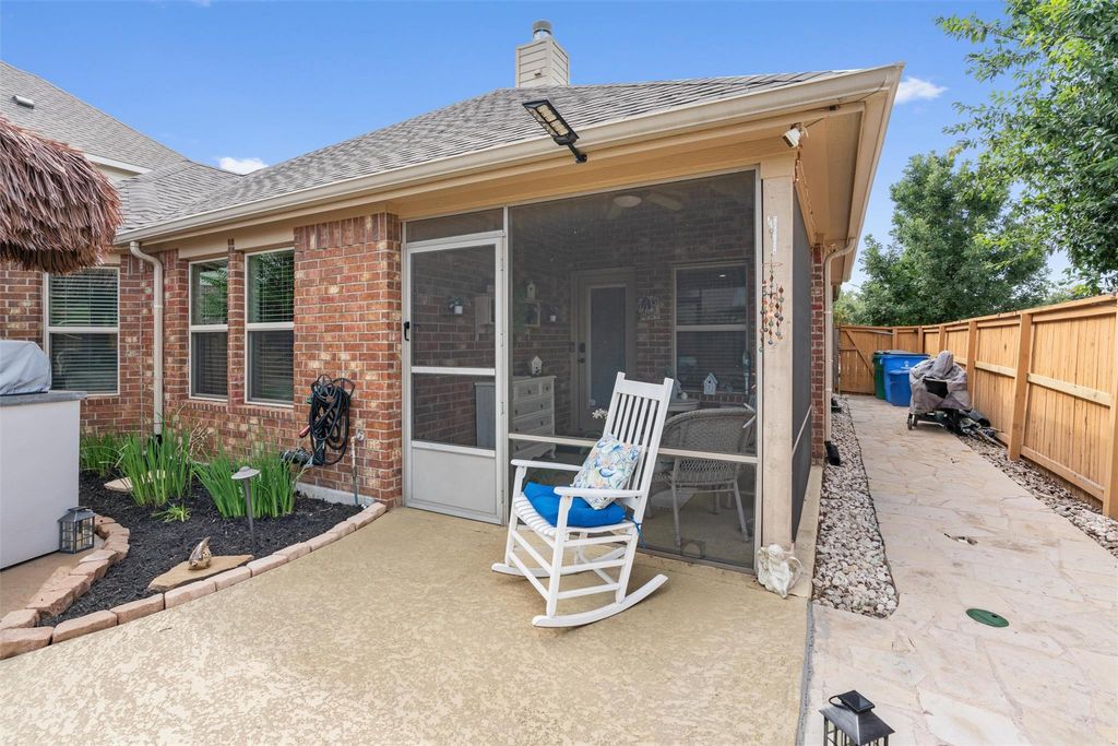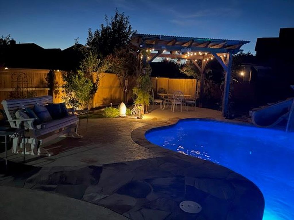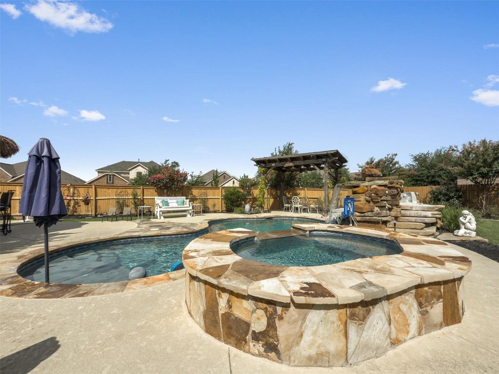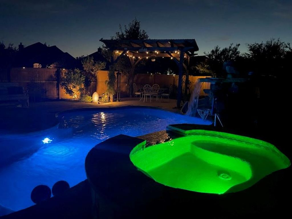 Amazing outdoor living! Drink your morning coffee on a cozy screened-in porch, surrounded by lush landscaping with perennial flowers. Heated and cooled gunite pool by Blue Haven includes attached spa, waterfall, slide, and lighting. A built-in firepit and lighted cabana add to the pleasant backyard ambiance. Pool pumps replaced in 2025, and tile was sandblasted in July 2025 for a fresh, clean look. JellyFish lighting installed on facade in 2024, and cabana roofed and re-wired in 2023. Inside, the versatile single-story floor plan can be 4 bedrooms or 3 plus a dedicated office with a built-in Murphy Bed, as well as a formal dining room. Wood-type flooring throughout main areas creates a seamless look. Deluxe primary suite looks out on beautiful backyard, and features double vanity, garden tub, separate shower, and walk-in coset. Laundry room has shelving and hanging space for maximum organization. Fresh interior paint in 2023, including walls, ceilings, baseboards, and trim. Roof replaced in 2021, and whole house back-up battery has been installed in case of a power outage. Special zero down financing available, come see it while you can!
