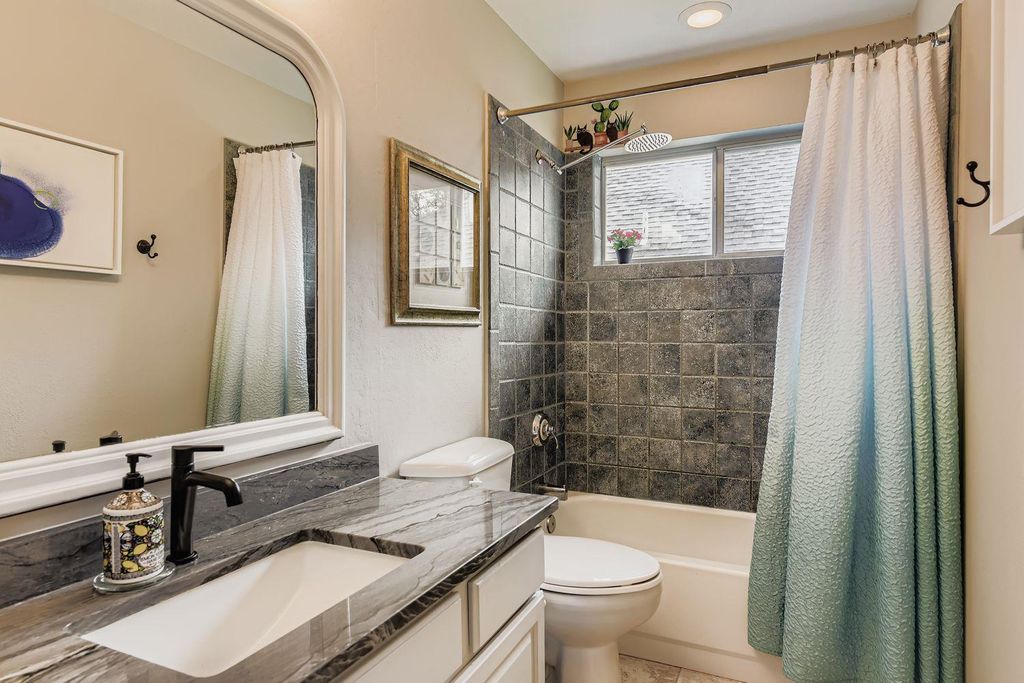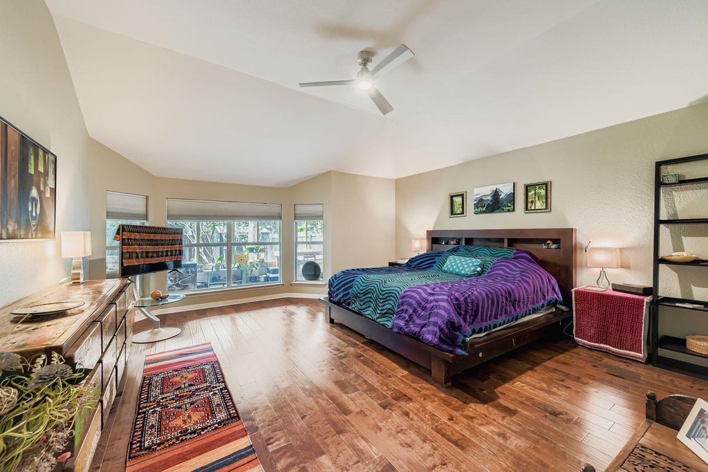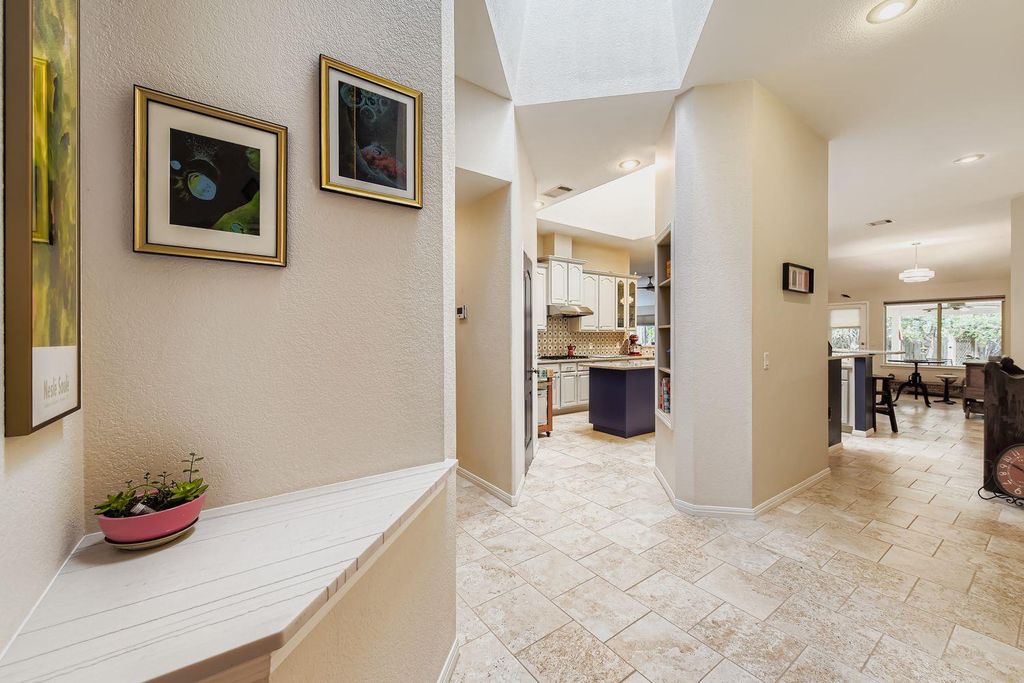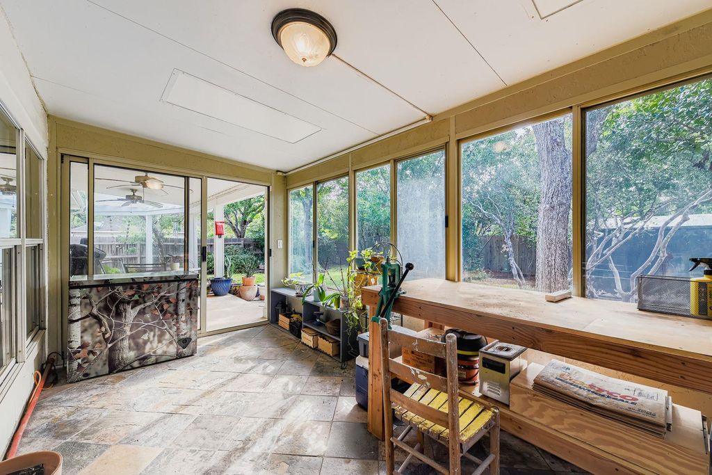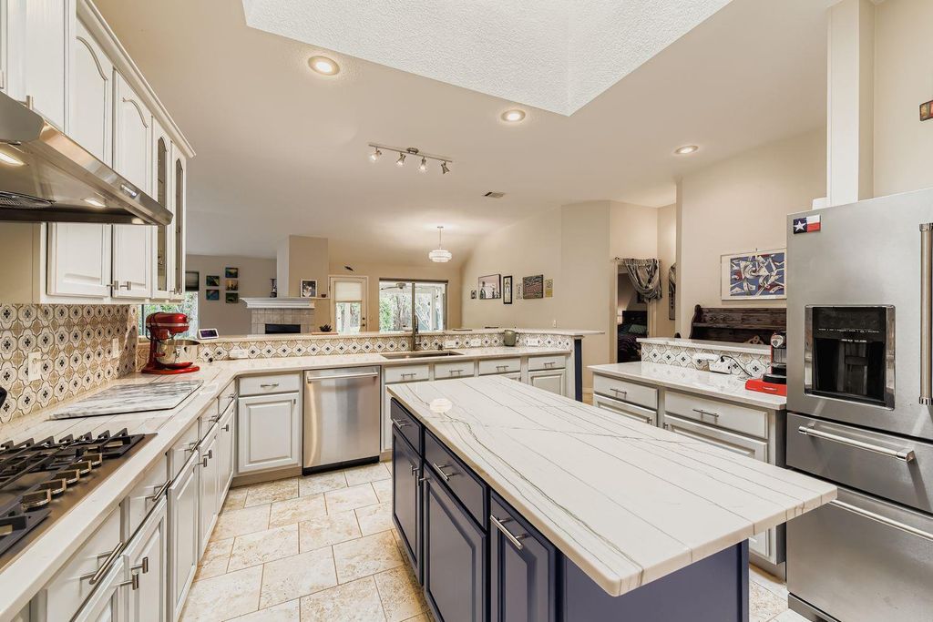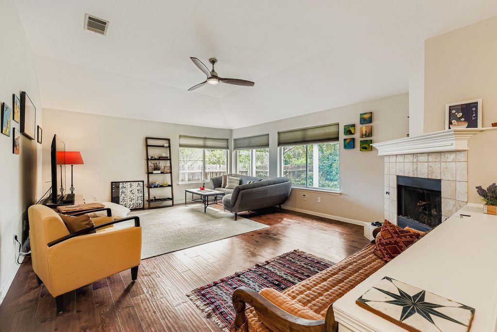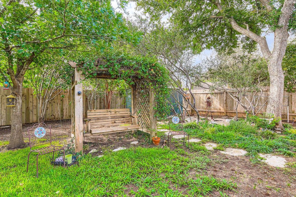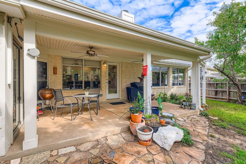 One of the largest single-story homes in Circle C, this home offers numerous upgrades inside and out. Enjoy two spacious living areas, two dining areas, and a huge library/office. The kitchen is brightened by a skylight that fills the space with natural light. The back yard has a private patio and an air-conditioned garden room. The yard feels like a private oasis with mature landscaping and a storage shed. Inside, the home seamlessly blends modern updates with timeless style, including crown molding. The formal living and dining room ideal for entertaining. The remodeled kitchen features quartzite countertops, a Bosch dishwasher and range, and a breakfast bar open to the large family room. A second skylight enhances this central gathering space. The en-suite primary bathroom includes dual vanity, walk-in shower, and ample closet space. Two updated bathrooms add convenience. One study functions as an impressive library with a full wall of bookshelves, and the second study could easily serve as an additional bedroom. Energy-efficient features include solar panels for low utility bills, a Tesla charger in the garage, and wiring for the backup generator (covers freezer, refrigerator, fans). Google Fiber is also available. The family room's gas fireplace insert provides cozy ambiance at the touch of a button.