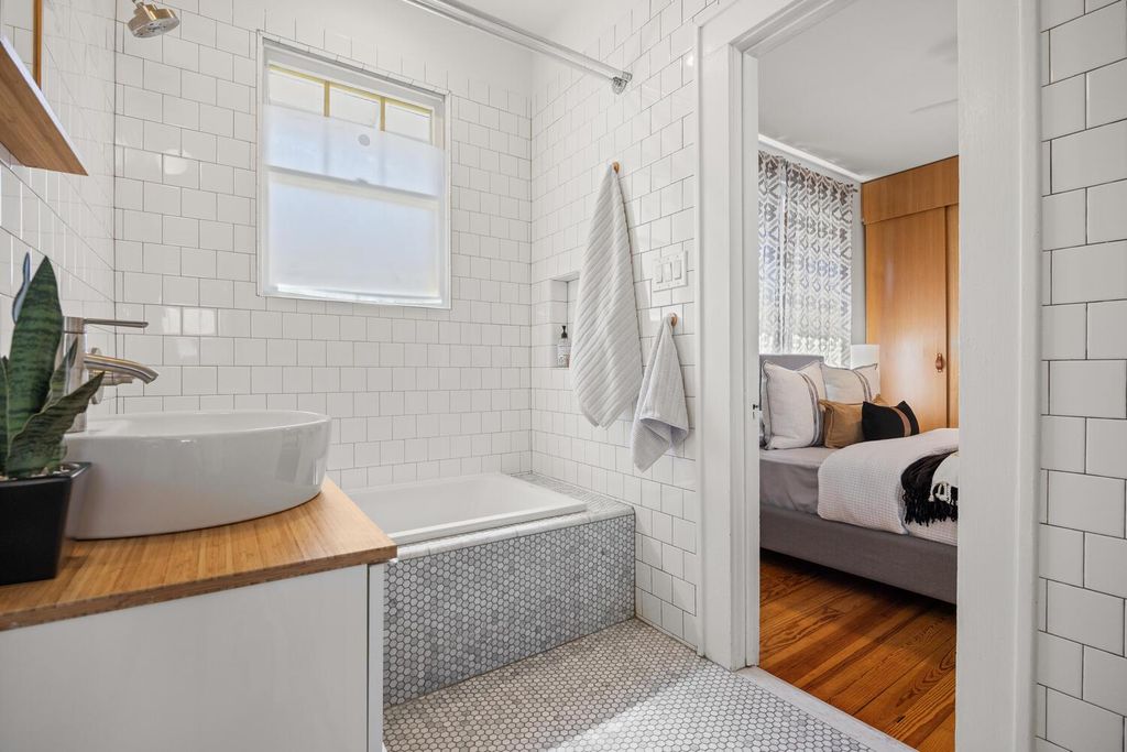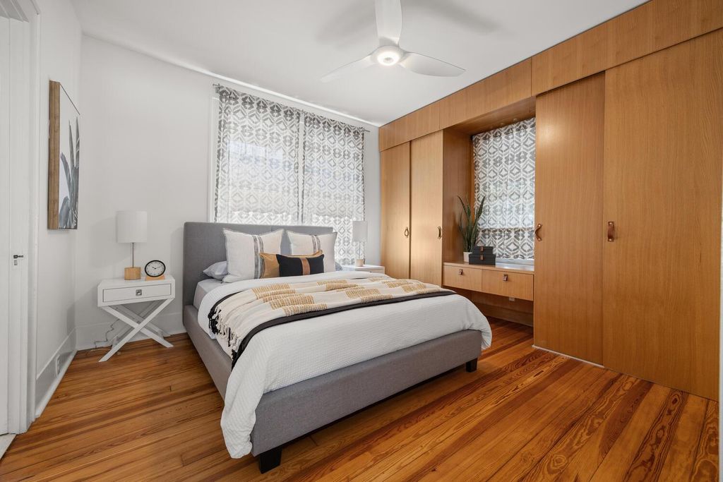 This charming two-bedroom, one-bath 'craftsman' style bungalow is located in the Clarksville neighborhood making it walkable and bikable to many great restaurants, grocery stores, Downtown, and the Lady Bird Lake trail system. The home is also equipped with sustainable features including solar panels, an electric vehicle charger, tankless water heater, and a rain barrel for both the front and back yards. One side of the home has an open living, dining, and kitchen area that opens onto a deck facing east toward downtown and overlooking the property's large rear yard. The other side of the house is divided into a main bedroom and a second bedroom/office with bath accessible from either bedroom. The main bedroom includes a large built-in wardrobe closet while the second bedroom/office has a custom-built floor-to-ceiling bookshelf. The restroom is fully tiled with marble hex floor tile and classic white wall tile. A floating vanity is topped with a vessel sink and bamboo counters. The kitchen features stainless steel appliances including dishwasher, French-door refrigerator, gas-range, quartz countertops, and a functional combination of open shelving and closed cabinetry. Unique for the area, the home also has a walk-out basement providing exceptional storage space for a small home, housing the washer/dryer, and a lockable pet door. It also provides a ready opportunity to finish-out for additional living space or accessory dwelling unit of approximately 400 additional square feet (not included in posted square footage). The front yard is naturally landscaped and includes two large steel planters excellent for a small herb garden or native plants. The large rear yard is fully fenced with a sloped grass lawn and freestanding modern gazebo. The rear of the property exits to a neighborhood alley and walking path short-cut to the major thoroughfares.