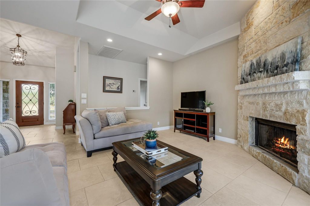 Relax and enjoy the local wildlife from the comfort of your front porch! The 11 oak trees on the property highlight the beauty of this home and invite birds, that flourish in the hill country, to join in the alluring natural surroundings. The detached garage is highlighted by a pleasant breezeway! Located only .6 miles from Hancock Park, a short stroll or golf cart ride will land you at one of Lago Vista's private lakeside parks! Inside, the open floor plan is enhanced by natural light from the many windows, elegant tray ceilings, and the thoughtfully designed open layout which includes 2 dining areas. Just off of the kitchen is a spacious mudroom, housing a sizable pantry. Built-in cabinets in the laundry closet offer additional opportunity for storage and convenient organization. This home has been carefully maintained with major updates already done for you: new roof (Dec 2024), new A/C compressor (May 2025) and A/C handlers and backyard fence replaced within the last few years. The backyard is a true delight with a producing peach tree and well established stunning rose bushes. The yard provides plenty of space for a garden, and includes a shed that conveys with the property. Washer, dryer and refrigerator also convey with the sale of this home. Owning this property includes membership to the Lago Vista POA, allowing exclusive access to 9 private waterfront parks, basketball court, boat ramps, campground, disc golf course, fishing well, fitness center, hiking trail, marinas, parks, pavilions, pool, tennis courts, pickle ball courts, playgrounds and more! With its inviting spaces and hill country surroundings, this home is ready for you to move in and make it your own!