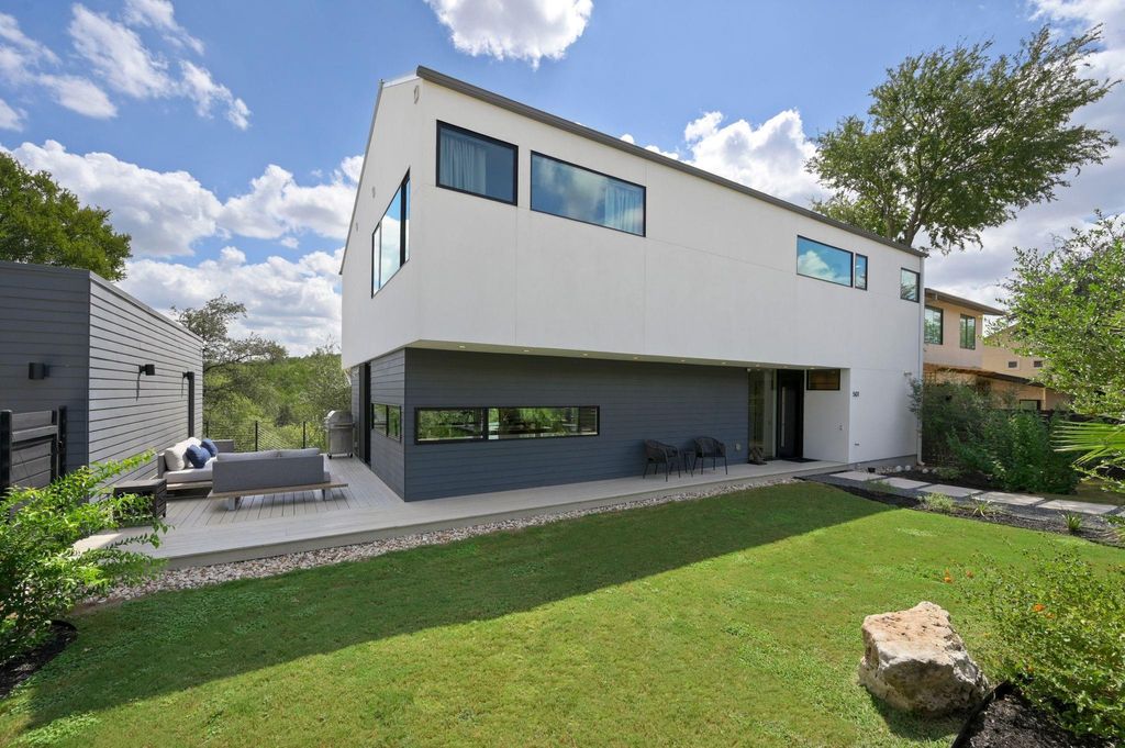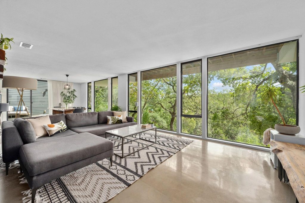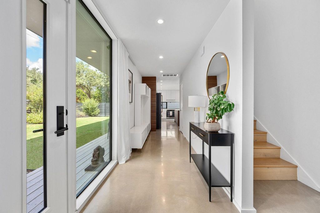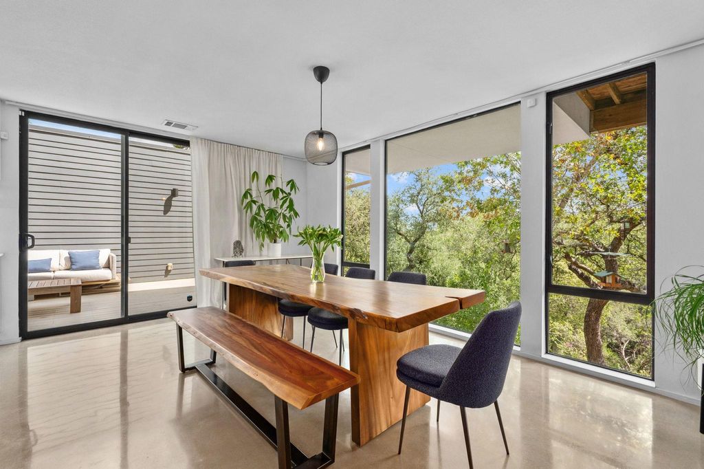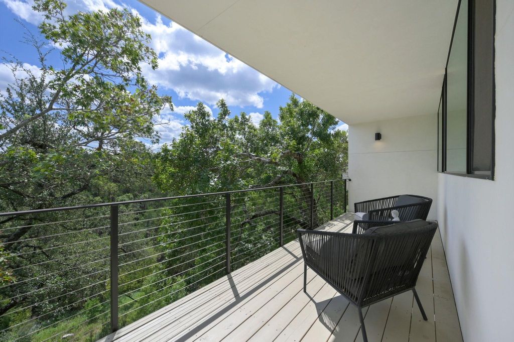 This Scandinavian-inspired home backs right up to the Balcones Preserve, giving you a private, tree-top backdrop that feels a world away from the city. Clean lines, thin-frame aluminum windows, and modern landscaping set the tone from the moment you pull up, while inside, every room is designed to feel bright, open, and connected to nature. The main level is all about easy living, an open layout with diamond-polished concrete floors, floor-to-ceiling glass, and a seamless flow between the kitchen, dining, and living areas. Morning sunrises pour in through the windows, and the views stretch out over the rolling treetops. There's also a main-floor bedroom, perfect for guests, an office, or whatever you need it to be. Upstairs, European white oak floors warm the space and lead you to a flexible loft with access to a 6' cantilevered covered balcony, one of the best spots in the home to take in the preserve views. The primary suite feels like a getaway with its spa-style bath (freestanding soaking tub included) and a large walk-in closet. Two additional bedrooms and another full bathroom round out the upper level, giving everyone their own comfortable space. Outside, a mix of xeriscape and curated landscaping creates a modern, low-maintenance curb appeal. Whether you're sipping coffee on the deck, watching the sunrise through the full-height windows, or enjoying the breeze from the balcony, this home is all about bringing the outdoors in. Located within exemplary Travis ISD and built in 2019, it's the perfect blend of design, function, and everyday comfort, modern, bright, and truly one-of-a-kind.