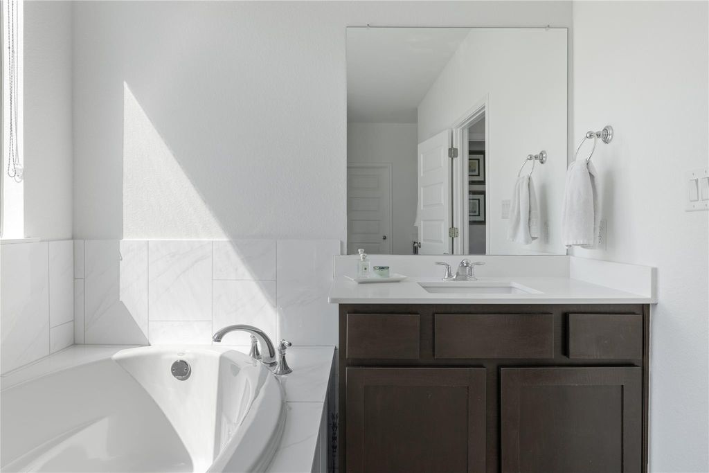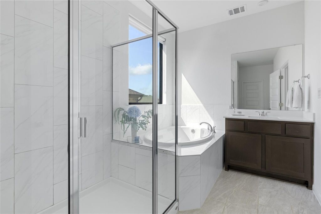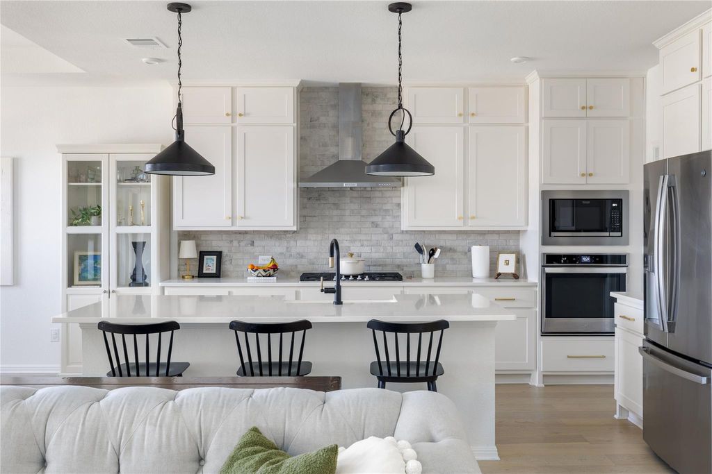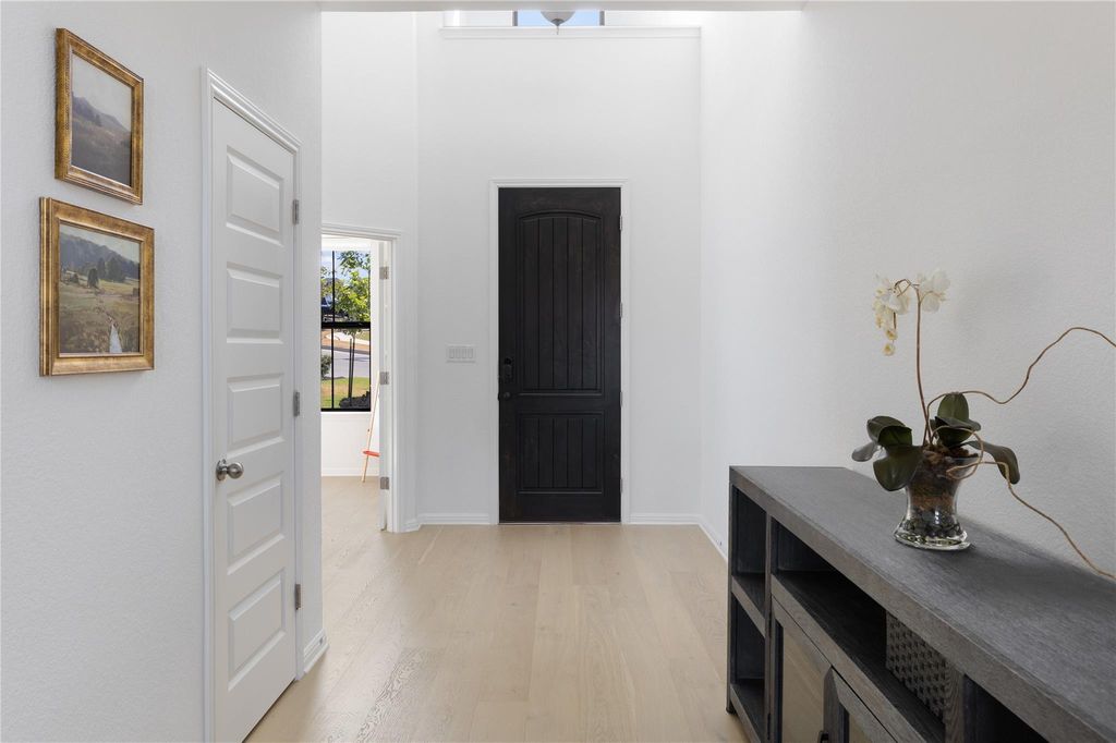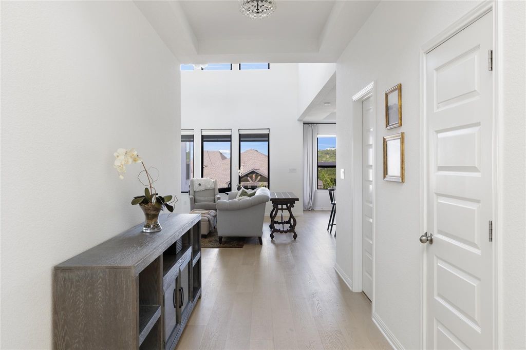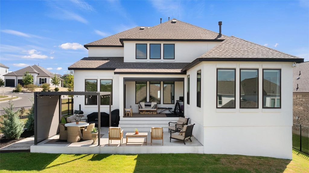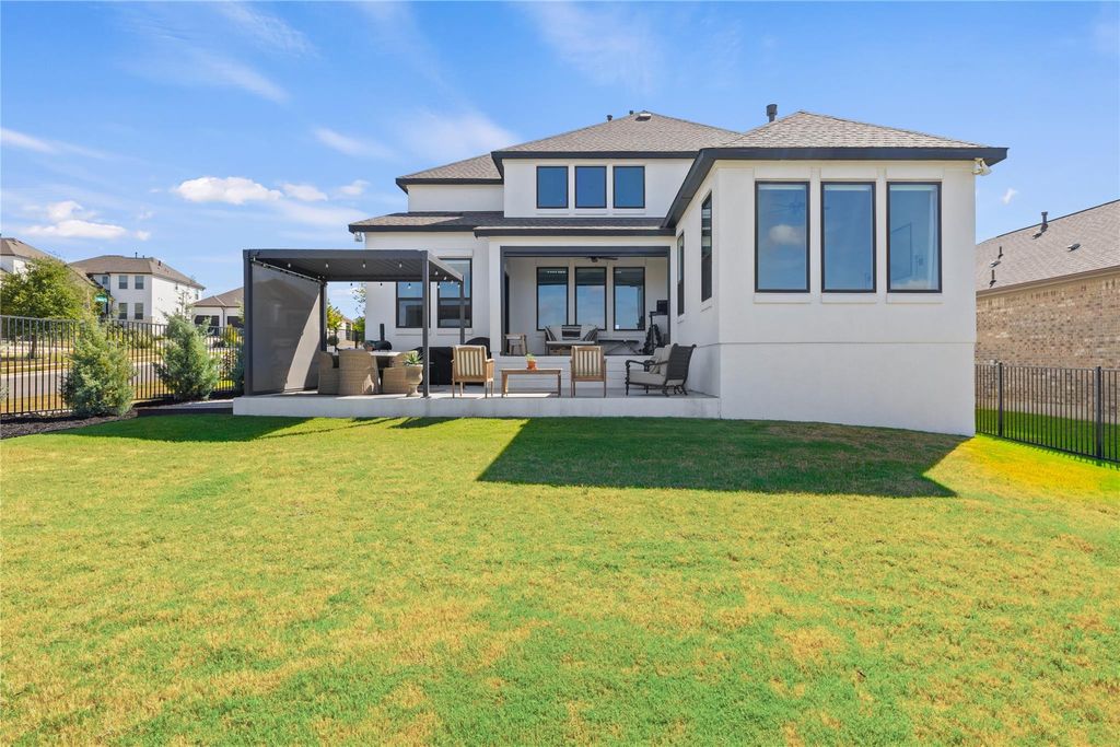 Beautifully upgraded contemporary Toll Brothers Riley Hill Country floorplan with views! Step inside to a grand entry foyer with soaring ceilings and a dramatic great room featuring two-story windows that fill the space with natural light. The gourmet kitchen opens seamlessly to the living area with a cozy fireplace, creating the perfect setting for entertaining. The spacious primary suite boasts oversized windows and a serene atmosphere, while a private home office with tall ceilings and expansive windows offers an ideal work-from-home retreat. White oak wood flooring flows throughout the main living areas, adding warmth and elegance. Enjoy outdoor living on the covered patio with views, overlooking a large fenced backyard that's perfect for relaxation or play.