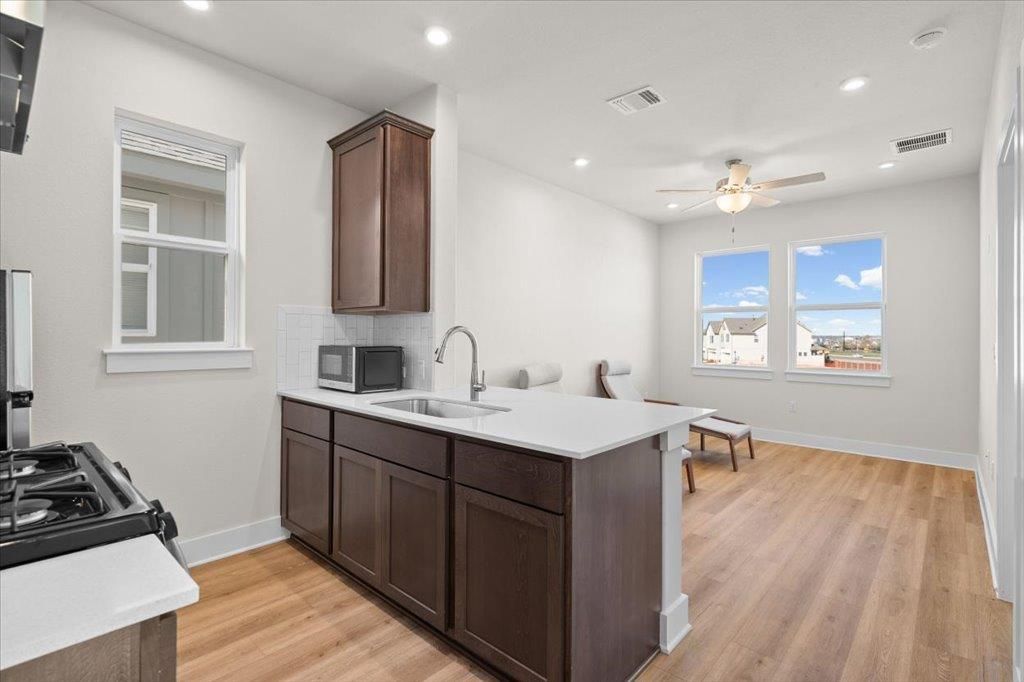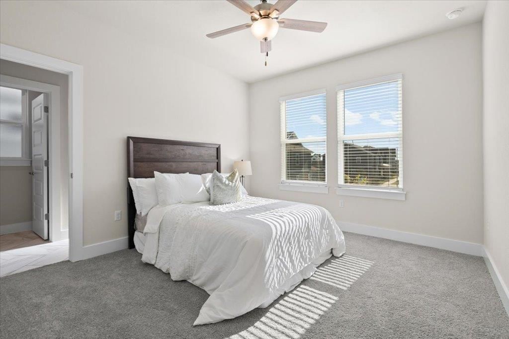 Welcome to 6416 Cowman Way, a savvy investment opportunity offering modern luxury in the vibrant Goodnight Ranch master-planned community. This unique property features a stylish 3-bedroom, 2.5-bathroom main residence plus a completely private, detached garage apartment. With absolutely no shared walls, this layout presents an incredible "house hacking" opportunity to supplement your mortgage with rental income while maintaining total privacy. The main home exudes curb appeal with a stone-accented façade and feels like new construction. Step inside to discover a pristine, barely lived-in interior defined by on-trend yet timeless finishes. The open-concept floor plan connects the living area to a chef's kitchen featuring sleek grey shaker cabinetry, expansive quartz countertops, and stainless steel appliances including a gas range. A built-in mudroom bench with cubbies adds functional charm near the rear entrance, while a pedestal powder room serves the main level. Upstairs, the primary suite offers a peaceful sanctuary with a spa-inspired ensuite featuring a dual vanity and an expansive walk-in shower wrapped in elegant marble-look tile. Two additional bedrooms provide comfortable space and share a pristine full bath with a tub and shower combination. The detached apartment is a financial asset, featuring its own private entrance via exterior stairs. It offers a living area with wood-look flooring and a fully equipped kitchenette distinctively styled with rich dark cabinetry, white subway tile, and a gas range. A separate bedroom and full bathroom make this unit completely self-sufficient. Embrace a "lock and leave" lifestyle with a low-maintenance yard. This home is walkable to pocket parks and directly adjacent to community pickleball courts and scenic ponds. Residents enjoy miles of trails, pools, and gathering hubs. Schedule your showing today!