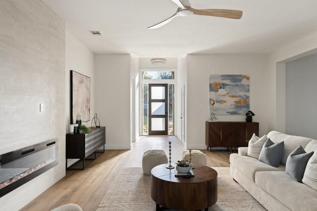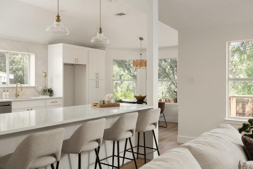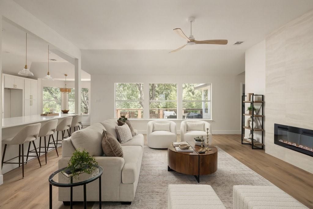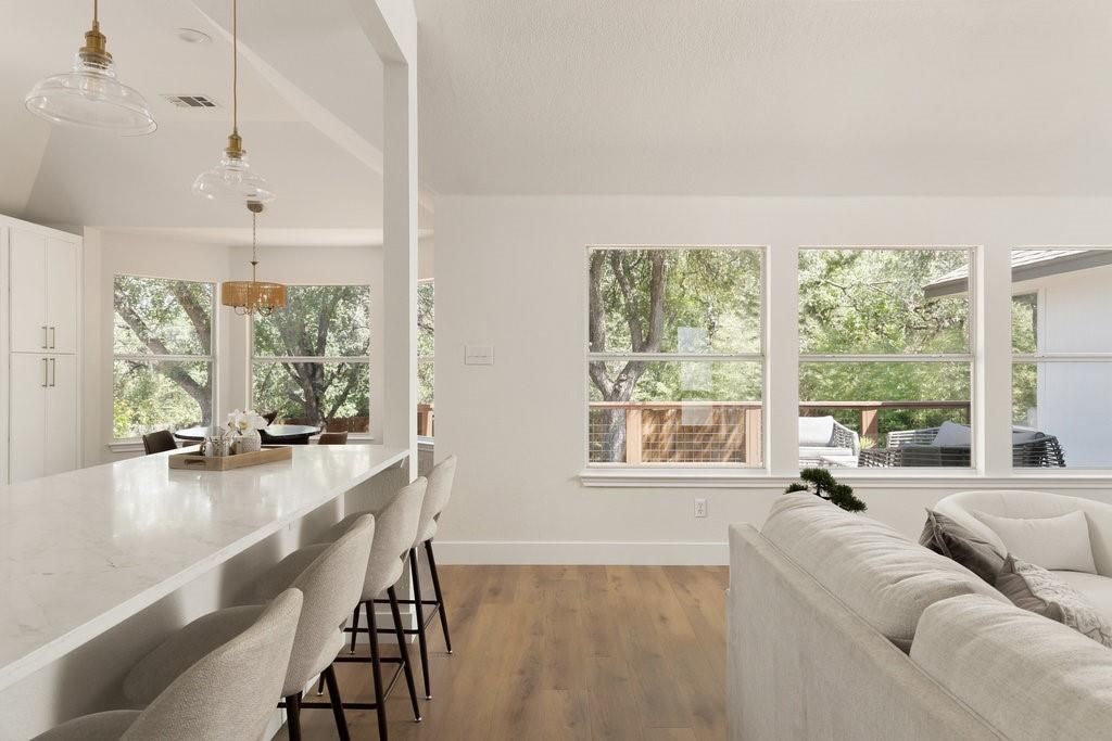 Welcome to your dream home in the highly sought-after Village at Western Oaks, ideally positioned on the greenbelt and just steps from the trailhead. This fully updated residence, flooded with natural light, offers an open floor plan with four spacious bedrooms, two full baths, and a versatile flex space perfectly suited for a home office, dining room, or playroom. Each bedroom features its own walk-in closet, while the centrally located laundry room provides built-in cabinetry and space for an additional refrigerator. The gourmet kitchen is a true centerpiece, showcasing new slim shaker cabinetry, roll-out pantry drawers, quartz countertops, and a brand-new Whirlpool 5-burner gas range with convection and air-fry settings. Flowing effortlessly from the kitchen, the expansive living room is centered around a stunning 72" Dimplex electric fireplace"”a statement of warmth and sophistication year round. The primary suite offers a luxurious retreat, complete with a spa-inspired bath featuring a free-standing tub, oversized walk-in shower, with seamless glass and a dual-sink vanity. The secondary bathroom has been fully remodeled as well, with a dual-sink vanity and a designer tile tub surround. Outdoors, relax on the updated deck while enjoying tranquil greenbelt views, complemented by fresh landscaping and the convenience of expansive under-deck storage with easy access. Additional upgrades in 2025 include a 94" front door, backdoor, 6" baseboards, recessed lighting, water heater, HVAC system, exterior hose bibs, main shut-off valve and the roof was replaced in 2018. House pre-inspected as well. All of this is paired with an unbeatable location"”just minutes from Mopac, Mills Elementary, Dick Nichols Park, Violet Crown Trail, H-E-B, Alamo Drafthouse, and a wide array of shopping and dining. Pre-inspection report in documents. Owner/Agent. Please text to show. Showings start Thursday after 4pm.