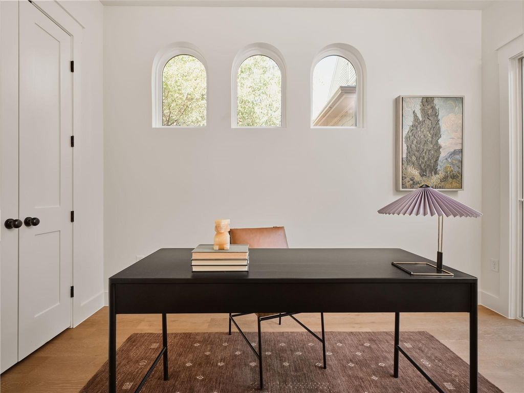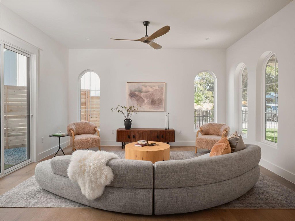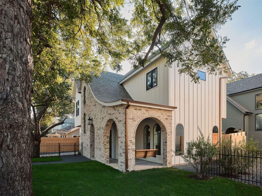 Tudor-inspired new construction by AVERY Building Co., designed by Veronica Avery with architecture by Kelley Design Group. This 2,173 sq.ft home offers 4 bedrooms, 3 bathrooms, private pool, and stunning details throughout. The exterior showcases curved windows, brick arches, and timeless craftsmanship that continues inside with archways, soaring ceilings, and abundant natural light. The open-concept floor plan connects living, dining, and kitchen, making it perfect for entertaining. The chef's kitchen features custom cabinetry and designer-selected finishes, with every detail reflecting a dedication to quality. Spacious bedrooms and spa-like bathrooms provide serene retreats, while thoughtful upgrades add modern comfort. A large gated front yard and backyard create ample outdoor space. No HOA dues or short-term rental restrictions allowing this home to offer flexibility for both personal use and investment. A rare opportunity to own a Tudor-inspired residence in the heart of East Austin.
