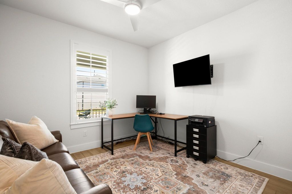 Welcome to this newly delivered, move-in-ready Easton Park home with over $50,000 in upgrades, which includes transferable builder warranties. Completed this summer by Brookfield Residential, this beautifully maintained 3-bedroom, 3-bath residence (plus a dedicated office) offers the perfect blend of modern design, elevated comfort, and effortless functionality. From the light oak herringbone floors that greet you upon entry to the custom wooden plantation shutters and upgraded fixtures throughout, every detail has been thoughtfully curated. This home is also equipped with smart home features "” allowing you to control the HVAC, locks, garage door, video doorbell, and even select appliances remotely for added ease and peace of mind. Whether you're a first-time buyer or seeking an upgrade without the wait of new construction, this home offers the perfect blend of luxury and convenience. Living in Easton Park means more than just owning a home"”it's joining a community built around connection and lifestyle. Enjoy resort-style amenities including a sparkling pool, state-of-the-art fitness center, scenic trails, parks, and a lively calendar of neighborhood events. With food trucks, live music, and community gatherings, Easton Park truly captures the best of Austin's vibrant, social spirit.