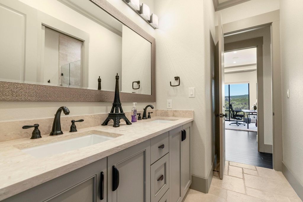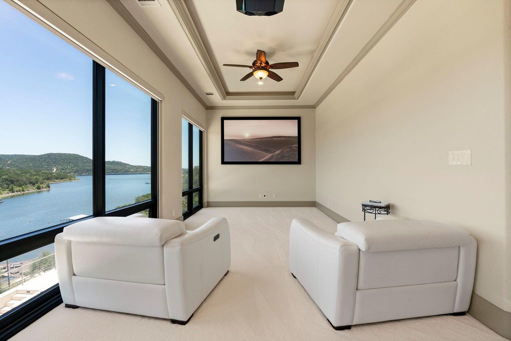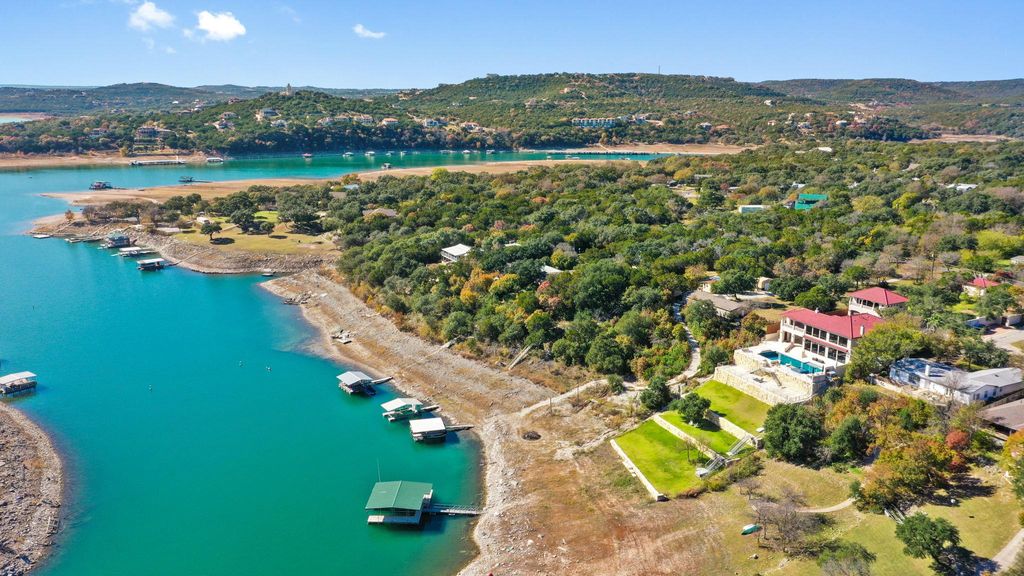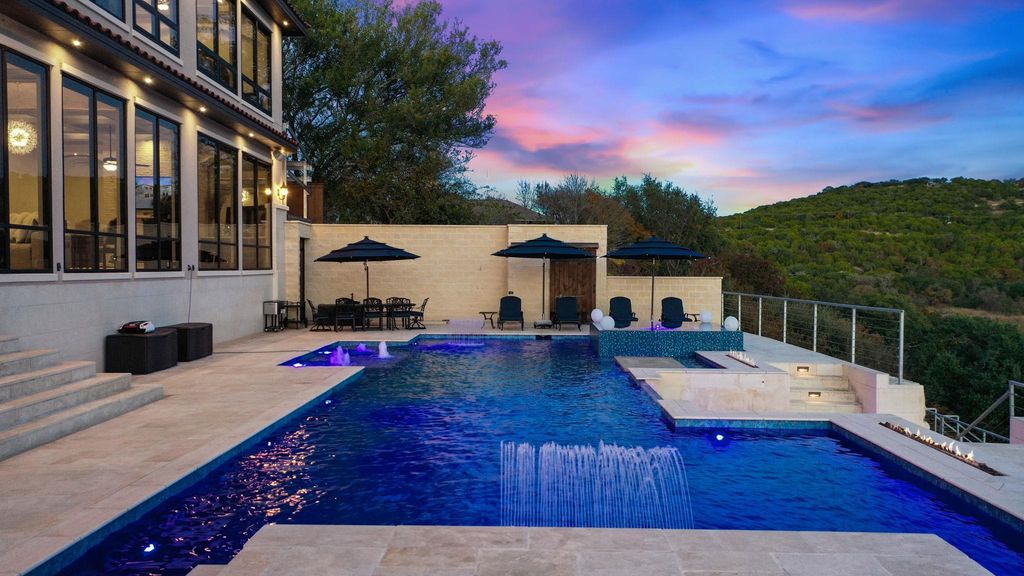 Welcome to a rare opportunity to own one of Lake Travis' most breathtaking private estates, offering 7,813 sqft of total living space across three exquisitely appointed structures: a 5,882 sqft main residence, a 1,259 sqft two-bedroom guest house, and a dedicated private gym, all nestled on a stunning, 1.98 acre multi-tiered property with direct lake access and panoramic views. The main residence is a masterclass in refined luxury, featuring five spacious rooms, four bedrooms each with its own spa-style ensuite bath, and a fifth room currently serving as a private office with access to a nearby full bath. A private elevator connects both levels of the home, while a state-of-the-art theatre room and dramatic great room with floor-to-ceiling windows showcase the lush grounds, resort-style pool, and glittering waters of Lake Travis. At the heart of the home lies a showpiece chef's kitchen, outfitted with Thermador built-in appliances, custom cabinetry, and generous prep space, designed for elevated everyday living and effortless entertaining. Outside, the estate transforms into a private resort, complete with a spectacular pool featuring a glass viewing window, a firepit lounge, and expansive outdoor living spaces designed for golden hour gatherings. Just steps from the pool, a beautifully crafted steam sauna is perfectly positioned to capture uninterrupted lake views, offering a restorative retreat like no other. The guest house provides an additional layer of luxury, with two bedrooms, a full bath, and an airy open-concept living space that opens to a private balcony. A private hillside tram gracefully connects each tier of the property, leading to your exclusive dock on Lake Travis and making lake days effortless. Fully automated with a Control4 smart home system for remote control of lighting, security, climate, and entertainment, this one-of-a-kind property is offered fully furnished, turn-key, and curated to the highest standards of lakeside living.