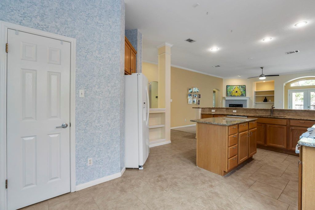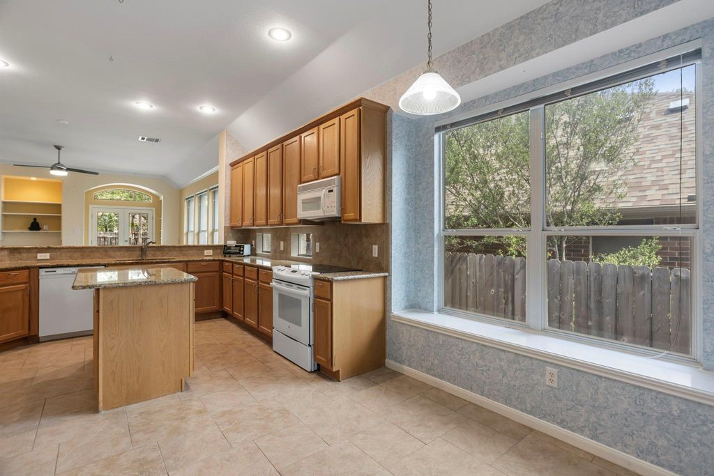 Welcome to this beautifully maintained one-story home in the highly sought-after Village at Western Oaks, located just a short walk from top-rated Mills Elementary. Still owned by the original owner! With over 2,100 sq ft of thoughtfully designed living space, this 3-bedroom, 2-bathroom home combines comfort, functionality, and an ideal Southwest Austin location. Step inside through the modern 4-panel glass front door and you'll find a versatile flex room off the entry, perfect for a home office or formal dining area. The heart of the home is the expansive kitchen featuring granite countertops, a center island, generous cabinet and counter space, a breakfast bar, walk-in pantry, and eat-in dining area"”ideal for both casual meals and entertaining. The kitchen opens to a spacious living room with built-in shelving and a cozy gas fireplace. The guest wing includes two sizable bedrooms connected by a shared flex space, perfect as a second living room, media nook, or playroom, along with a full bath. Tucked at the back of the home, the primary suite offers plenty of space for a sitting area, and features an updated en-suite bath with a modern dual vanity, frameless walk-in shower, and a large walk-in closet with custom shelving. Enjoy the peaceful backyard with its wood deck, native oak trees, and privacy"”perfect for outdoor gatherings. Additional highlights include light landscaping, a sprinkler system, a two-car garage, and a welcoming white-brick exterior. This home offers the convenience of being minutes from HEB, Costco, Whole Foods, parks, and trails, with easy access to downtown Austin and the airport. Don't miss your chance to own this exceptional home in one of Southwest Austin's most desirable neighborhoods!