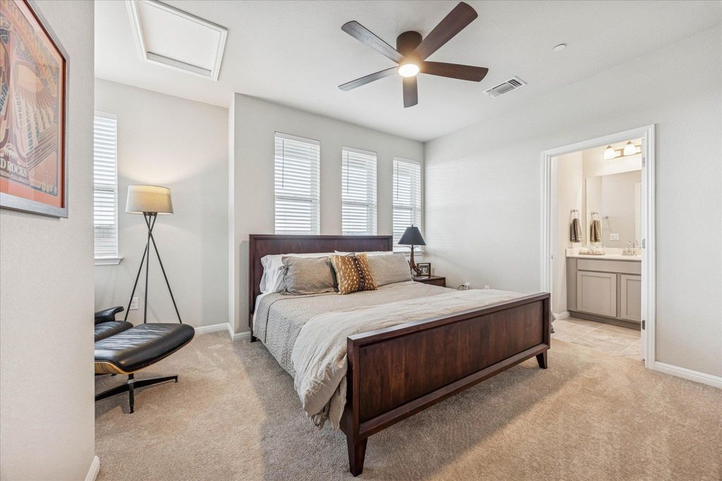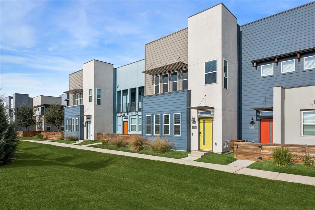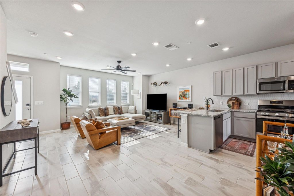 Incredible modern townhome, meticulously maintained and truly like new, located in the highly desirable Goodnight Ranch community. Enjoy a walkable lifestyle with easy access to coffee shops, dining, bars, resort-style pool, lakes, parks, and schools. The open-concept floor plan features a gourmet island kitchen with custom cabinetry, seamlessly flowing into a spacious living area filled with natural light and recessed lighting throughout. Tile flooring extends through the main level and all bathrooms, complemented by upgraded faucets, fixtures, and modern door hardware. Step outside to an inviting private patio ideal for grilling and entertaining, featuring attractive, low-maintenance turf for year-round enjoyment. The spacious primary suite opens to a private bath with a large walk-in shower, blackout curtains, modern ceiling fan, and a generous walk-in closet. The secondary bedroom offers a walk-in closet, its own private bath with a tub/shower combo, and a thoughtfully designed built-in study niche"”perfect for a home office, reading area, or creative space. Stylish lighting and ceiling fans throughout, window blinds installed, and washer and dryer convey. Exceptional value in the community"”this home truly has it all and won't last long.