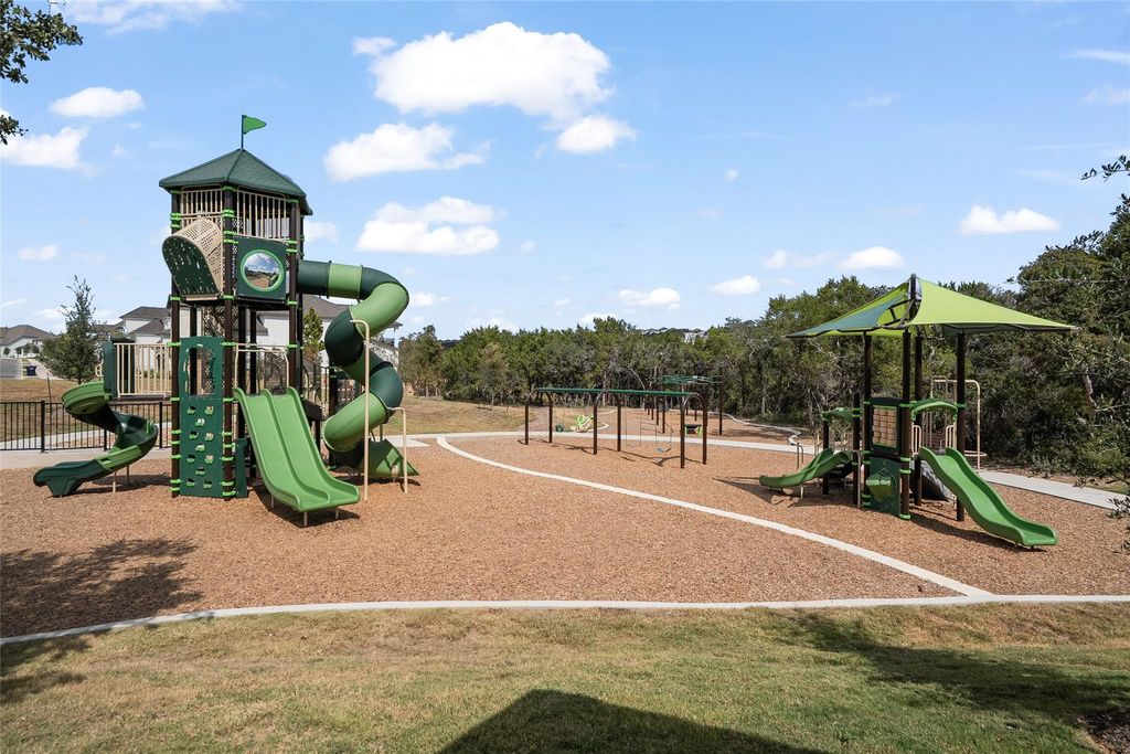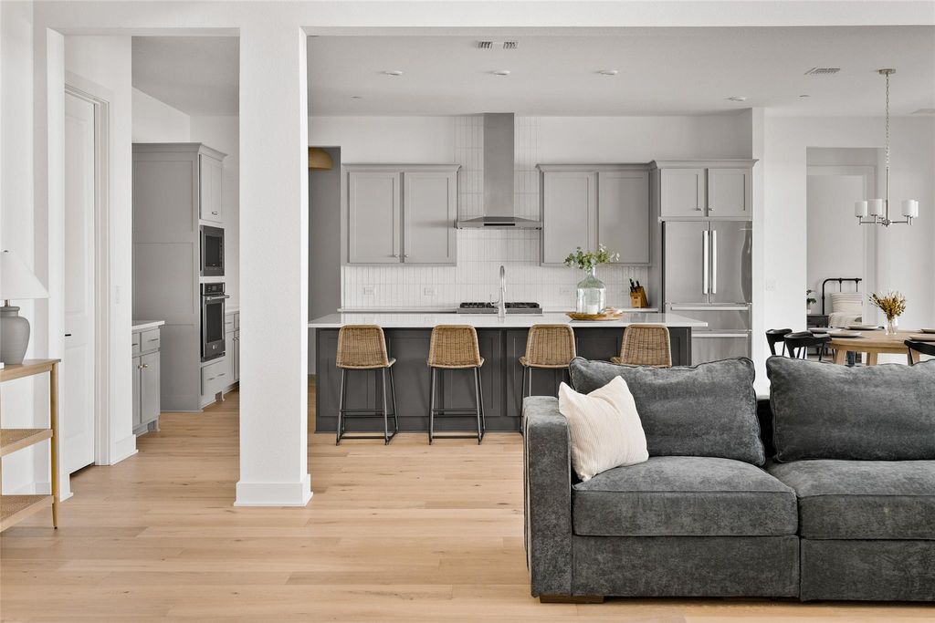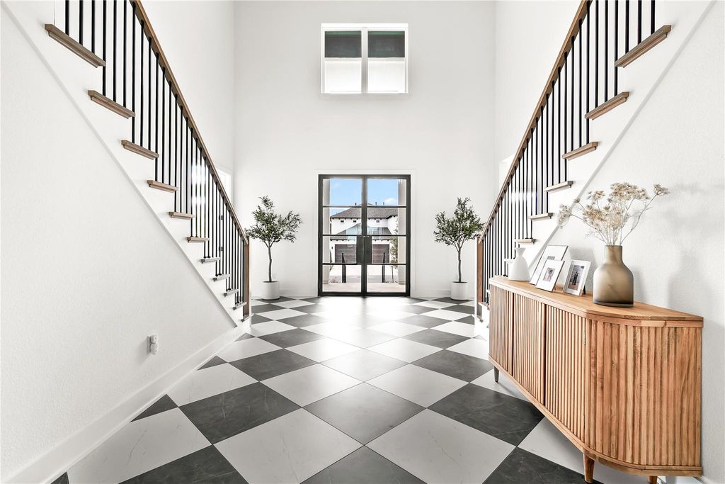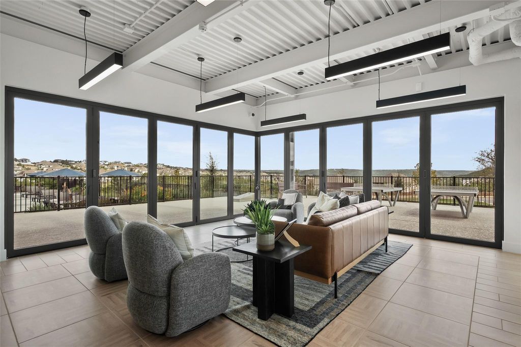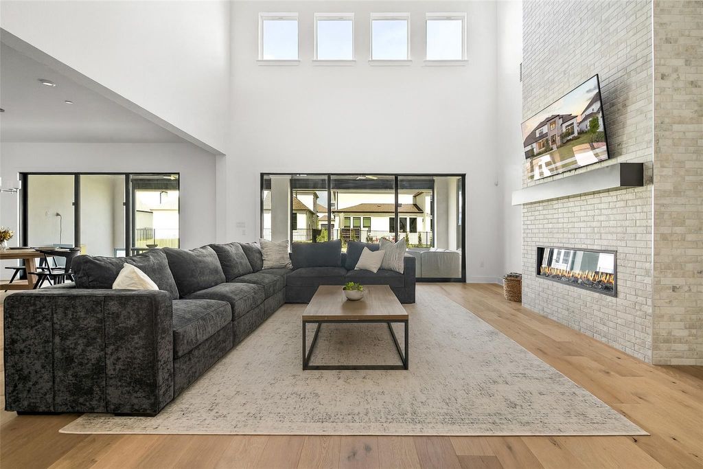 Welcome to a residence that captures the art of living beautifully. This remarkable home offers a masterful balance of sophistication and warmth, blending Transitional architecture with a modern sense of grandeur. The entry is nothing short of breathtaking, with a grand double staircase rising beneath a statement chandelier, setting the stage for what's to come. The main living space unfolds in spectacular fashion with over 20-foot ceilings, a floor-to-ceiling fireplace, and an expansive wall of sliders that blur the boundaries between indoors and out. The chef's kitchen is designed for both elegance and practicality, with a large center island, abundant workspace, and premium finishes that make it as functional as it is beautiful. The primary suite is a private sanctuary, offering a luxurious spa-inspired bath and an elegantly designed custom closet. Throughout the home, wood flooring, designer tilework, and tailored built-ins speak to a level of craftsmanship that defines true luxury. From the custom mudroom and laundry room to the grand architectural details throughout, every space has been curated for both beauty and livability. Discover refined design, exceptional craftsmanship, and timeless sophistication in the heart of Leander's premier master planned community, Travisso.
