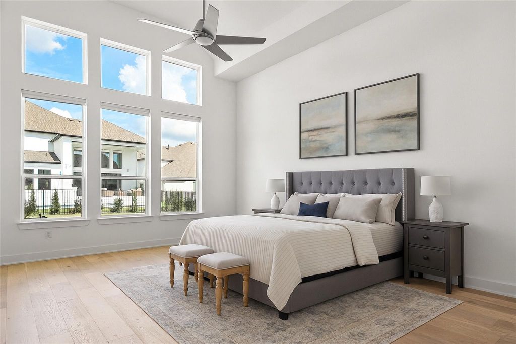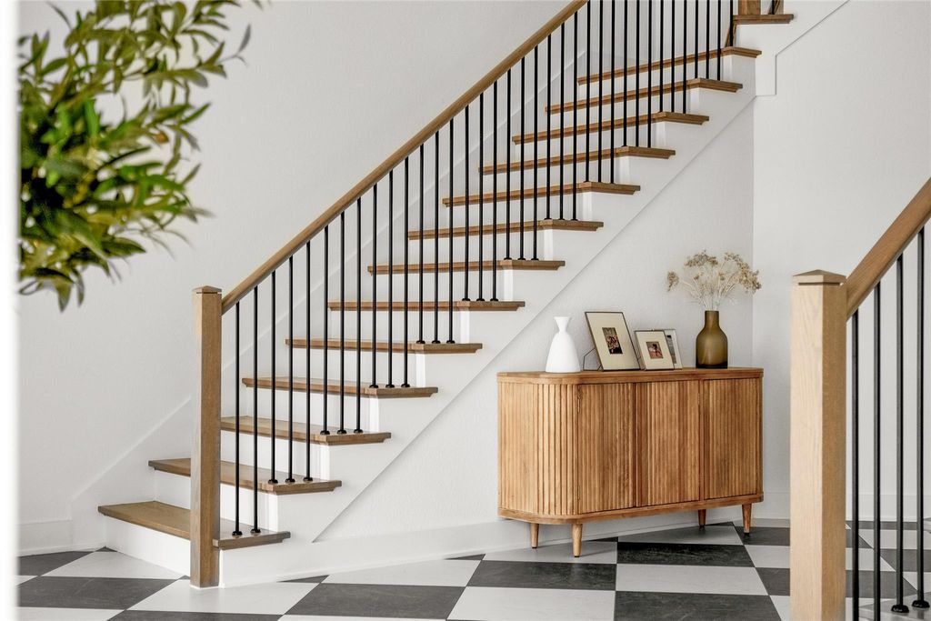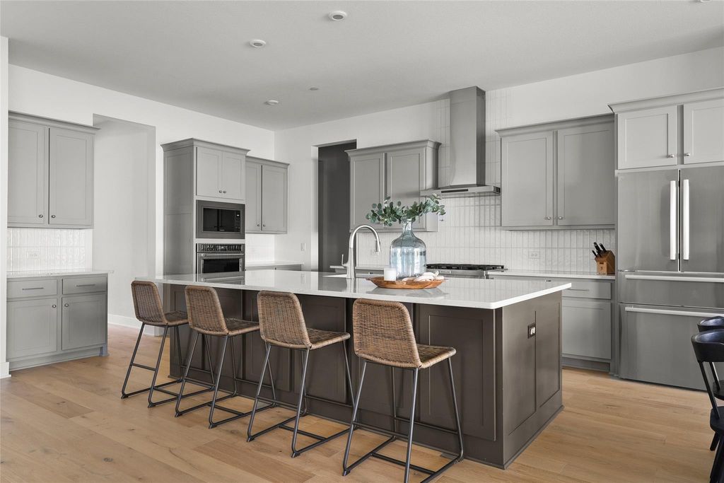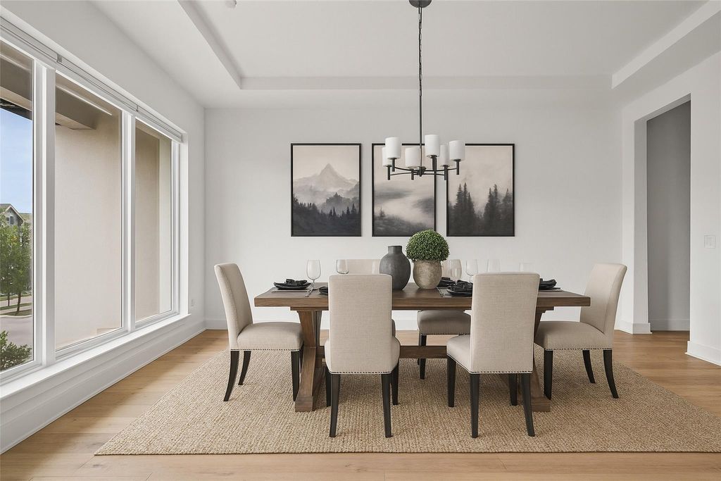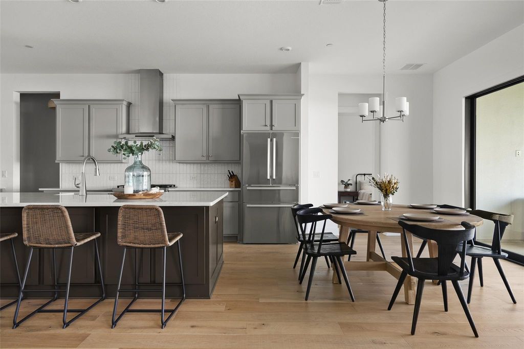 Welcome to a residence that captures the art of living beautifully. This remarkable home offers a masterful balance of sophistication and warmth, blending Transitional architecture with a modern sense of grandeur. The entry is nothing short of breathtaking, with a grand double staircase rising beneath a statement chandelier, setting the stage for what's to come. The main living space unfolds in spectacular fashion with over 20-foot ceilings, a floor-to-ceiling fireplace, and an expansive wall of sliders that blur the boundaries between indoors and out. The chef's kitchen is designed for both elegance and practicality, with a large center island, abundant workspace, and premium finishes that make it as functional as it is beautiful. The primary suite is a private sanctuary, offering a luxurious spa-inspired bath and an elegantly designed custom closet. Throughout the home, wood flooring, designer tilework, and tailored built-ins speak to a level of craftsmanship that defines true luxury. From the custom mudroom and laundry room to the grand architectural details throughout, every space has been curated for both beauty and livability. Discover refined design, exceptional craftsmanship, and timeless sophistication in the heart of Leander's premier master planned community, Travisso.
