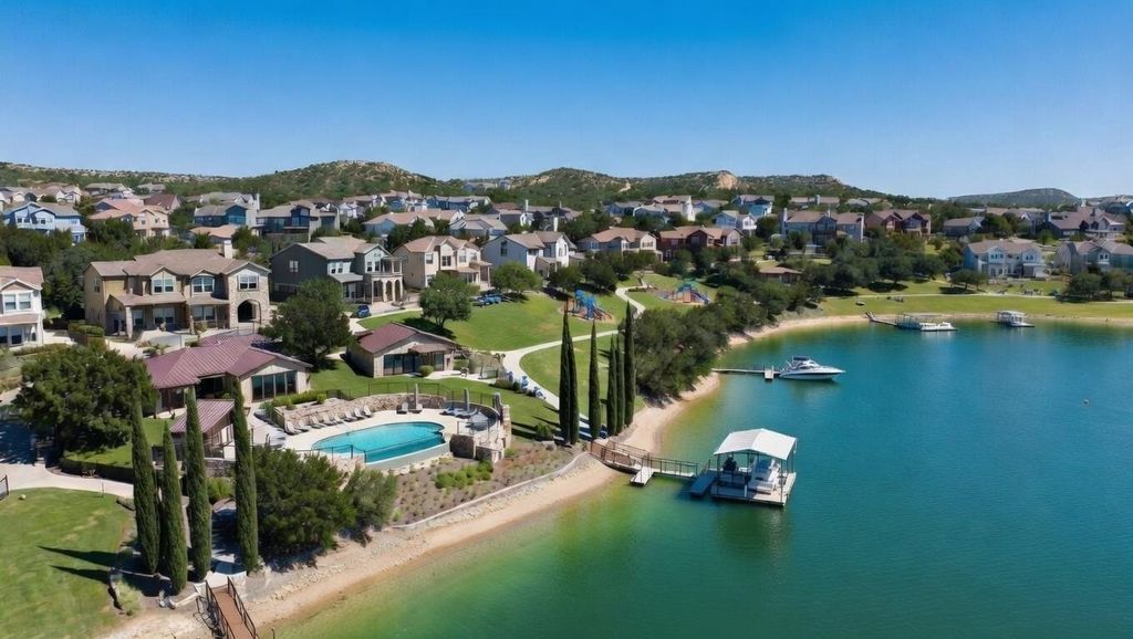 This must-see residence at 7409 Turnback Ledge in the premier Lakeside at Tessera on Lake Travis community is a modern masterpiece built in 2019 and elevated with over $150k in premium custom updates"”delivering true turnkey luxury on the north shore of iconic Lake Travis. Nestled in a peaceful court for added privacy and tranquility, this home features a 3-car garage perfect for your dream car, boat, toys, or a workshop. Just a short walk to the nearby boat ramp, you'll have effortless access to boating, fishing, kayaking, paddleboarding, and endless adventures on one of Texas's most stunning lakes. Enjoy breathtaking panoramic Hill Country views from nearly every room, with oversized windows flooding the open-concept design in natural light. High-end finishes shine throughout: a chef's kitchen with quartz countertops, custom cabinetry, and seamless hardwood floors flowing into the inviting living area anchored by a dramatic floor-to-ceiling fireplace under soaring two-story ceilings. The main-floor primary suite is a serene retreat with abundant light, a spa-like bathroom, and a spacious custom walk-in closet. A convenient main-floor guest suite with en-suite bath, formal dining room, and dedicated office with built-ins add ideal functionality for entertaining or remote work. Upstairs, a generous game room/bonus space awaits for family fun, plus three additional bedrooms and two full baths. The beautifully landscaped, drought-tolerant backyard features a covered deck"”your private oasis for grilling, relaxing, and soaking in those serene Hill Country vistas. In the award-winning Lakeside at Tessera community, residents love the resort-style amenities including an infinity-edge pool with splash pad, private HOA boat launch and dock, over a mile of lake shoreline with beach access, miles of scenic hike and bike trails, playscapes, sand volleyball, and open-air event pavilion.