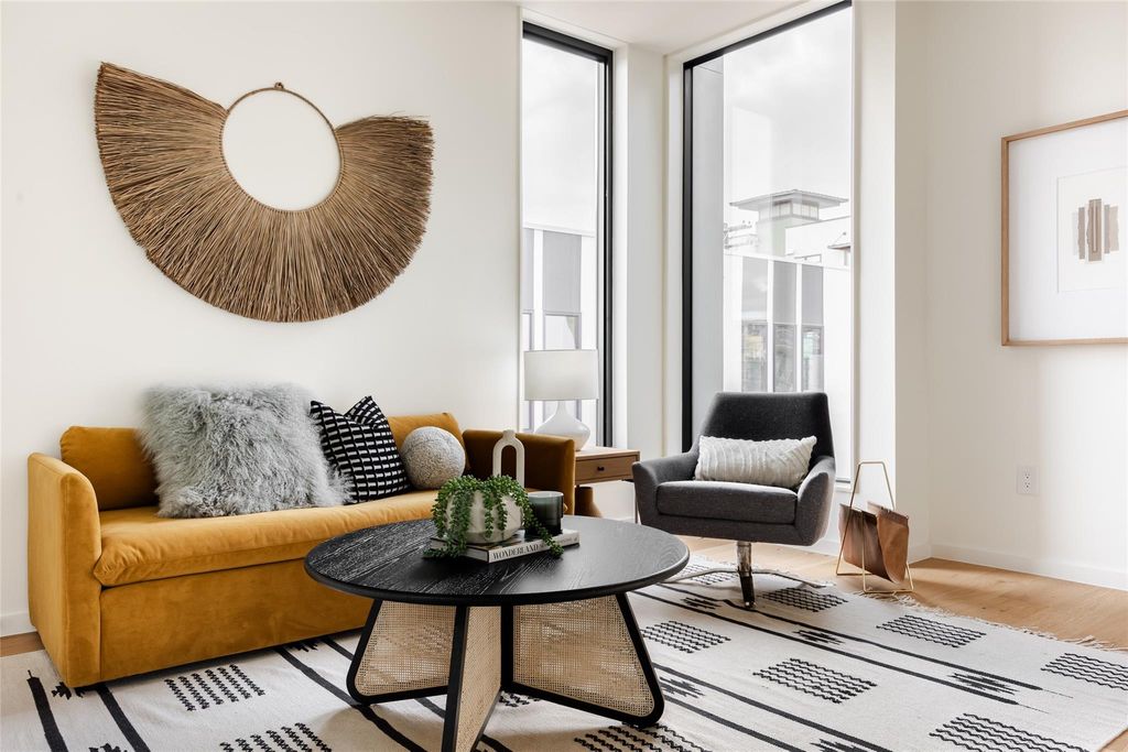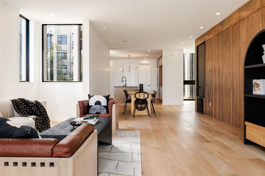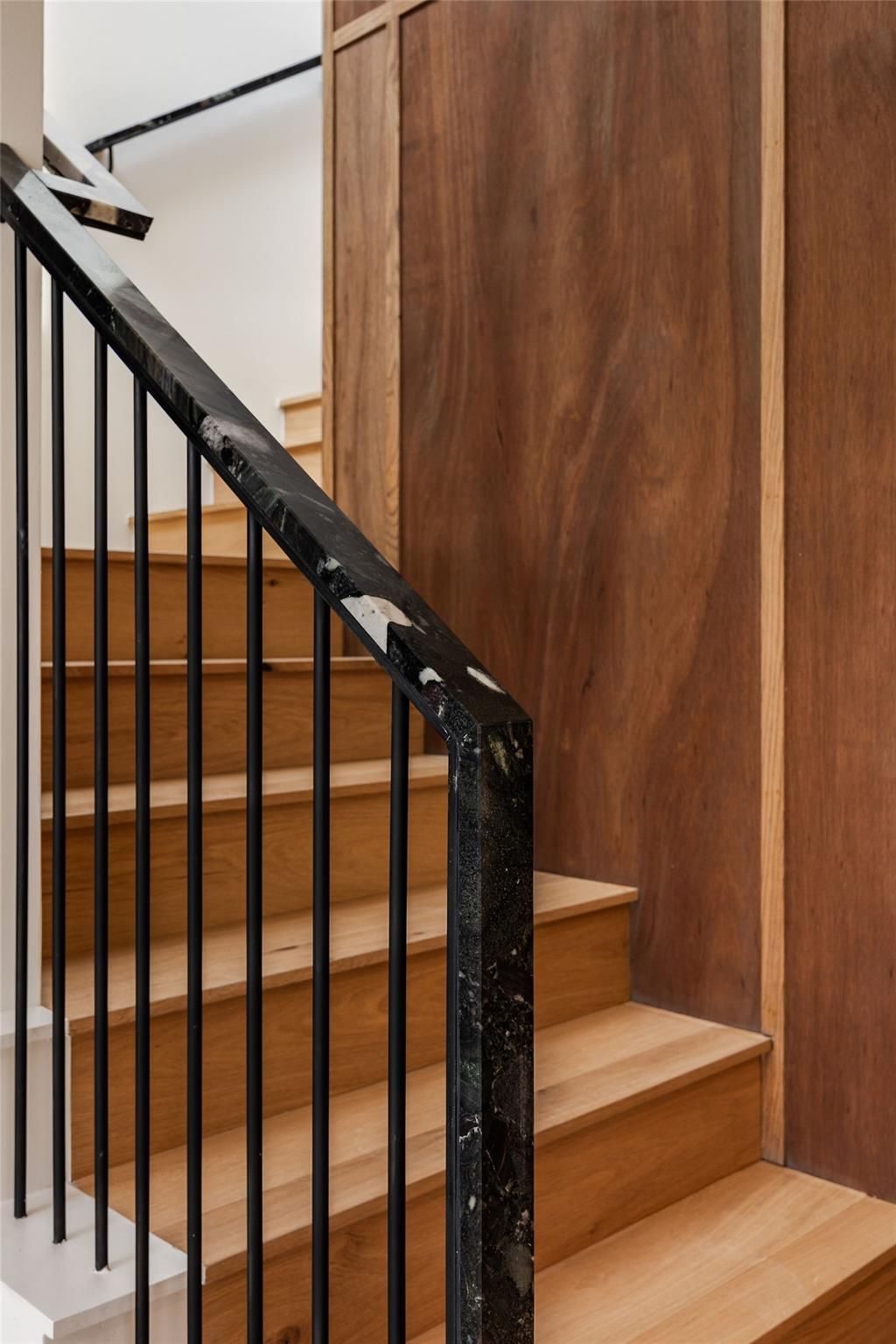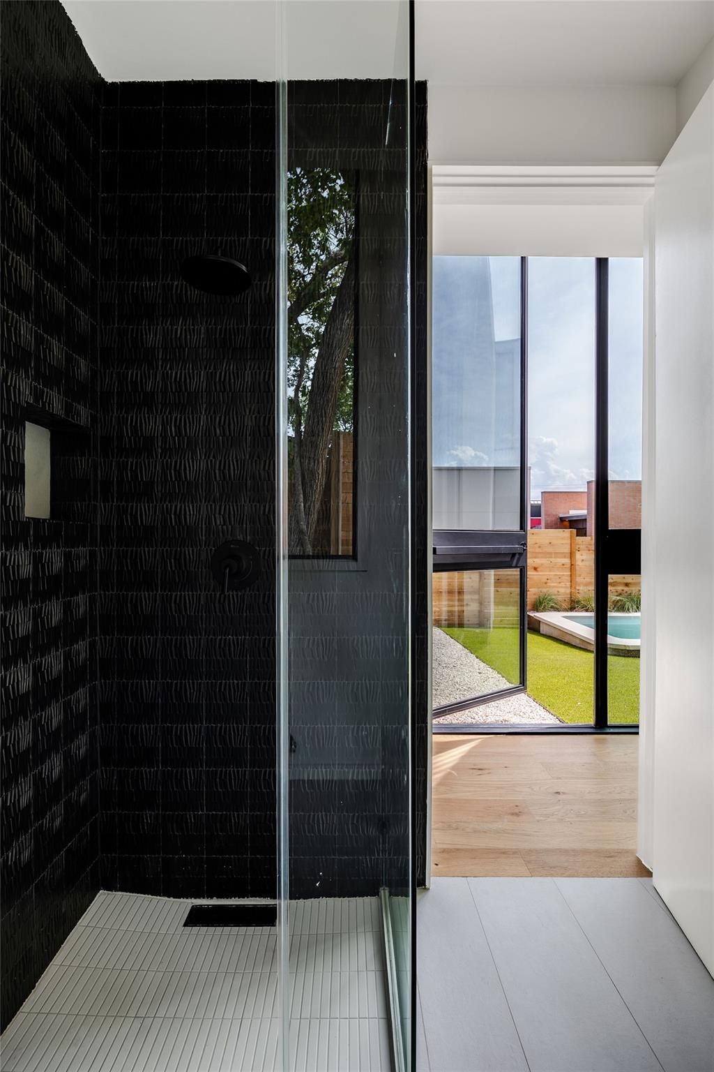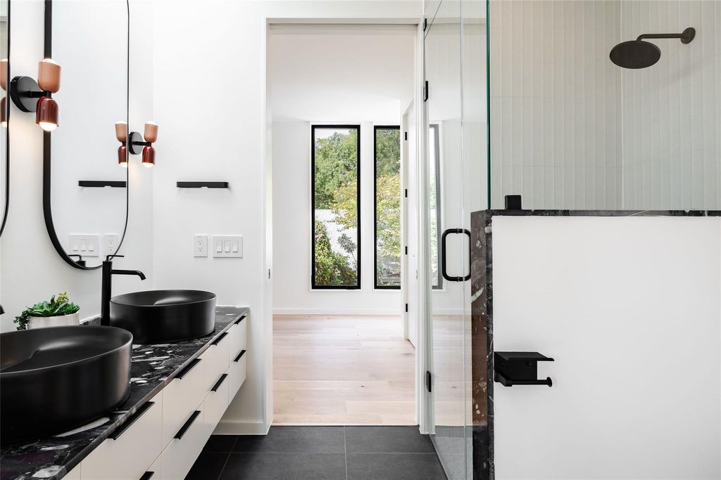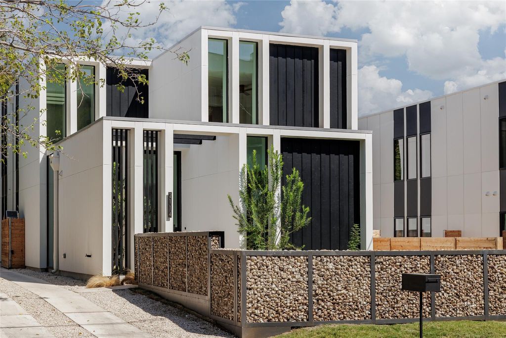 Dubbed "Fred" by architect North Arrow Studio with build and interior finishes by Cary Paul Studios, 2114 Lawnmont has strong lines created by wing walls that continue from foundation to roof. The wing walls keep rhythm along the exterior and project beyond the facade, while the front entry features a stunning 12' tall pivot front door, which is set back to create a private screened entry courtyard. Ebony stained wood siding adds warmth when contrasted with the soft white stucco walls. Custom steel architectural door systems throughout the property bring in natural light. On the interior, an oak feature wall wraps from the living room and continues all the way up the staircase, and is accented by stunning skylights and custom steel and palladium marble handrails. The main home features 4 bedrooms and 3.5 baths, while a detached 2-car garage includes a guest cabana with a flexible space suitable for a bedroom or office, complete with a full bathroom. The two structures are connected via a fully landscaped yard with xeriscape and drought proof turf with a spacious modern pool and a hidden outdoor shower. The spacious custom kitchen is a culinary enthusiast's dream, with a custom paneled oak island accented with Ann Sacks backsplash tile. Top-of-the-line appliances include a panel-ready fridge and dishwasher, floating shelves and a serving area. The expansive butler's pantry features a built in microwave and an array of open and hidden storage. The laundry room, conveniently located off the kitchen, stuns with marble counters and a custom peg wall. Boutique custom cabinetry and tile can be found throughout. The primary bedroom boasts an en suite bath with a luxurious Japanese soaking tub, a spacious walk-in shower, and a double floating vanity. Just steps to local restaurants and shops along the Burnet Road corridor, this home is the epitome of urban living with an established neighborhood feeling.