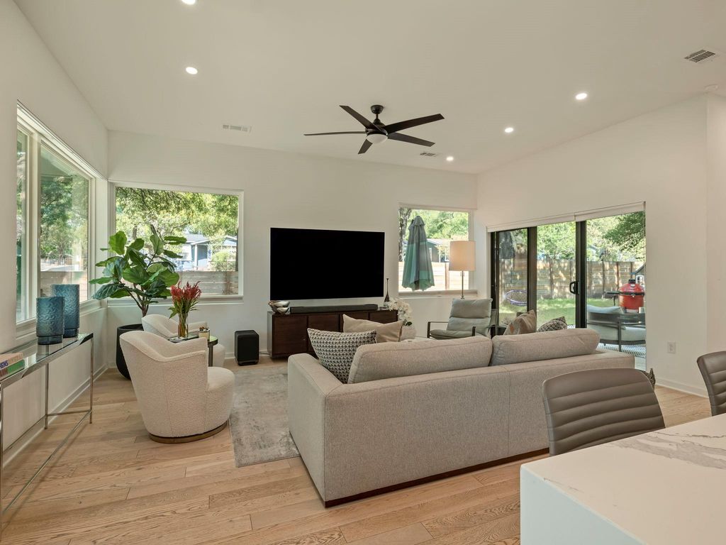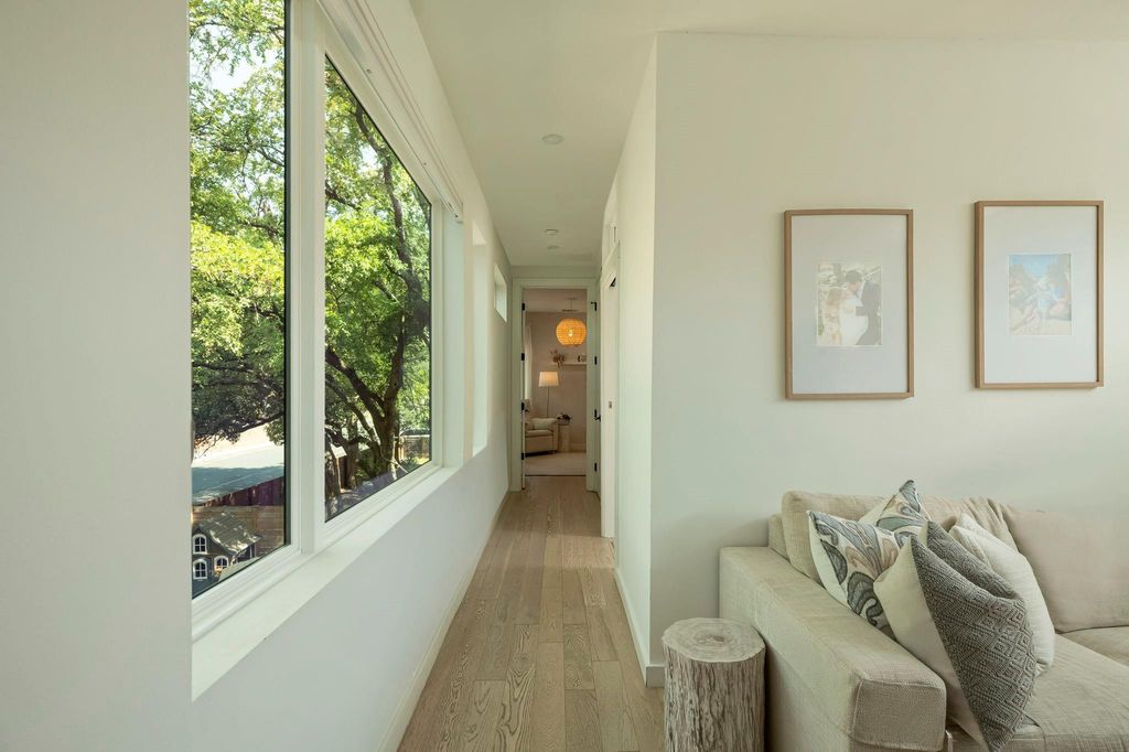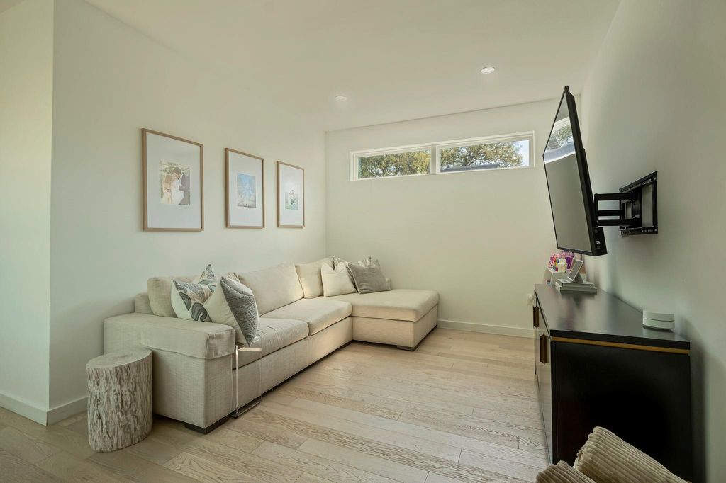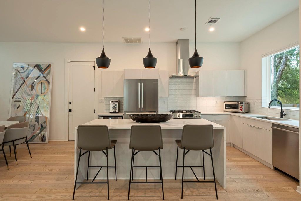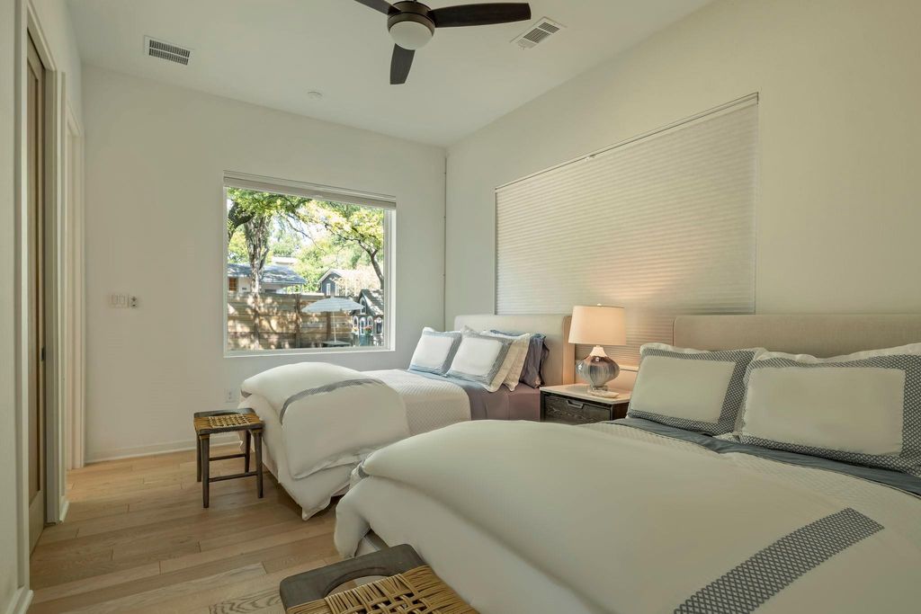 Located in the St. Elmo District / South Manchaca neighborhood along a quiet tree-lined street, this corner property lives like a single-family home. Completely fenced and gated, it offers privacy with both a front yard and a backyard shaded by mature Live Oak and Elm trees. This thoughtfully designed 3-bedroom, 3-bathroom home also includes a detached bonus studio for use as an additional room, gym, office, or creative space. Inside, the open layout features window shades and hardwood floors throughout, a kitchen with a large center island and bar seating, and a dining area slightly set apart yet still connected to the family room, an excellent layout for everyday living and entertaining. Natural light fills the interior, creating a bright, inviting atmosphere. The main level includes a full bedroom and bath, ideal for guests or in-laws, while upstairs you'll find another guest room and the primary suite with a spa-like bath and private balcony. All bedrooms feature generous walk-in closets, with the primary suite offering an especially oversized one. Large windows frame tranquil treetop views, adding to the serene backdrop. With modern finishes, flexible living areas, and a prime location just south of 78704"”minutes from favorites like Radio Coffee, Veracruz, and more local spots, this home combines comfort, style, and convenience.
