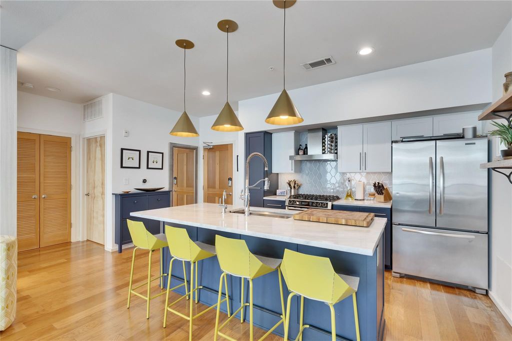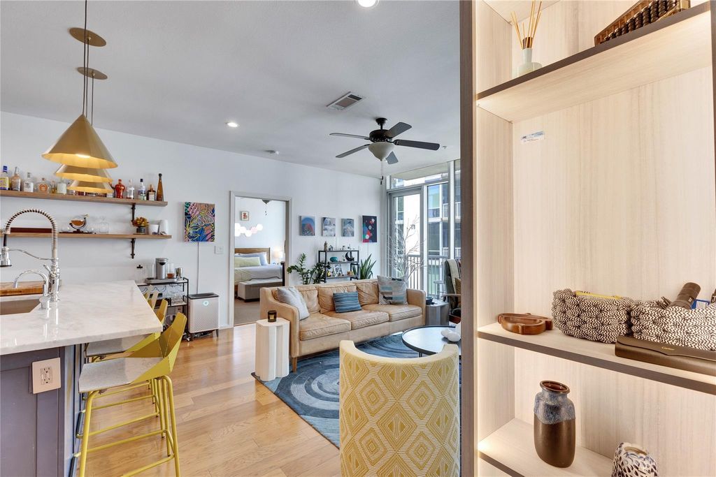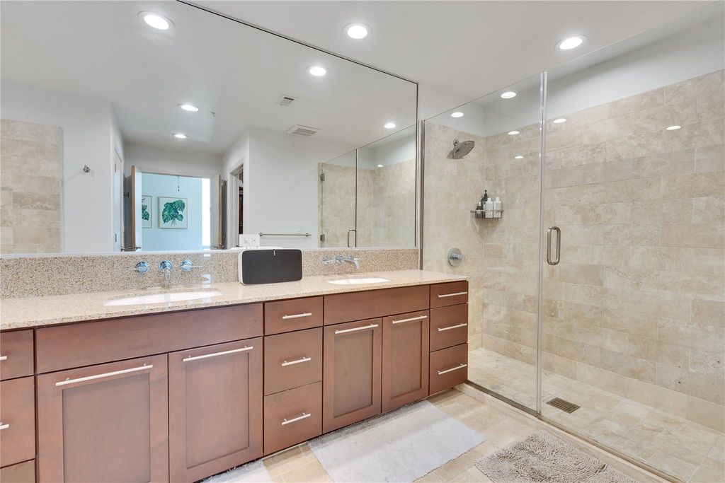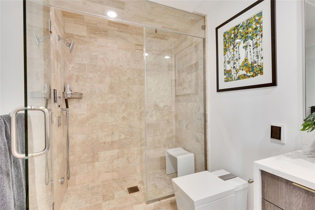 High-end upgrades and thoughtful design make this 4th-floor 2-bedroom, 2-bath condo at Barton Place truly one of a kind. This unit includes two EV-ready reserved parking spots on the main level, conveniently located near the elevators for easy access. Inside, you'll find luxurious touches like Carrera marble counters, brushed gold pendant lighting, and a 52-bottle under-counter wine fridge. Floor-to-ceiling windows fill the living room with natural light, where a custom 18-foot built-in adds significant storage, a sleek marble-topped desk, smart-lit bookcase, and standout entry feature. Crisp LED recessed lighting has been installed throughout. The second bedroom sits beside an upgraded guest bathroom featuring a steam shower, waterfall quartz vanity, and added outlets, while all windows are equipped with room-darkening shades. A tankless water heater complements the existing unit, enhancing efficiency. Across the living space, the spacious primary suite easily fits a king bed and desk, with an en-suite bath boasting a soaking tub, walk-in shower, and enhanced electrical upgrades in both the vanity and private toilet area. Overlooking the serene courtyard, this meticulously upgraded condo is a rare gem in the community. Schedule a showing today!