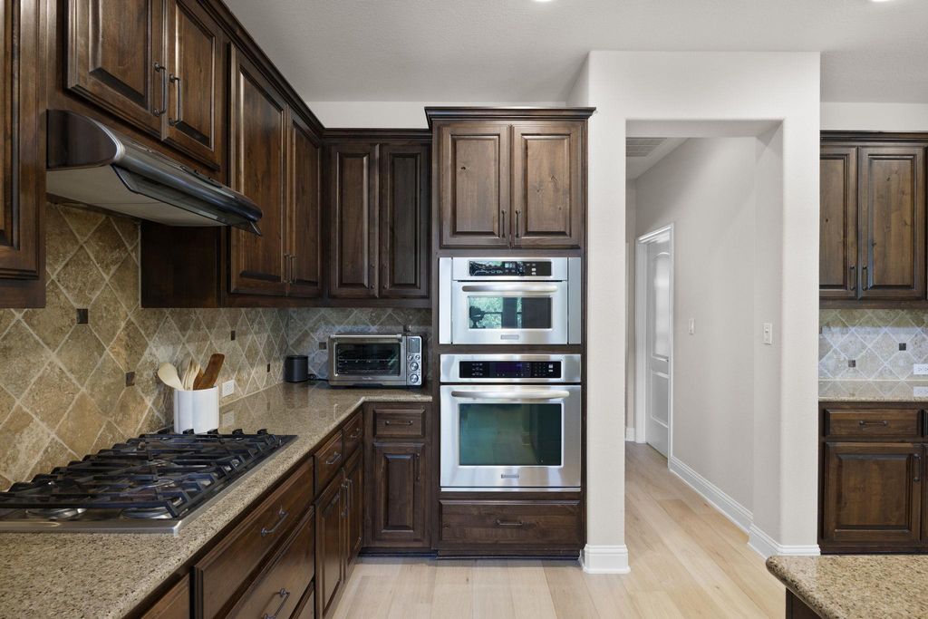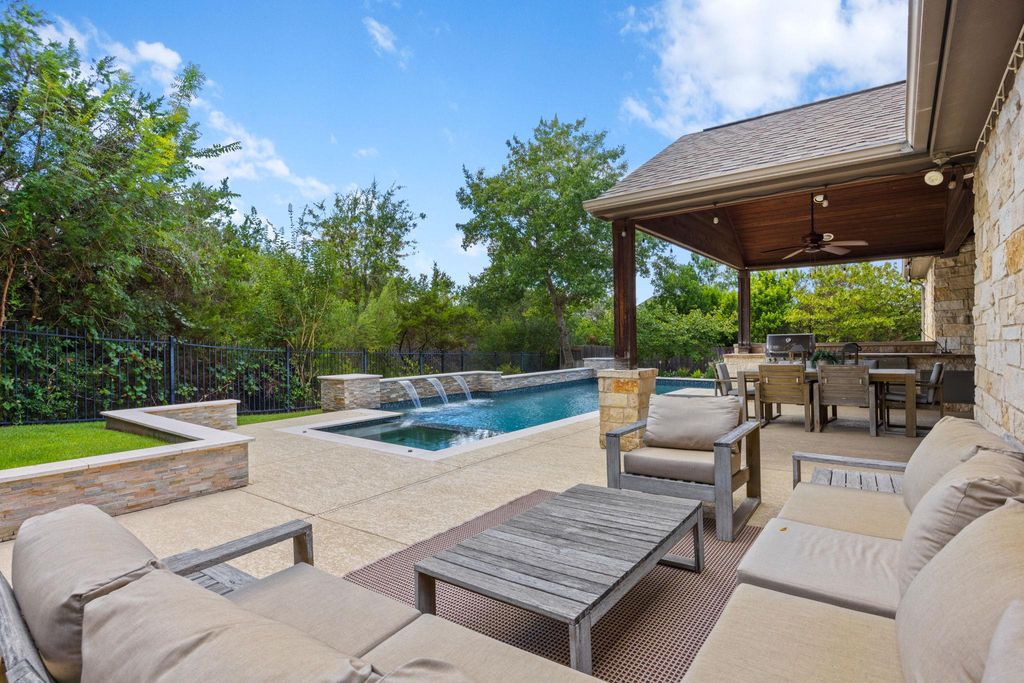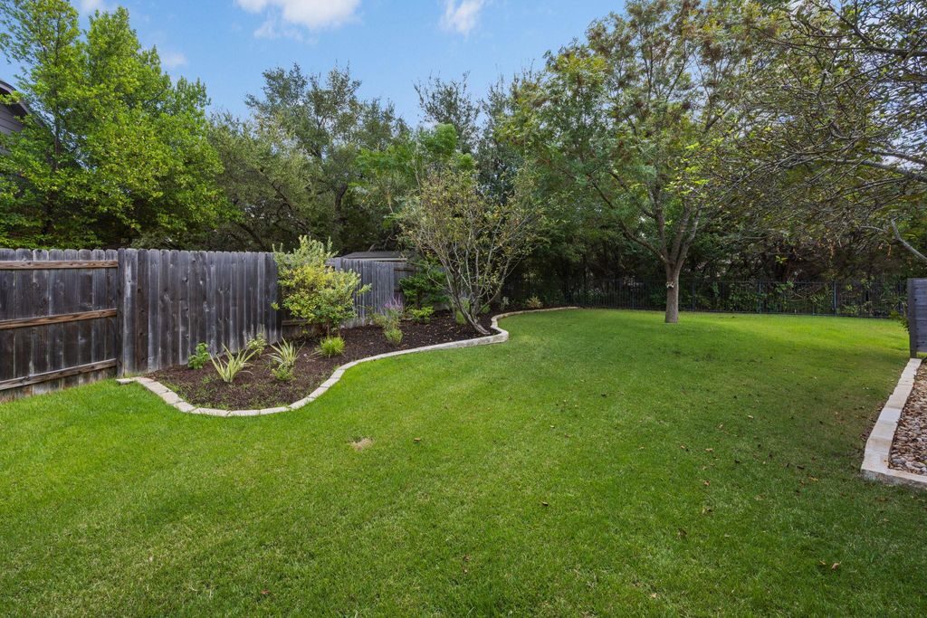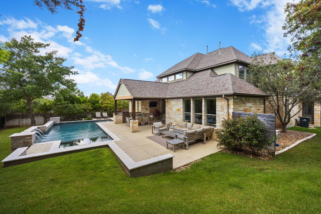 Situated on a quiet cul-de-sac in Steiner Ranch, 1313 Nova Court is a well-maintained 4-bedroom, 3.5-bathroom home designed for comfortable living and easy entertaining. The home includes a family room, den, formal parlor, game room, pool, spa, and outdoor kitchen. The main level features wood flooring throughout. The spacious family room has a gas log fireplace with a masonry surround, high ceilings, and large windows overlooking the patio and pool. The island kitchen includes granite countertops, a stone tile backsplash, a walk-in pantry, 42-inch upper cabinets, and a 9-foot ceiling. The breakfast area offers a pendant light fixture, recessed lighting, and crown molding. The parlor, with large windows facing the backyard, includes a ceiling fan, crown molding, and wood floors"”ideal for relaxing or hosting guests. The master bedroom features a 10-foot ceiling, a lighted ceiling fan, crown molding, and a walk-in closet. Its bathroom has a garden tub, a separate shower, dual vanity sinks, a private water closet, and a linen closet. The den, with direct garage access, includes two large closets, wood flooring, recessed lighting, a ceiling fan, and a window with 2-inch blinds. This flexible space can serve as an office or guest room. Upstairs, three bedrooms, each with walk-in closets and ceiling fans, provide ample space. The game room, with a high ceiling, lighted ceiling fan, and carpeting, is great games, movies, or hobbies. The backyard, backing to a greenbelt for privacy, features a nice mix of landscaping, a covered and uncovered patio, a pool, a spa, and an outdoor kitchen with a grill, cooktop, refrigerator, and sink. The home includes a two-car garage. It's zoned to Laura Welch Bush Elementary and Canyon Ridge Middle Schools, located within the neighborhood. Steiner Ranch has three community centers, the closest of which is Towne Square. The neighborhood also offers access to Lake Austin and more than 20 miles of hike & bike trails.