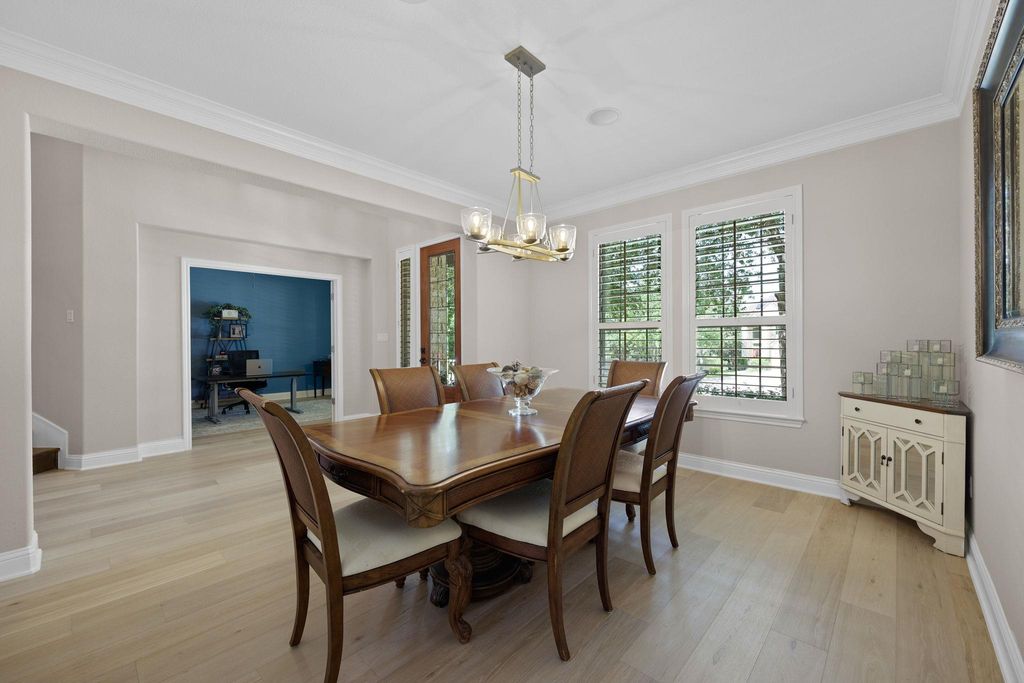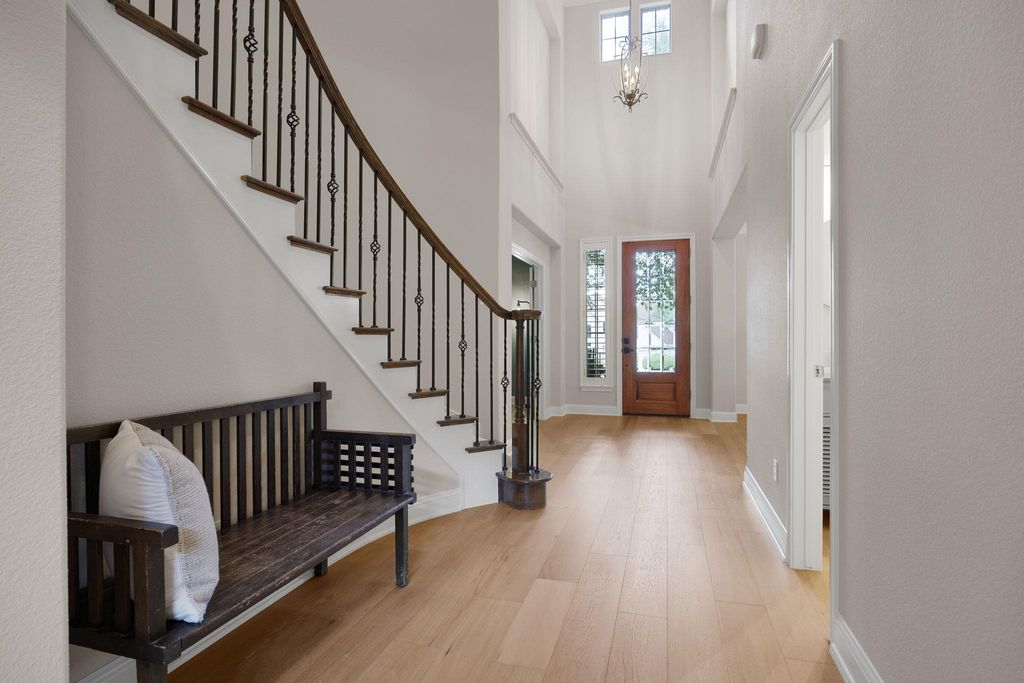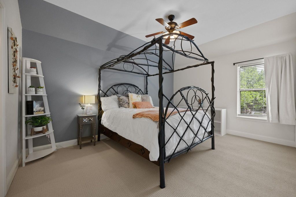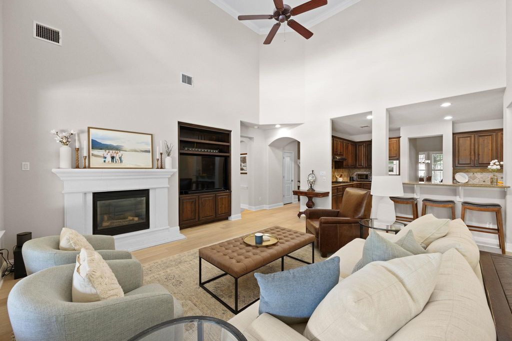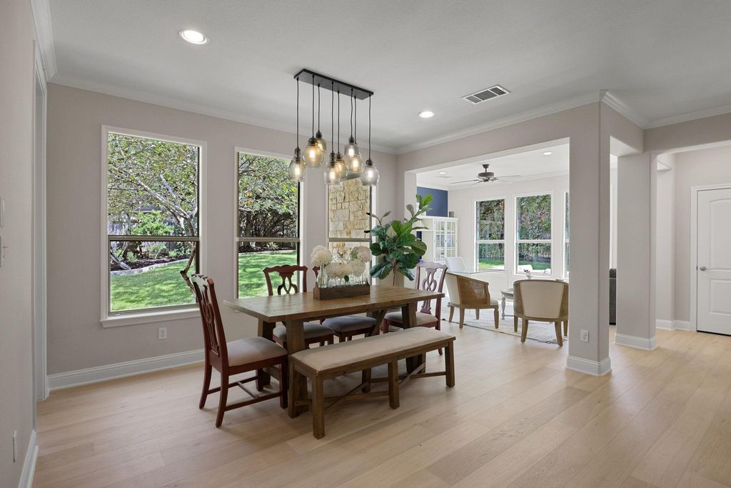 Situated on a quiet cul-de-sac in Steiner Ranch, 1313 Nova Court is a well-maintained 4-bedroom, 3.5-bathroom home designed for comfortable living and easy entertaining. The home includes a family room, den, formal parlor, game room, pool, spa, and outdoor kitchen. The main level features wood flooring throughout. The spacious family room has a gas log fireplace with a masonry surround, high ceilings, and large windows overlooking the patio and pool. The island kitchen includes granite countertops, a stone tile backsplash, a walk-in pantry, 42-inch upper cabinets, and a 9-foot ceiling. The breakfast area offers a pendant light fixture, recessed lighting, and crown molding. The parlor, with large windows facing the backyard, includes a ceiling fan, crown molding, and wood floors"”ideal for relaxing or hosting guests. The master bedroom features a 10-foot ceiling, a lighted ceiling fan, crown molding, and a walk-in closet. Its bathroom has a garden tub, a separate shower, dual vanity sinks, a private water closet, and a linen closet. The den, with direct garage access, includes two large closets, wood flooring, recessed lighting, a ceiling fan, and a window with 2-inch blinds. This flexible space can serve as an office or guest room. Upstairs, three bedrooms, each with walk-in closets and ceiling fans, provide ample space. The game room, with a high ceiling, lighted ceiling fan, and carpeting, is great games, movies, or hobbies. The backyard, backing to a greenbelt for privacy, features a nice mix of landscaping, a covered and uncovered patio, a pool, a spa, and an outdoor kitchen with a grill, cooktop, refrigerator, and sink. The home includes a two-car garage. It's zoned to Laura Welch Bush Elementary and Canyon Ridge Middle Schools, located within the neighborhood. Steiner Ranch has three community centers, the closest of which is Towne Square. The neighborhood also offers access to Lake Austin and more than 20 miles of hike & bike trails.