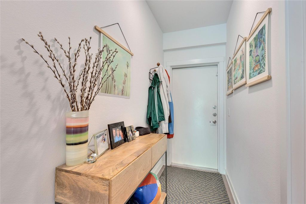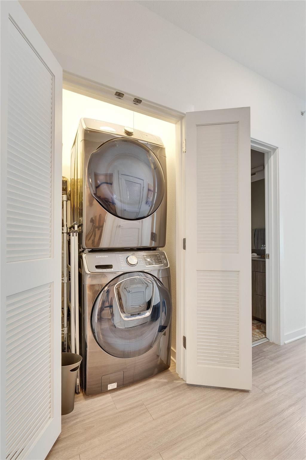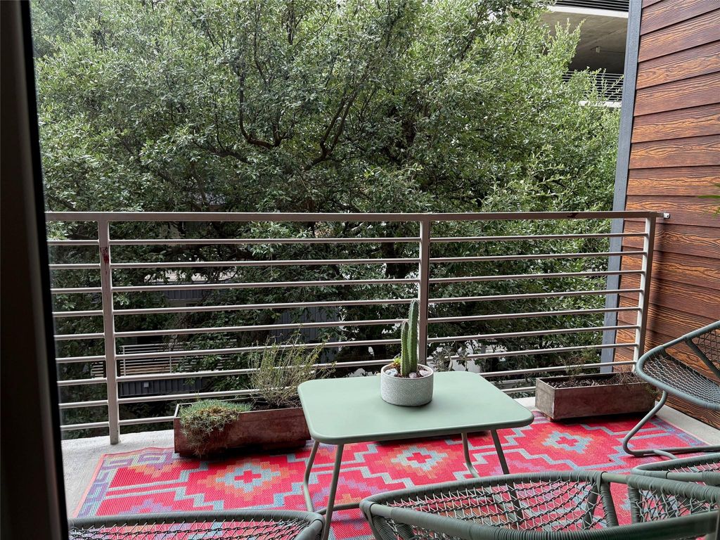 Rare Find - Stunning view of Live Oak Tree in the open-concept living space - feels like your own Treehouse! See VIRTUAL TOUR Link. ~ South facing patio is over 200 square feet with plenty of space for dinning and lounging at treetop. Your bird feeder will attract many visitors and patio flowers beckon hummingbirds. ~ Home is shielded from South Congress traffic noise as it's located 300 foot inside the community, facing into a wonderfully landscaped courtyard. Community courtyard has 2 gas grills, several large tables to share meals on, as well as seating areas by a charming gas fireplace. ~ Located in building 3 with only 35 units, and its own small parking garage, 2 Private Parking Spaces Included. ~ Includes large 6'W x 9'H x 13'D Storage Unit located at Level 1 parking garage. ~ Primary closet has a section of built in shelving, along with double rods to hang items high and low on 2 sides. ~ Enjoy large indoor community space with sink/refrigerator and lounging area. Tables can be used for remote work or for hosting events. ~ 1,200 square foot Gym which has ellipticals, treadmills, spin bikes, rowing machine as well as his and hers restrooms. Dumbbells, kettlebells, benches, and a universal strength training machine. A separate 1,200 square foot Yoga room with community mats, blocks, straps, and lighter free weights. ~ Samsung high efficiency washer with large capacity 4.5 cubic feet and X-large steam cycle dryer with 7.5 cubic feet capacity. ~ Window treatments include black out shades from the Shade Store. ~ Dimmer switches have been installed on all LED lights. ~ New garbage disposal, new dishwasher, and recent maintenance on the A/C Unit. ~ Ride bikes from Public Lofts to the hike and bike trail in under 15 minutes. There are two routes with light traffic, either coasting downhill on south 5th or near St. Edward's University. Living room ceiling fan and drapes in all rooms are not included (do not convey in a sale).
